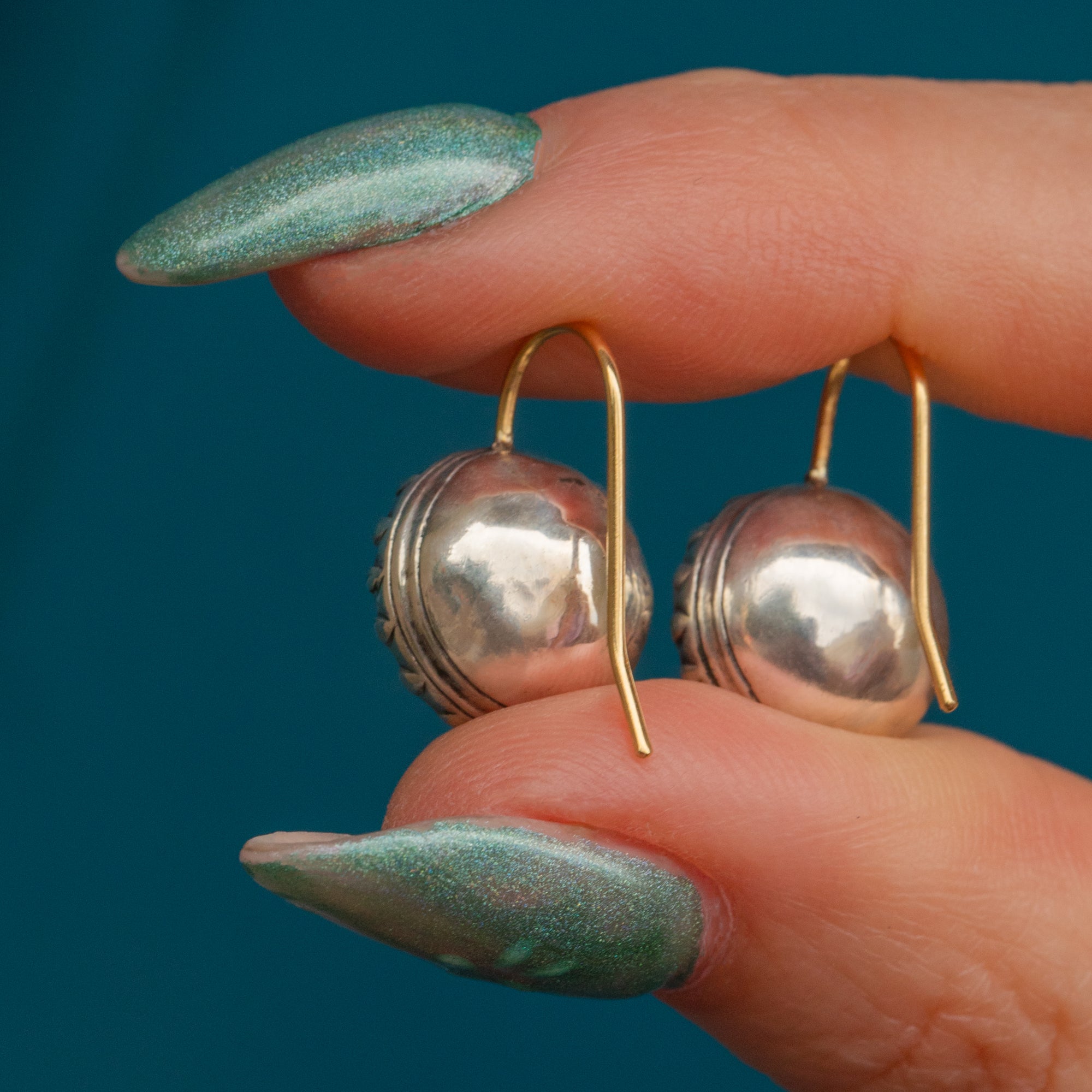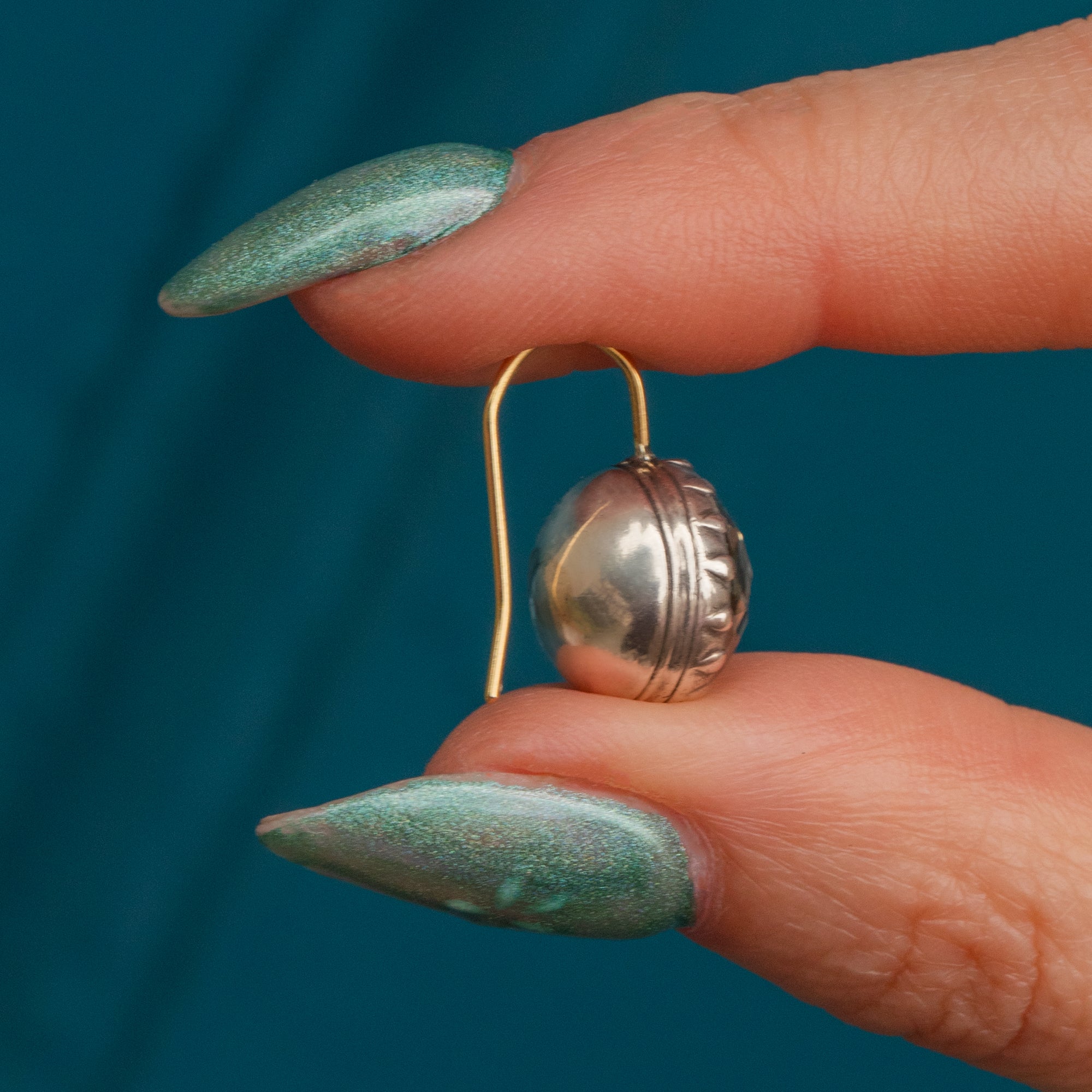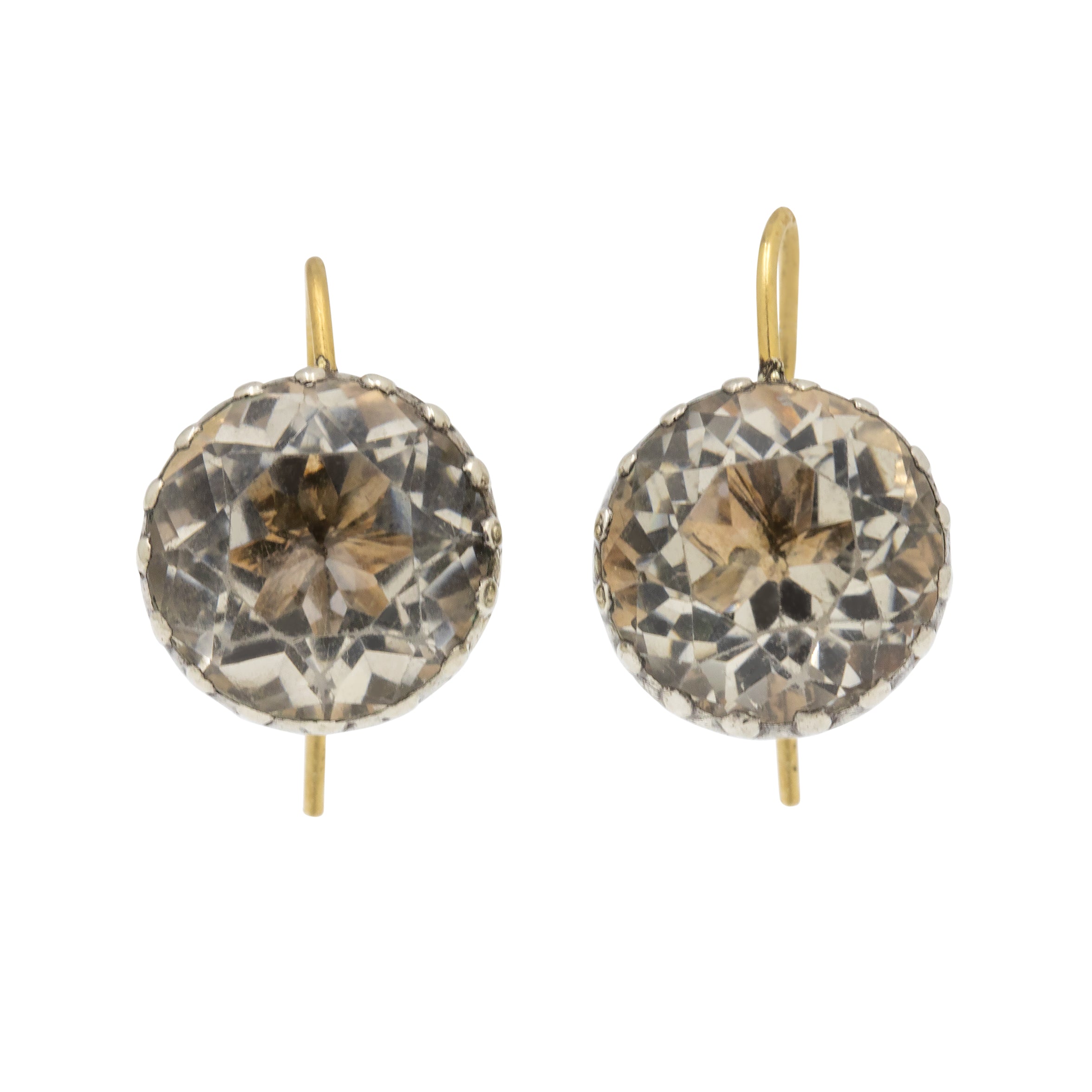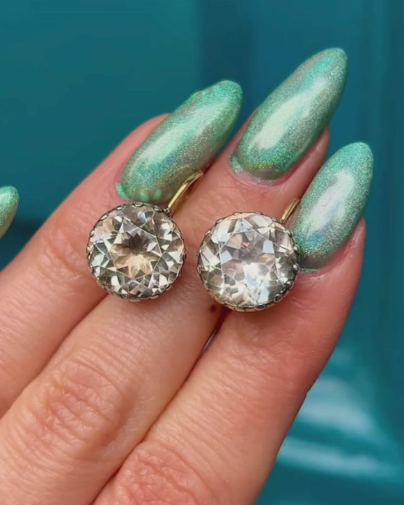 VERY GOOD. These antique Rock Crystal button earrings are in very good condition! The Rock Crystals are secure within their settings and have mesmerising sparkle. There is some wear to the facets, but nothing untoward. To the back at the centre there is some wear from a previous conversion, however the Silver has a bright lustre and the 18ct Gold hooks hold goof form.