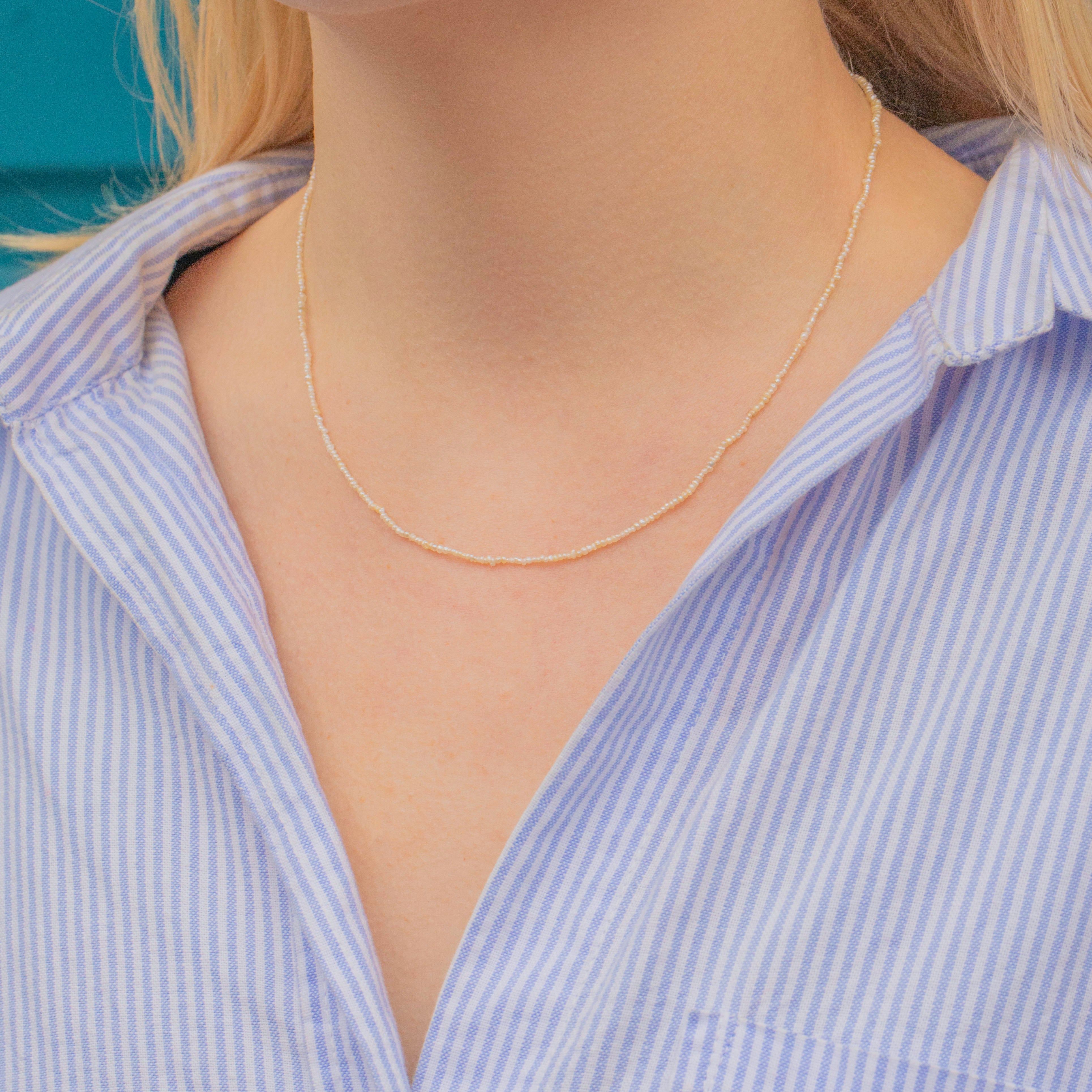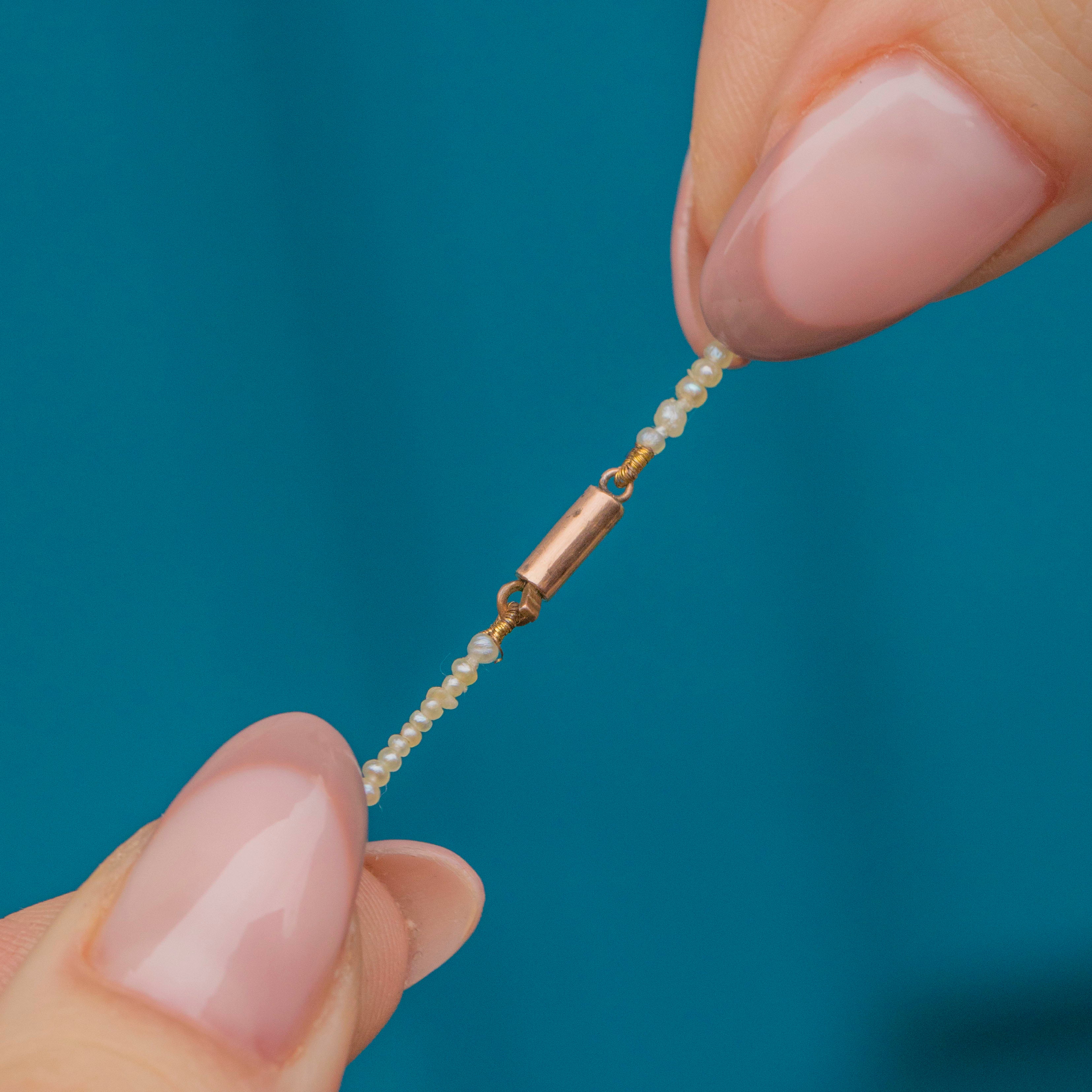 VERY GOOD. This antique Seed Pearl strand necklace is in very good condition overall. This piece is delicate in nature, and like most antique pieces, should be worn with care. The Seed Pearls have all been delicately strung, and the necklace closes with a 9ct barrel clasp, which shuts securely. The Seed Pearls have a gorgeous shine and only near the metal wire ends is there some slight discolouration!