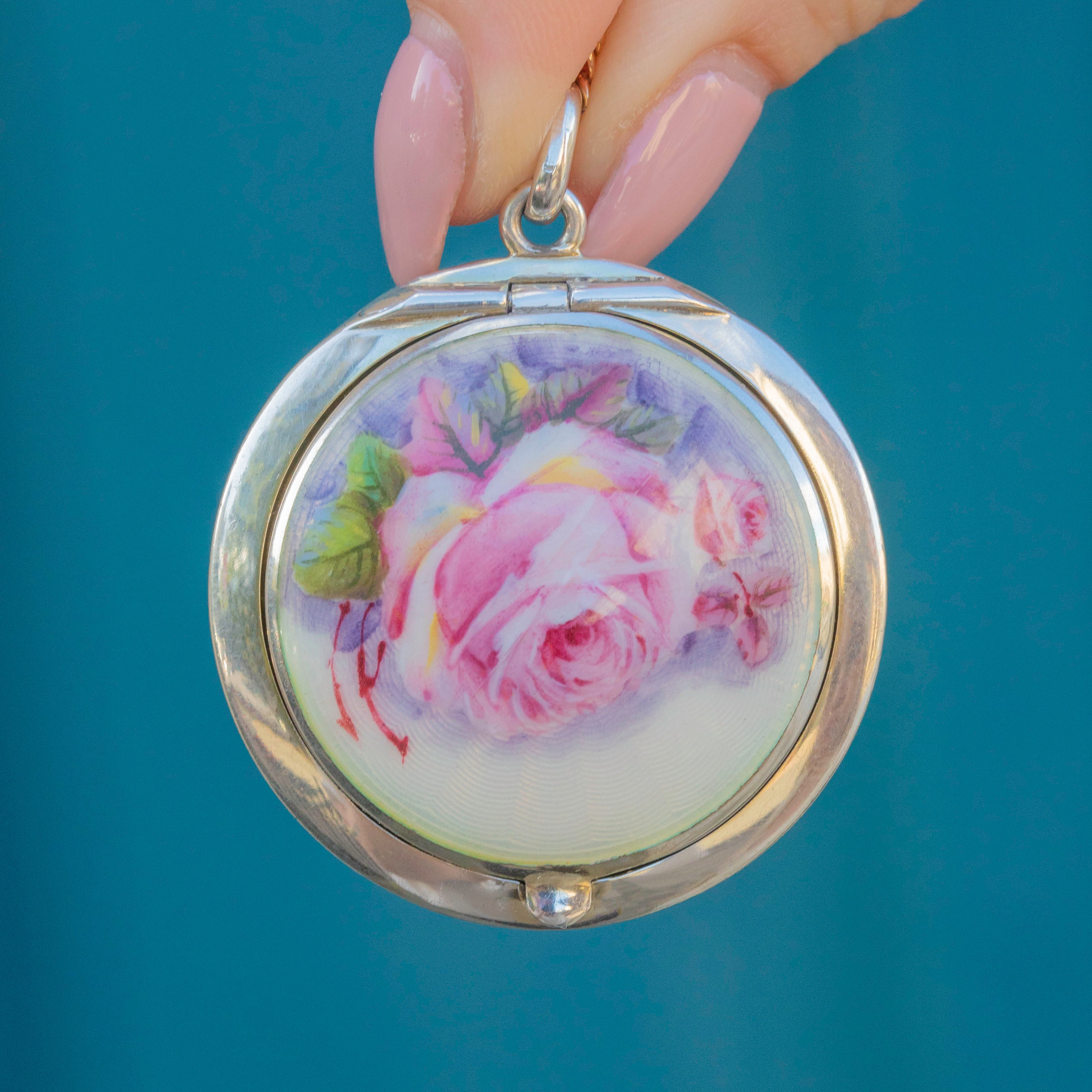 The front of the piece is adorned with a skillfully painted Guilloché Enamel rose with a soft colour palette that perfectly captures the romanticism of the Edwardian era. Showcasing meticulous craftsmanship and beautifully preserved, this antique Guilloché locket will make a fine sentimental gift choice or lovely treat for yourself!