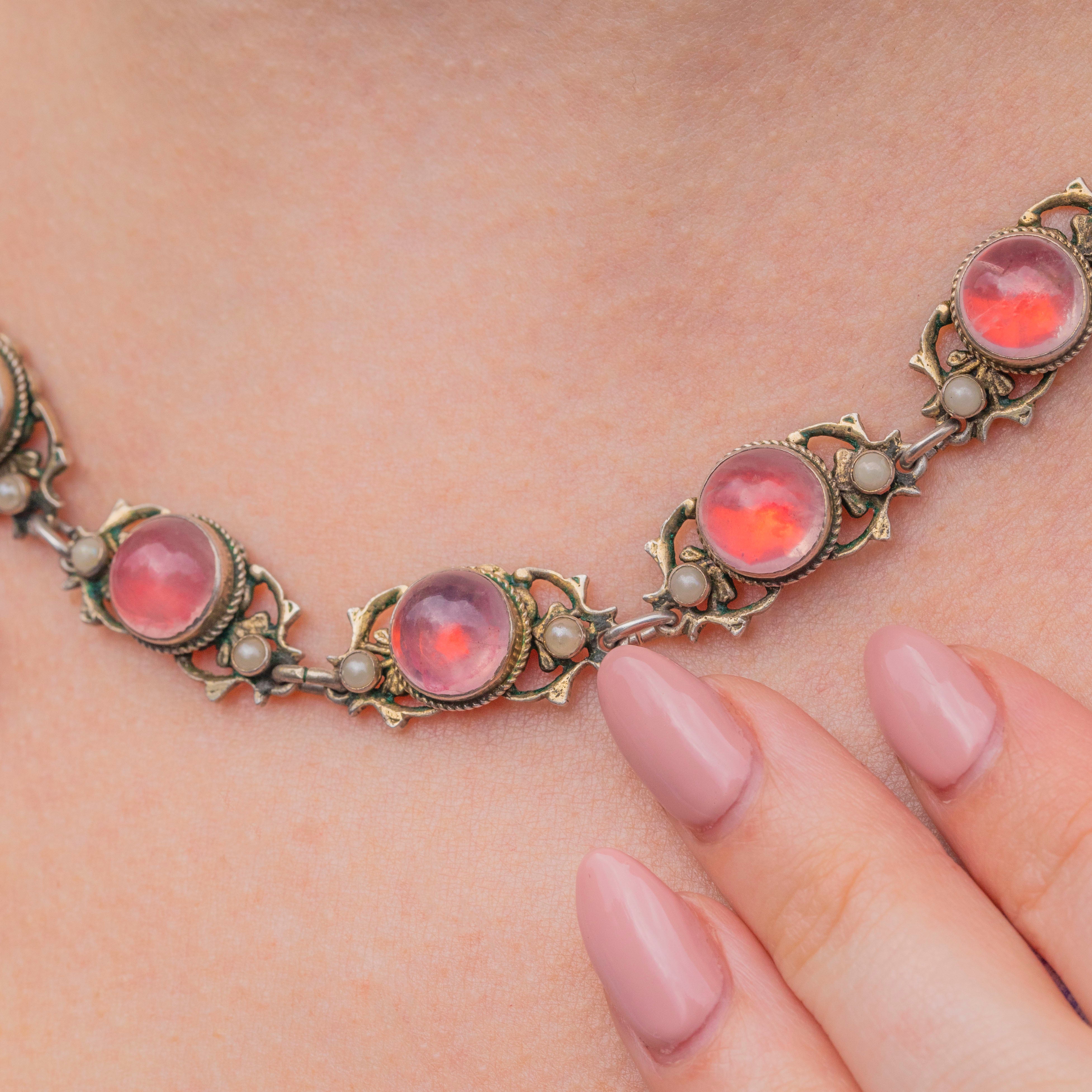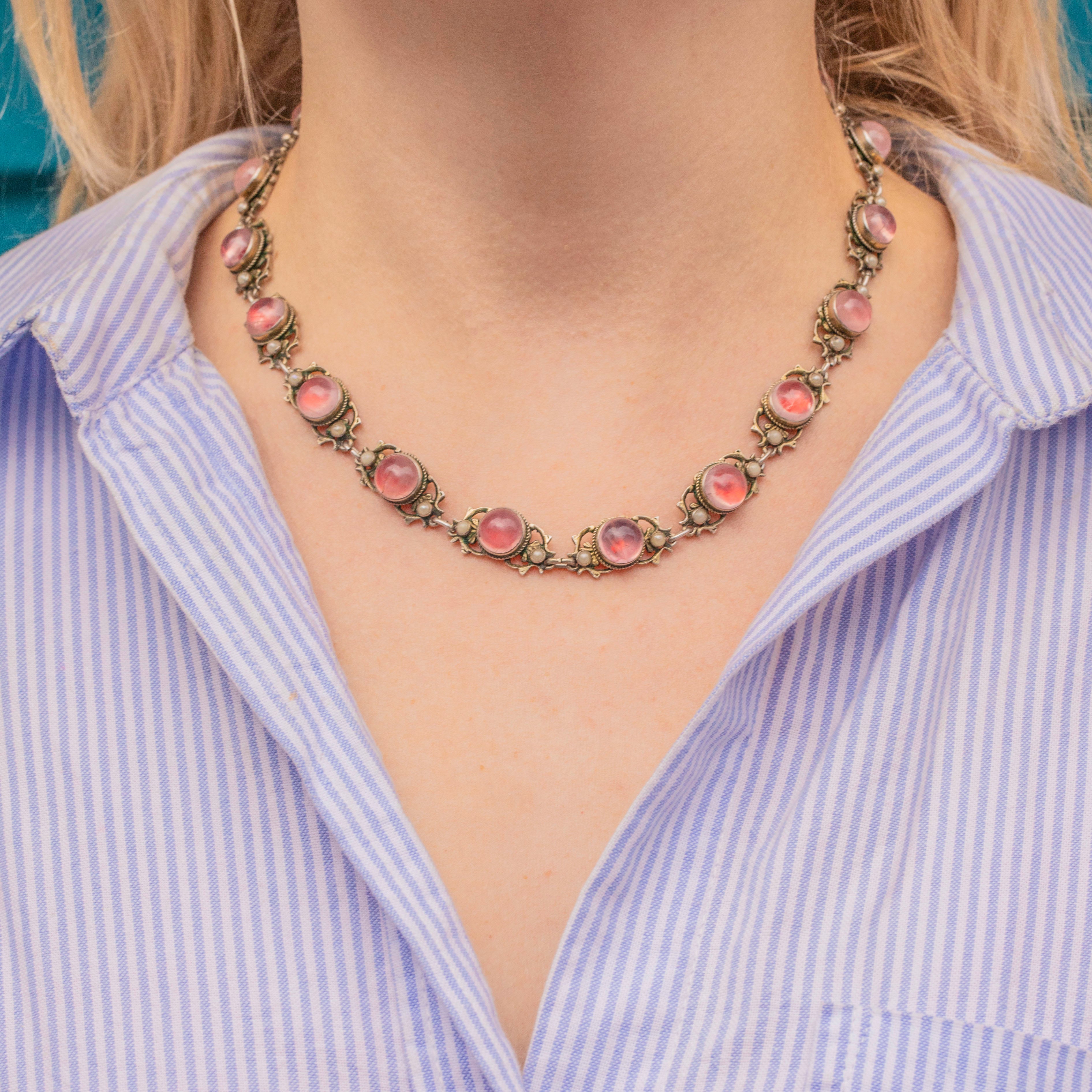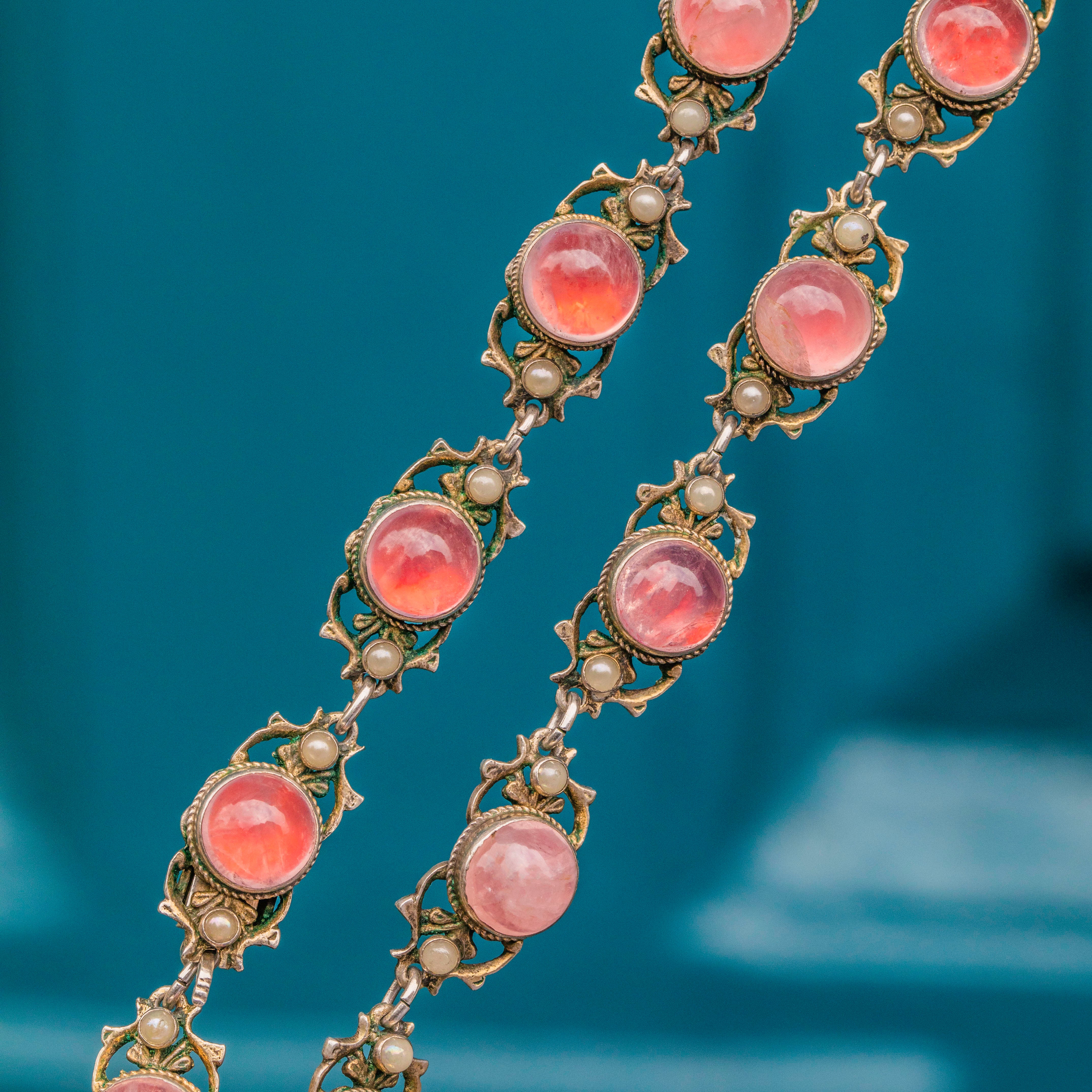 This outstanding Austro-Hungarian foiled Rose Quartz necklace will instantly bring the wow factor to your outfit! Exquisitely crafted, this rare historic necklace boasts immaculately preserved Rose Quartz cabochons, each one foiled to emphasise their shimmering jammy and blush hues, flanked by iridescent natural seed Pearls.