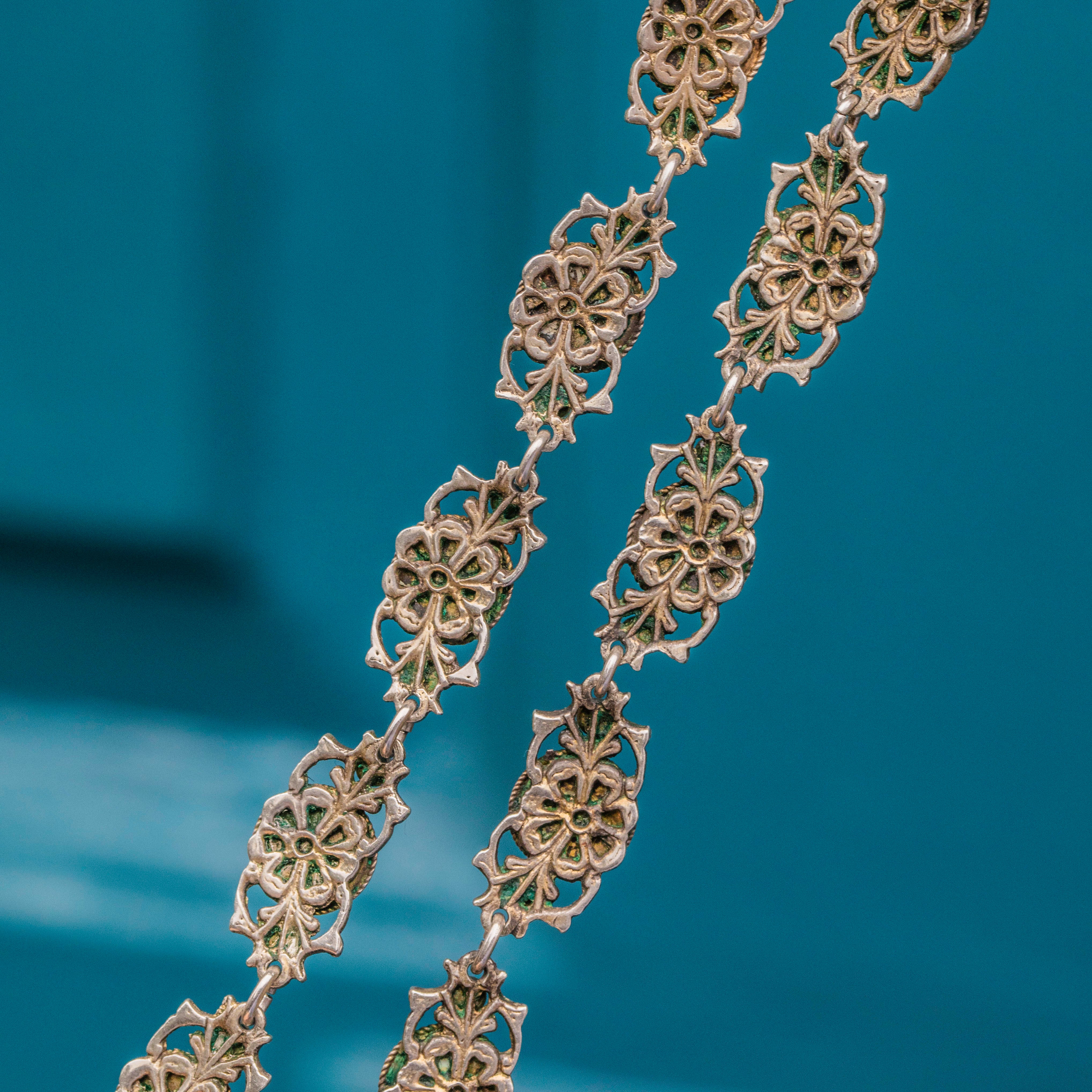 The ornately formed Silver brings a unique edge to this magnificent piece, with the dark patina creating a dramatic contrast against the vibrant gemstones adding to her enchanting allure. At the perfect length of 17", this antique Rose Quartz necklace will rest elegantly across your collarbones making a statement wherever she goes!