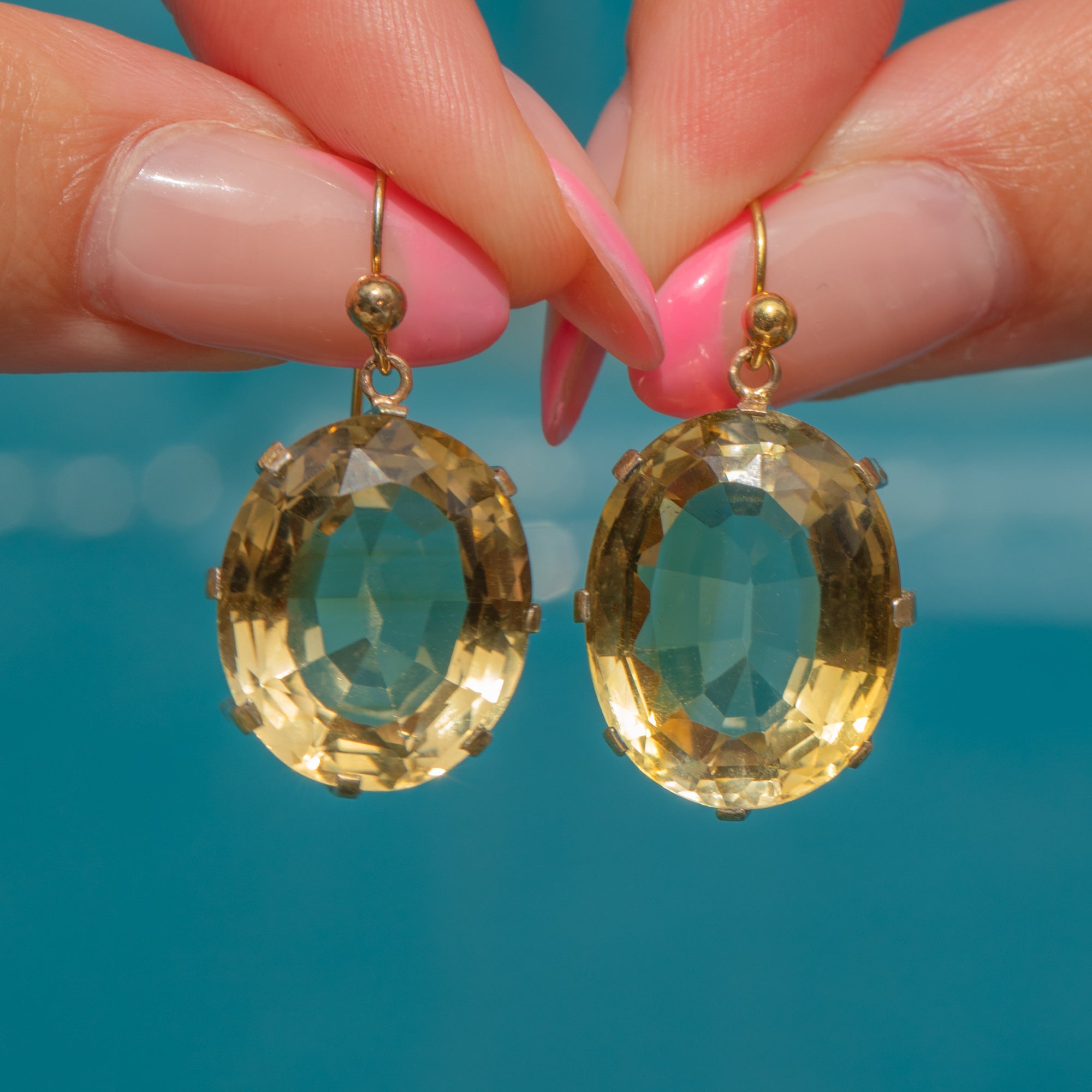 A scrumptious pair of antique Silver Gilt Citrine earrings! The elegant oval Citrines, boasting a combined weight of 13.00ct, shimmer with syrupy hues. The faceted Citrines are secured with buttery Gold gilded Silver open settings, allowing the light to flood through from every angle.