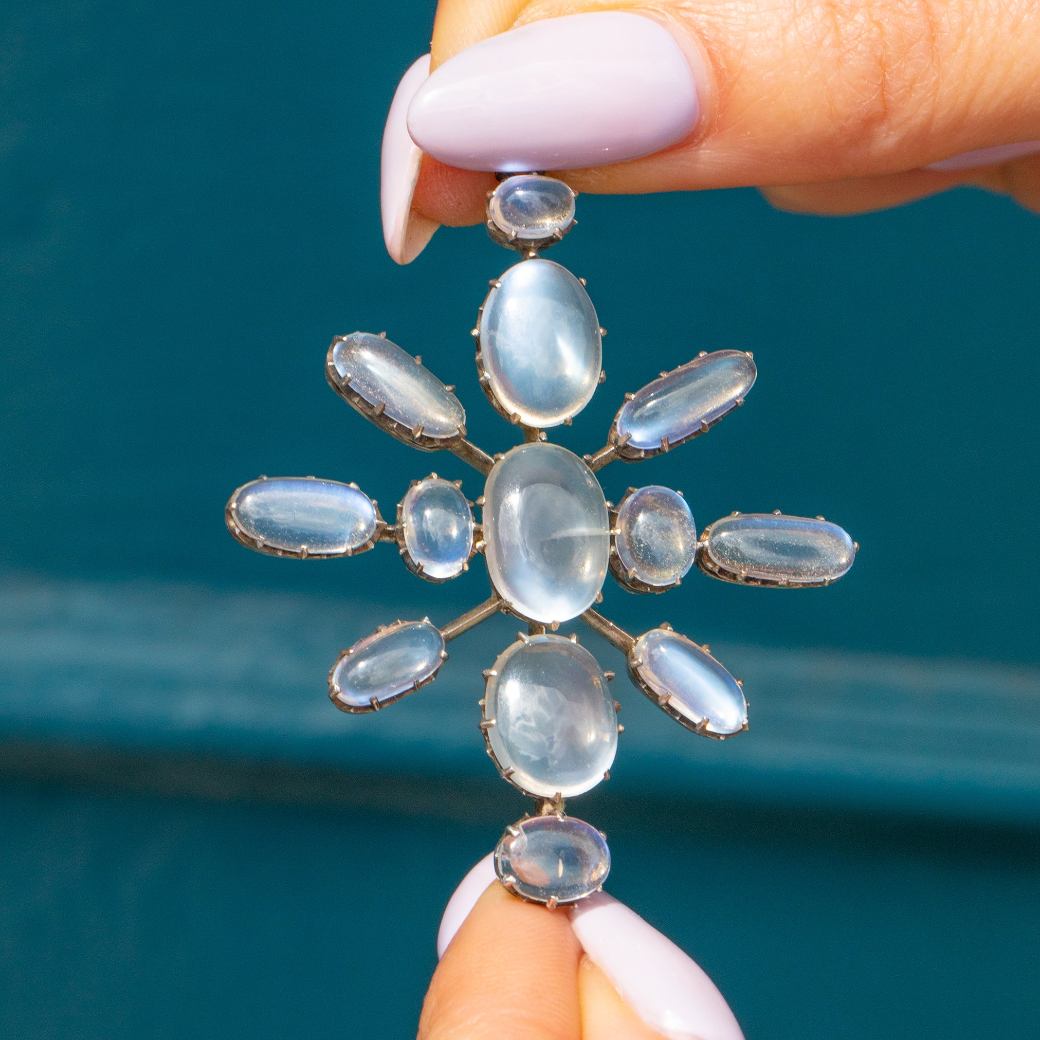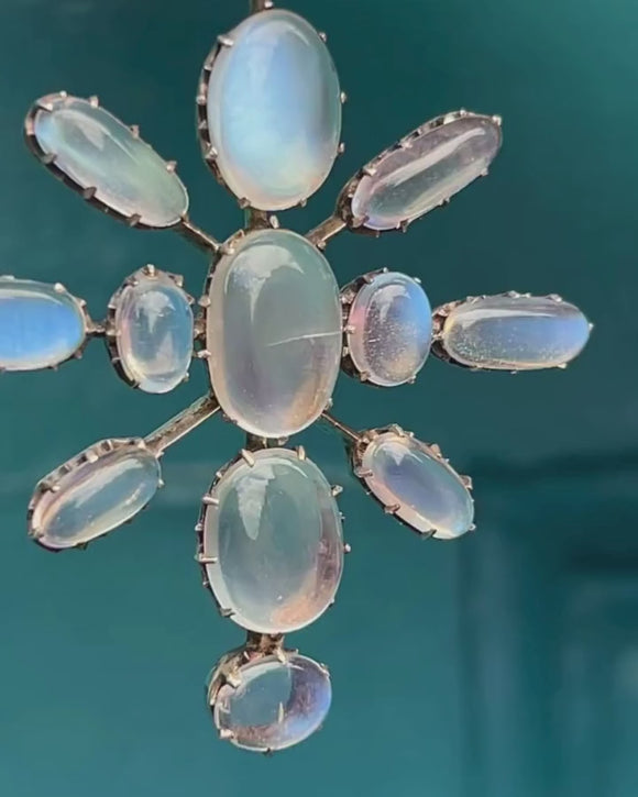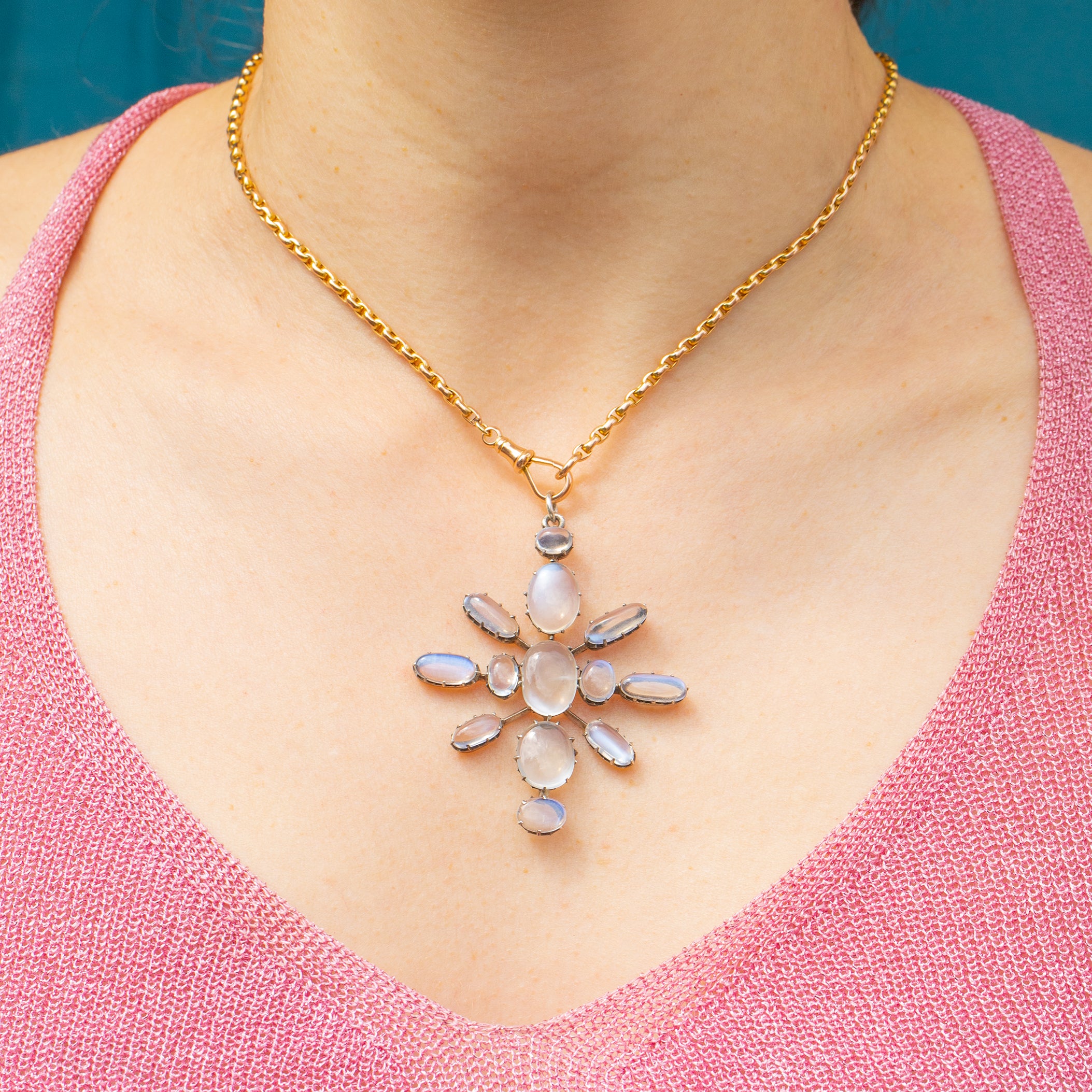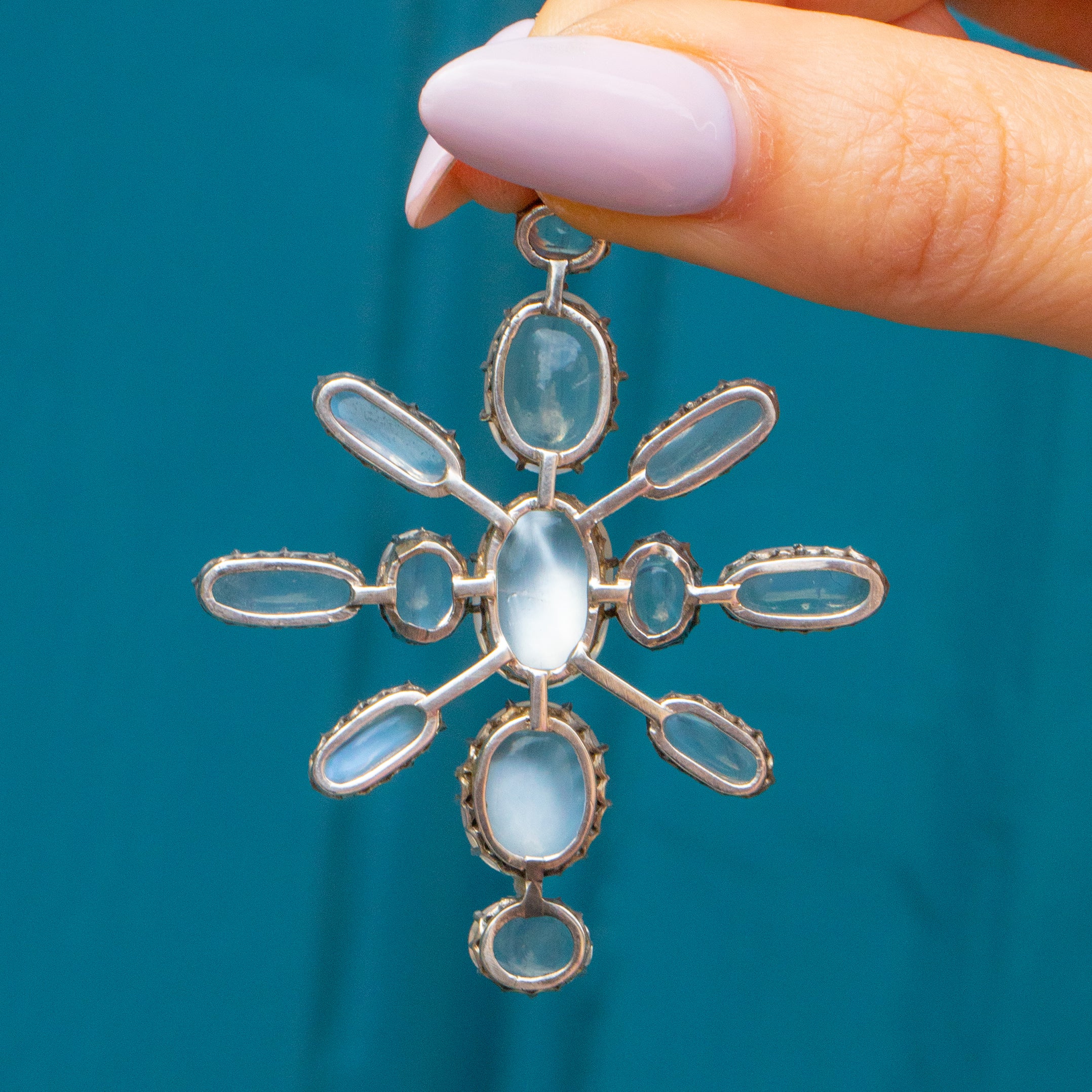 Smooth Moonstone cabochons, with a combined carat weight of 10.65ct, adorn every angle of this cruciform or starburst motif antique Moonstone cross pendant. The soft blue schiller of Ceylon Moonstones billow across your décolletage....