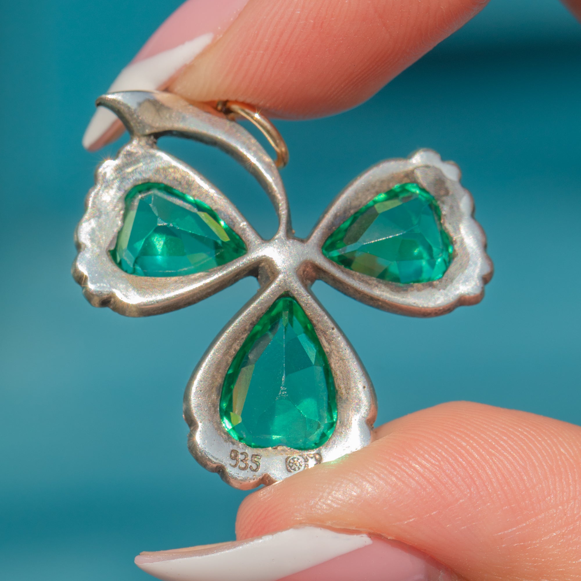 A beautiful Victorian shamrock pendant crafted in Silver and set with glittering Paste gemstones. The leaves of the shamrock are formed from vibrant Green Paste stones, while the stem and accents sparkle with White Paste that graduates in size for added brilliance.