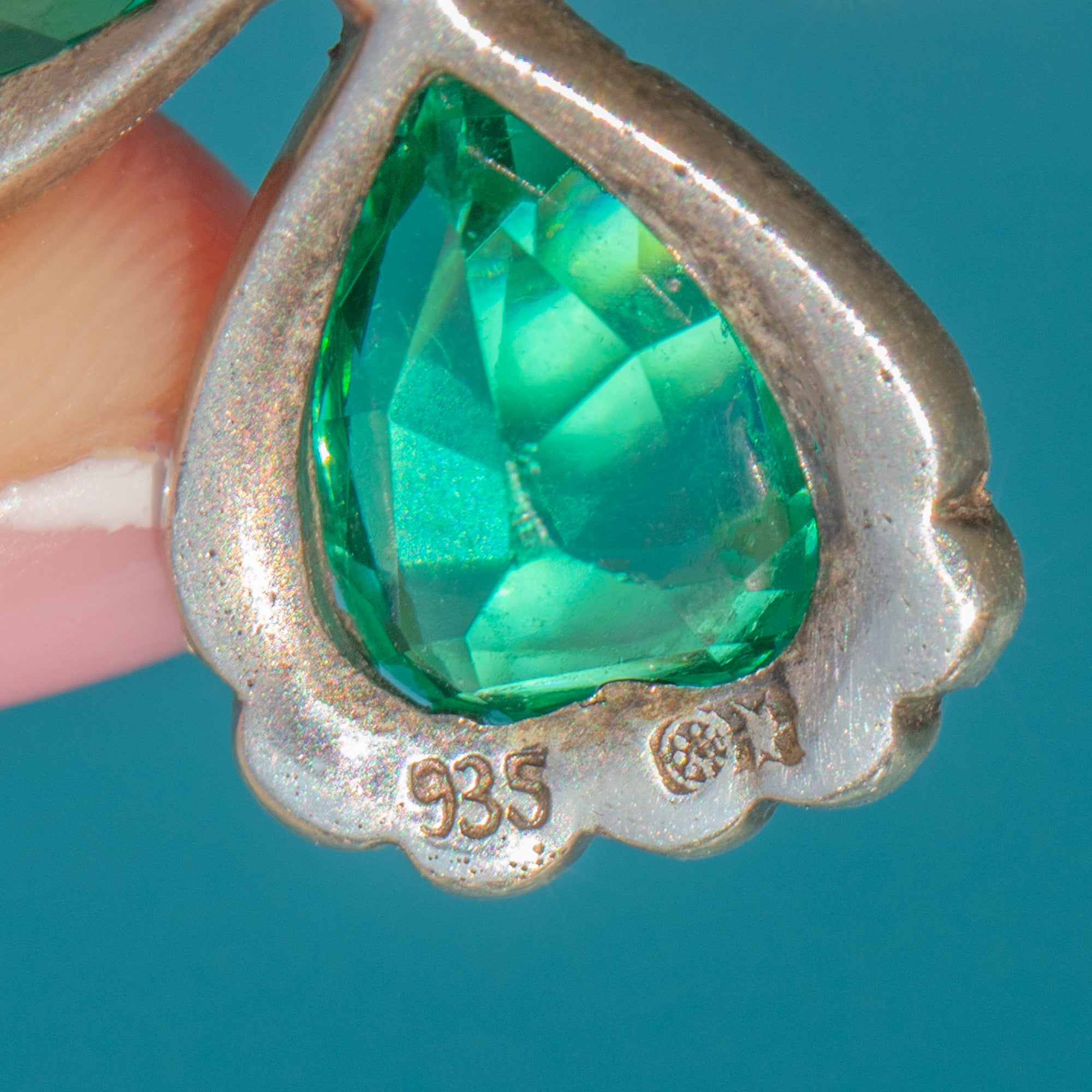 EXCELLENT: Both the Green and White Paste stones are bright and securely set with no chips or damage. The engraved Silver setting is in superb condition, and the brooch has been very well cared for.