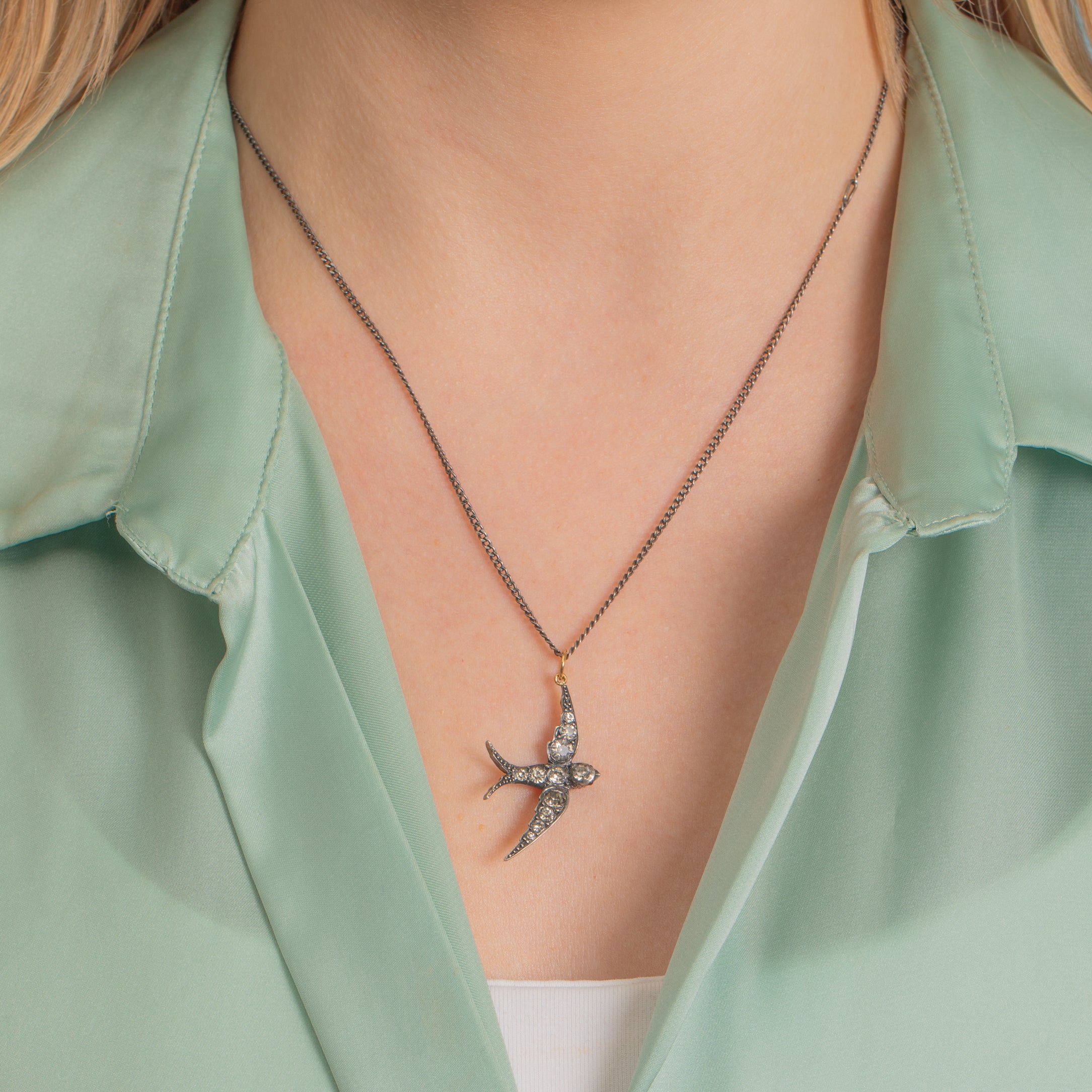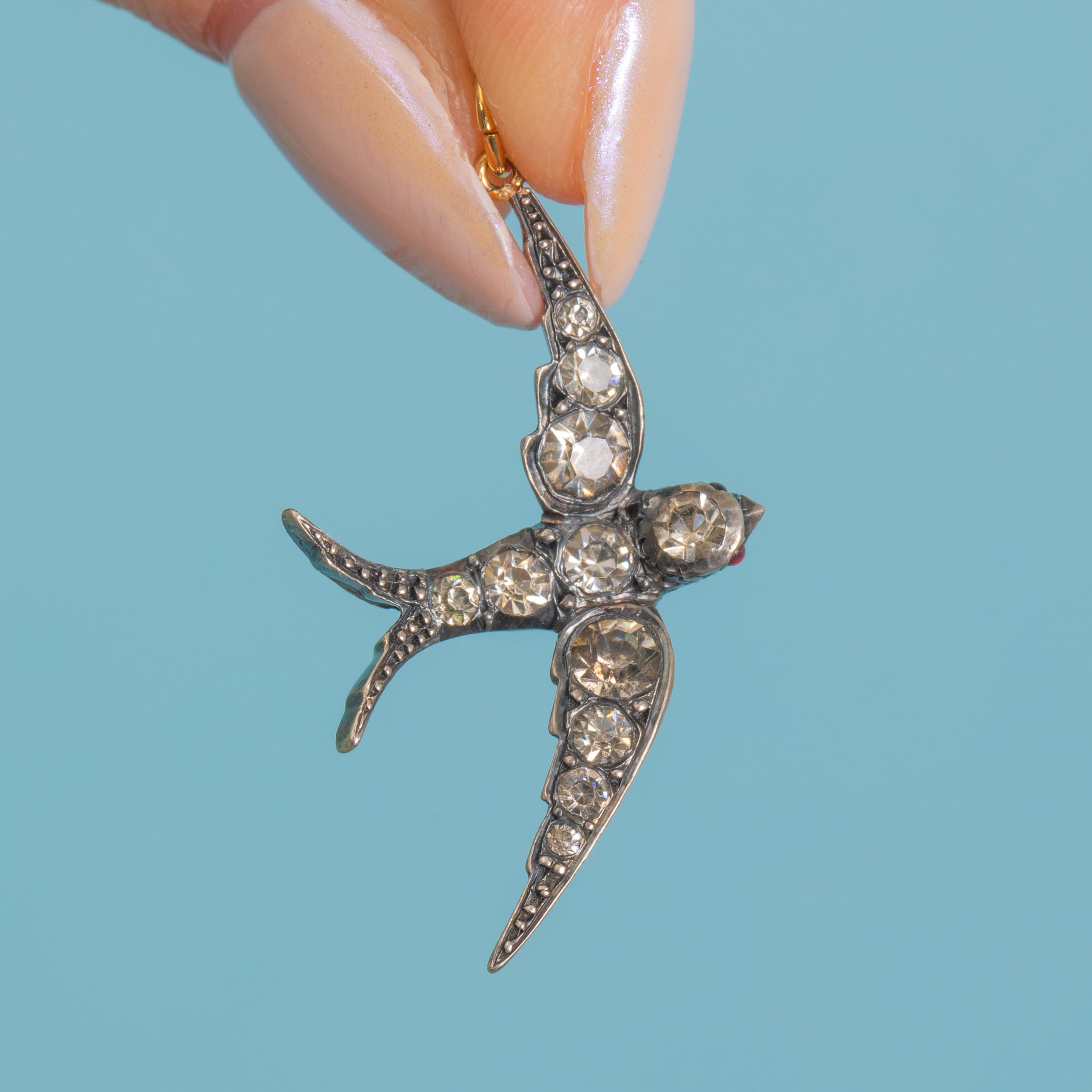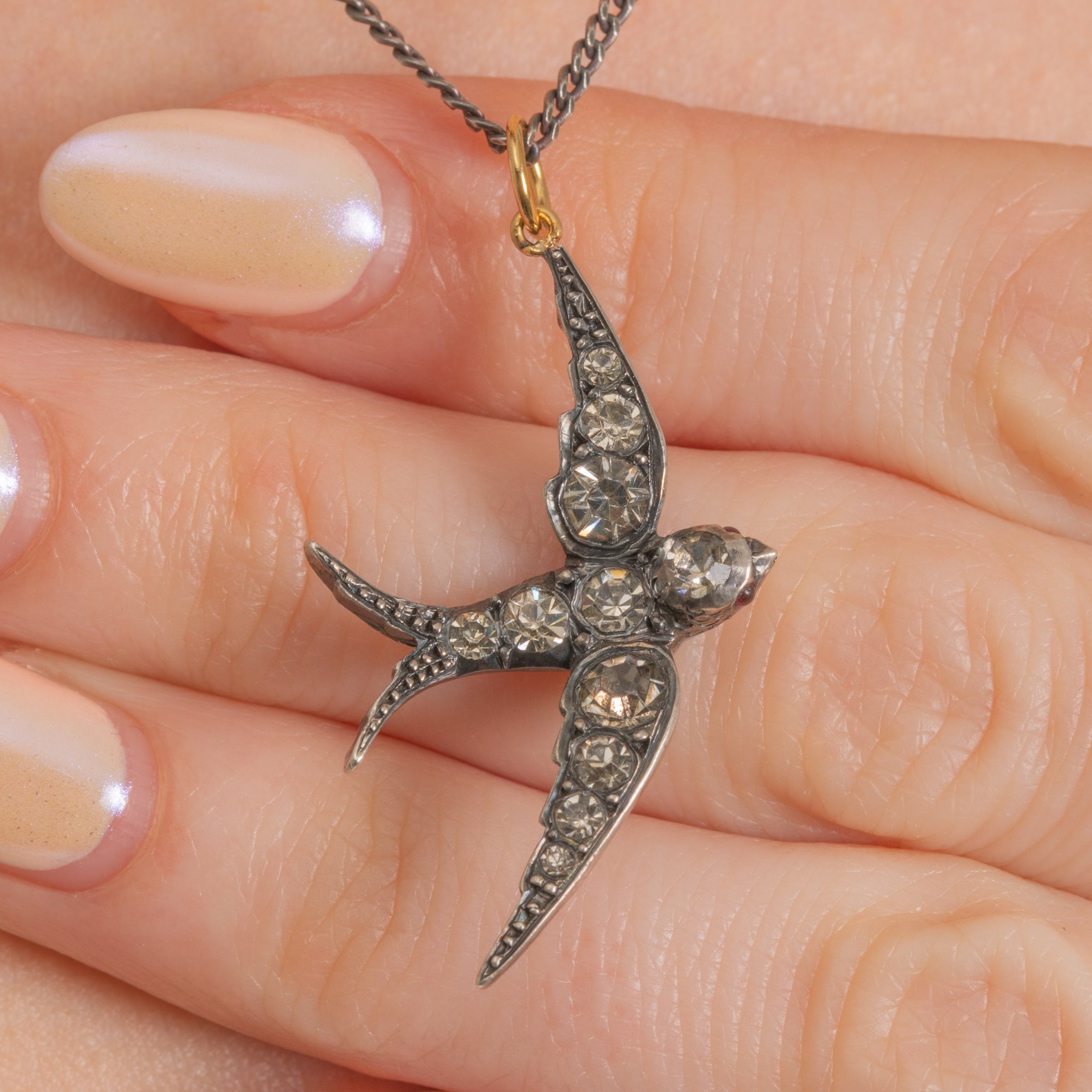 VERY GOOD. This antique Silver Paste swallow pendant is in very good condition. The Silver has accrued a lovely, moody patina adding to its antique charm and creating bold contrast against the Diamond Paste. The Paste are all present and securely set, free from surface wear. The pendant has some general age-related wear throughout, as to be expected from a piece over 100 years old, but has lasted remarkably well and promises many more years of enjoyment!