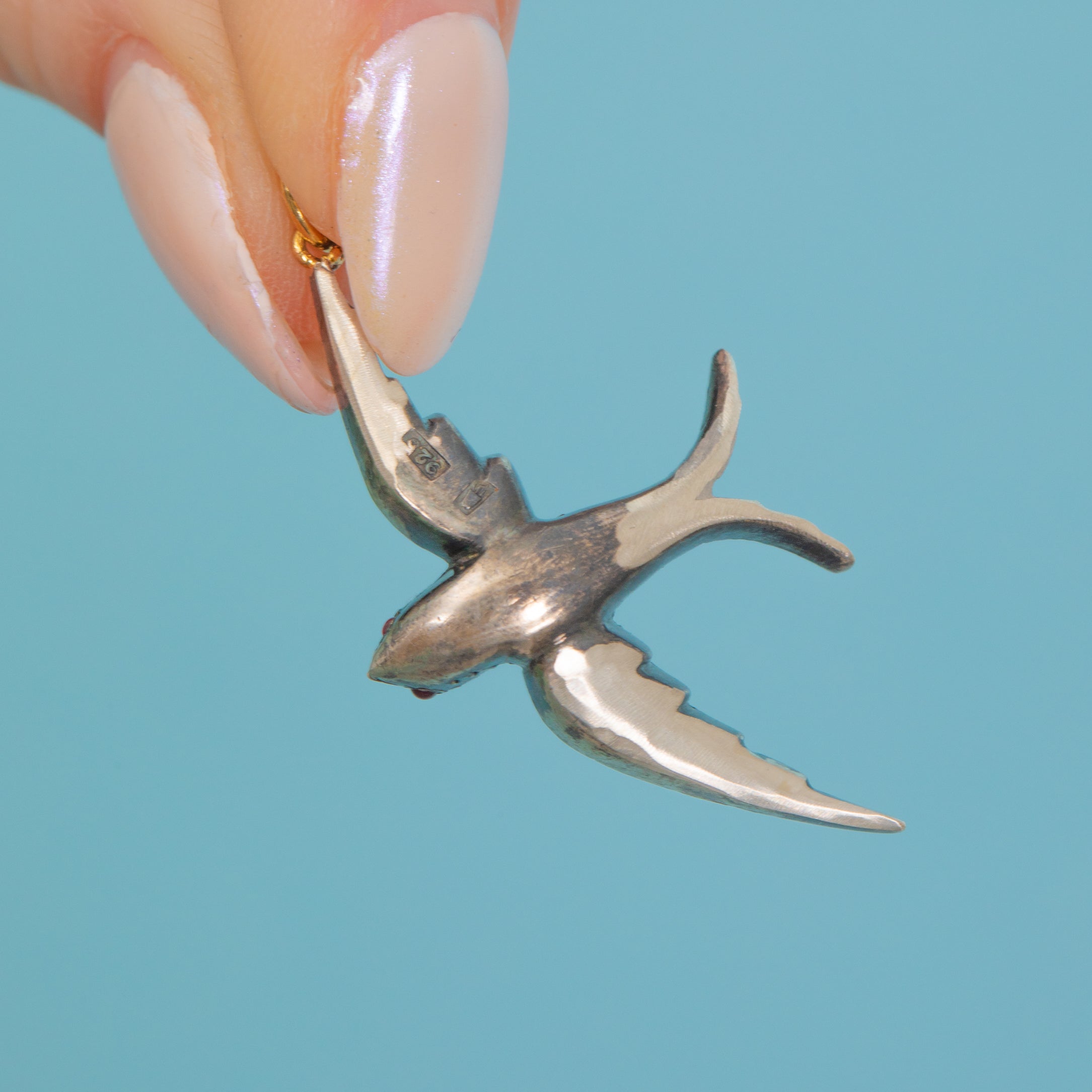 Beautifully formed, this Victorian swallow pendant is bursting with personality, with softly glinting red Paste eyes adding to its character. Once suspended from a fine chain, this sweet bird will appear as though she is swooping across your décolletage!