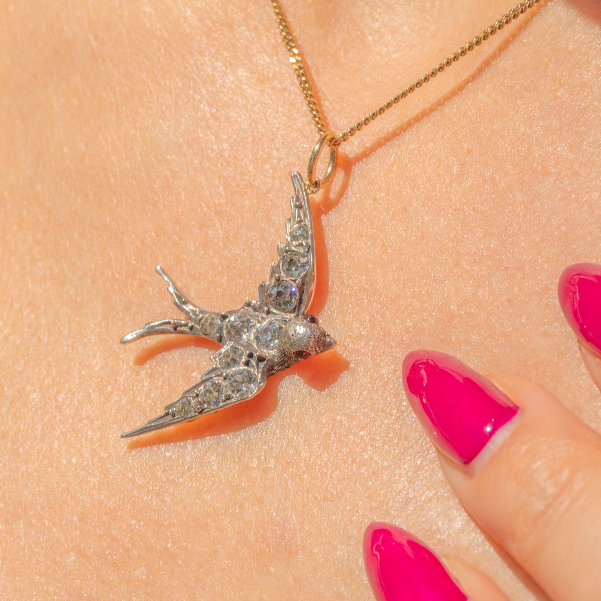 EXCELLENT: The Silver is bright and the Paste are all securely set, with no signs of dulling over the years! Complete with a soldered 9ct Gold jump ring, you can wear this antique swallow pendant with absolute confidence!