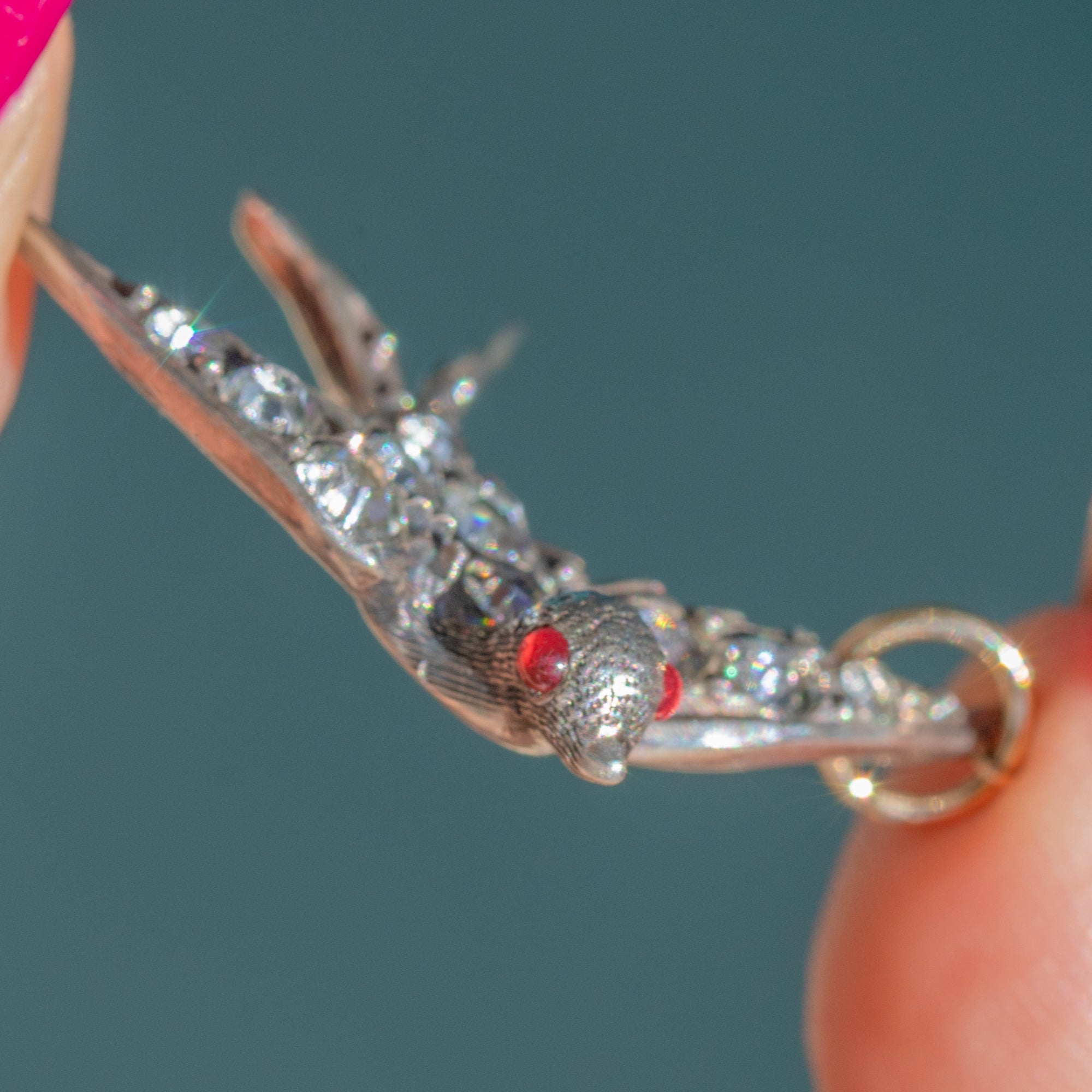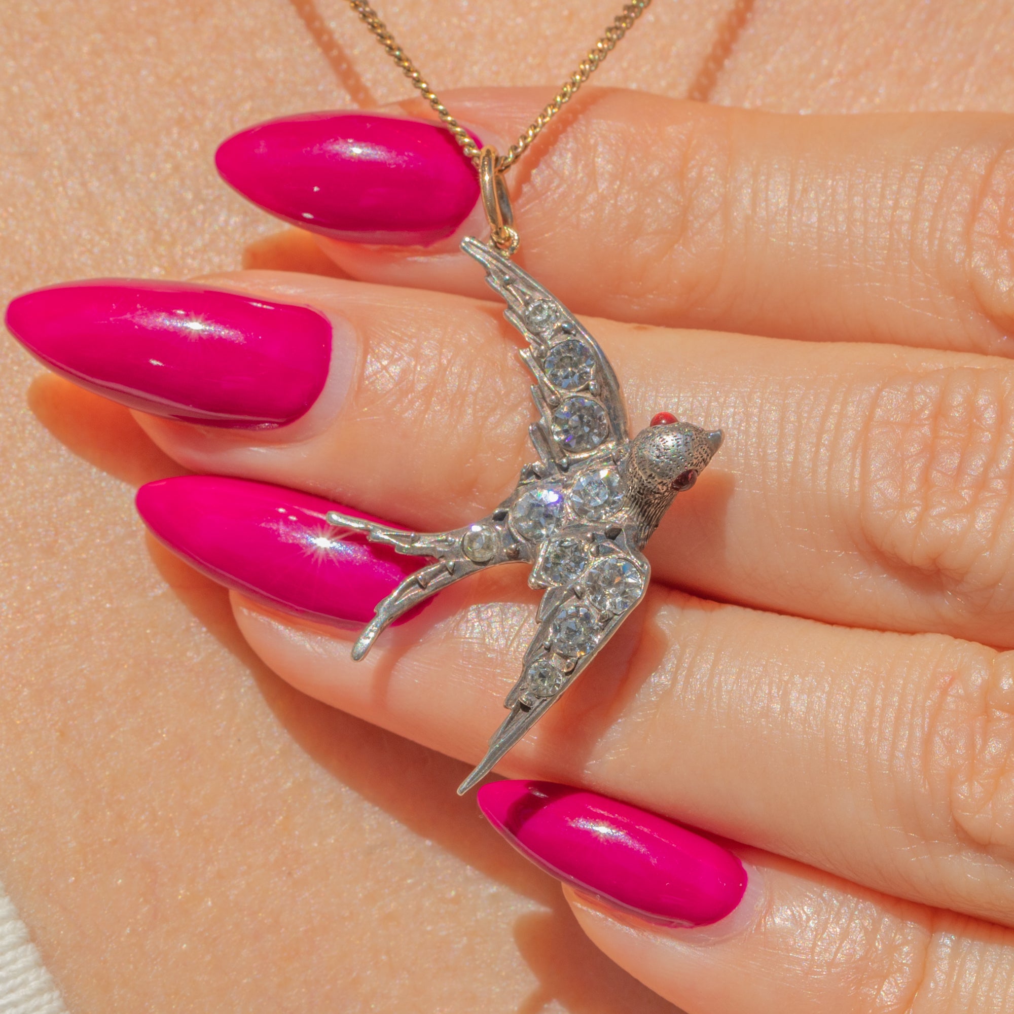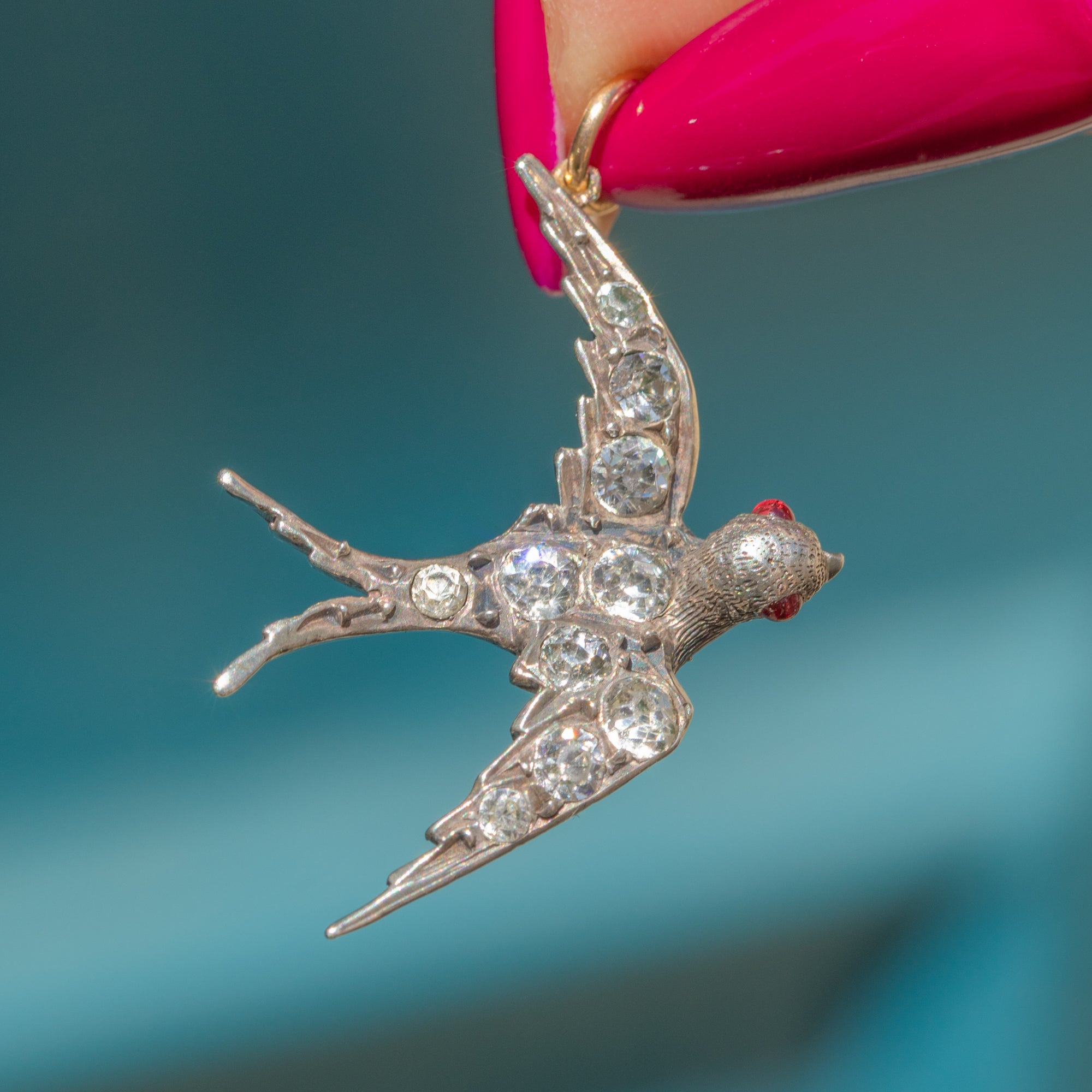 Crafted from lustrous Silver and inlaid with scintillating Diamond Paste, the swallow has gorgeous details throughout, complete with glowing Ruby Paste eyes bringing it to life!