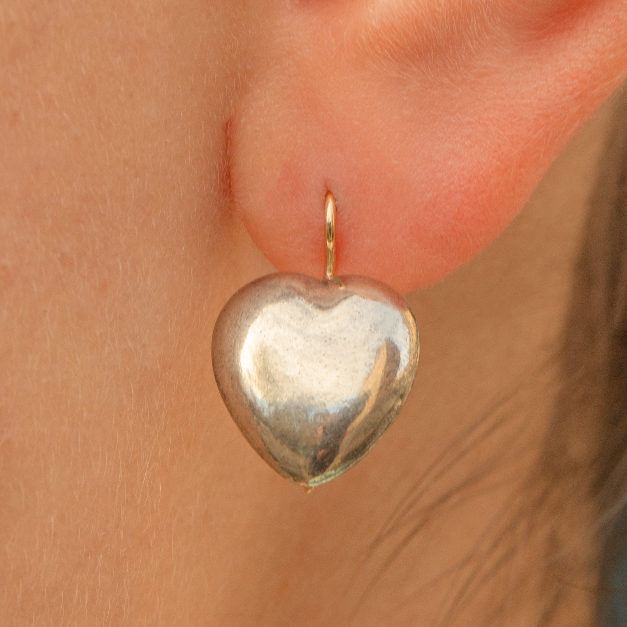 アンティークシルバー パフィーハートイヤリング - 15ct ゴールドフレンチフック