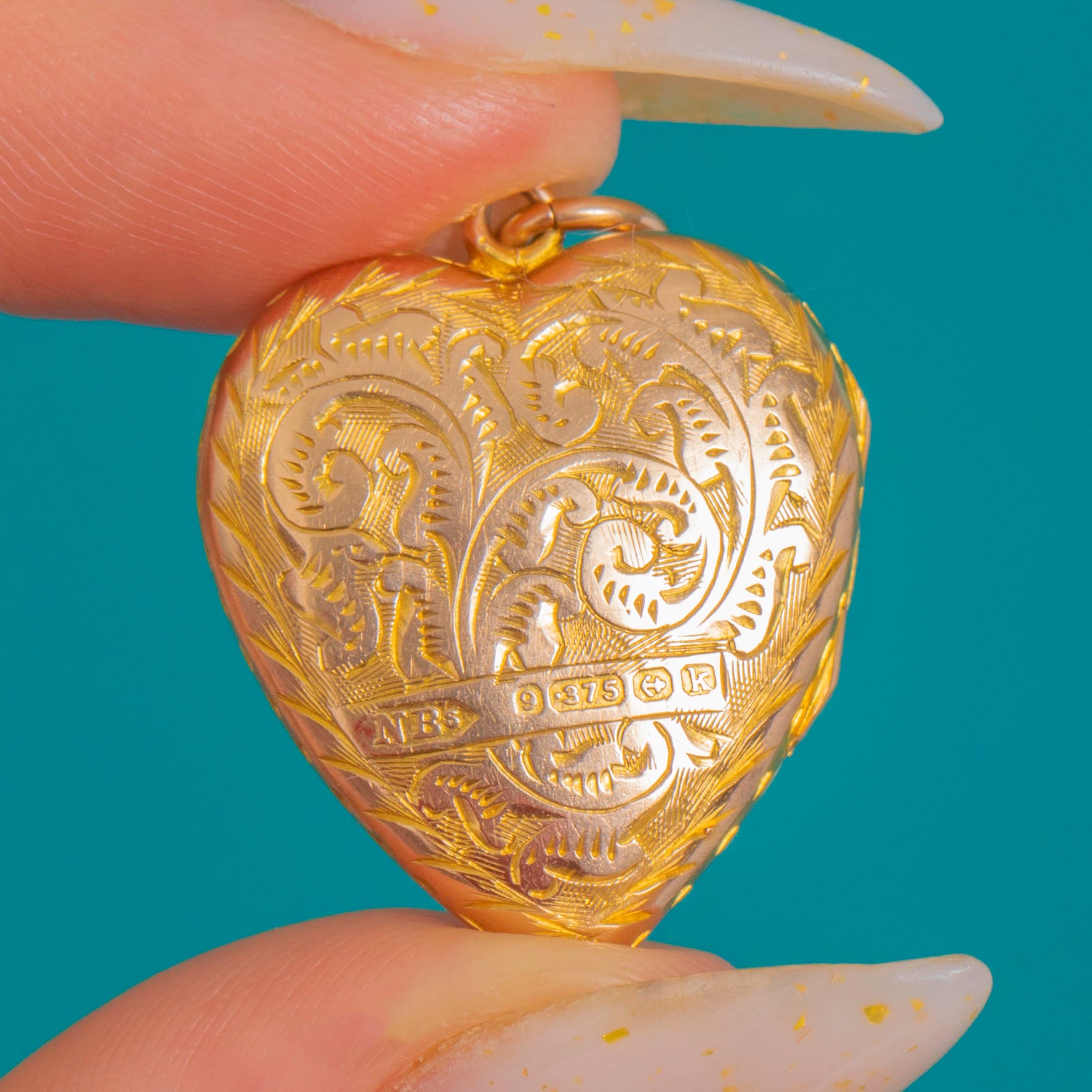 A romantic Edwardian treasure, this puffy heart locket is crafted in glowing 9ct Gold and richly chased with scrolling foliage over an engine‑turned ground. A rope‑style border frames the heart, while a smooth central cartouche invites a personal monogram or date.