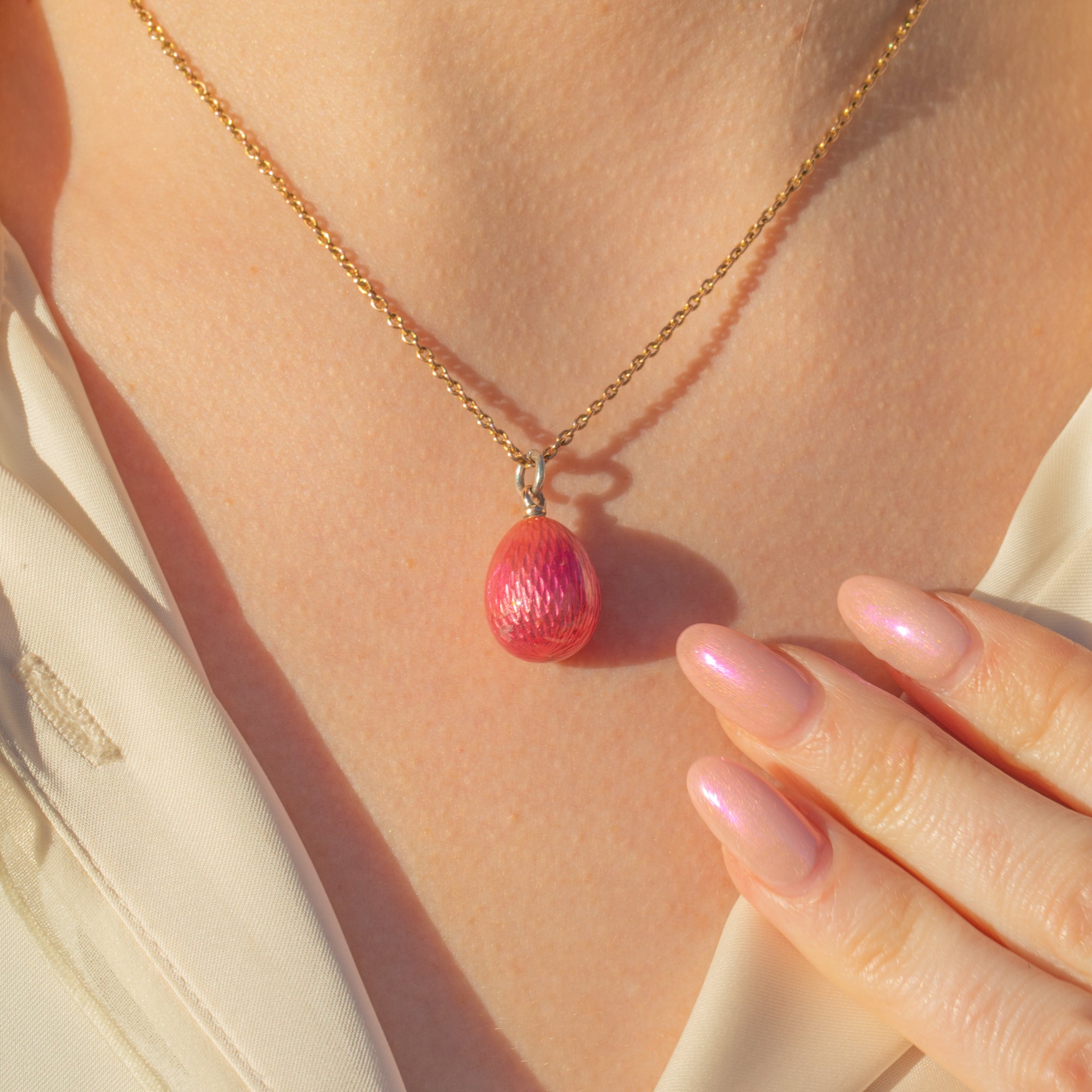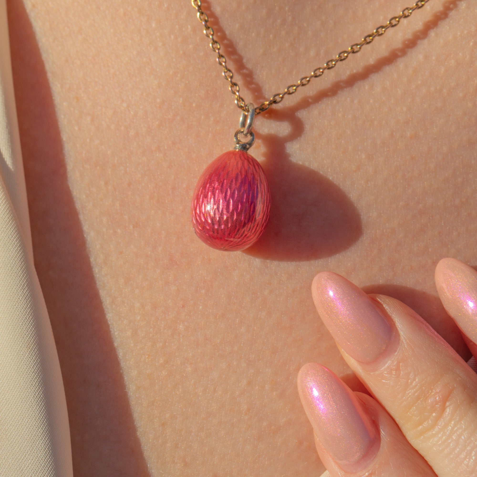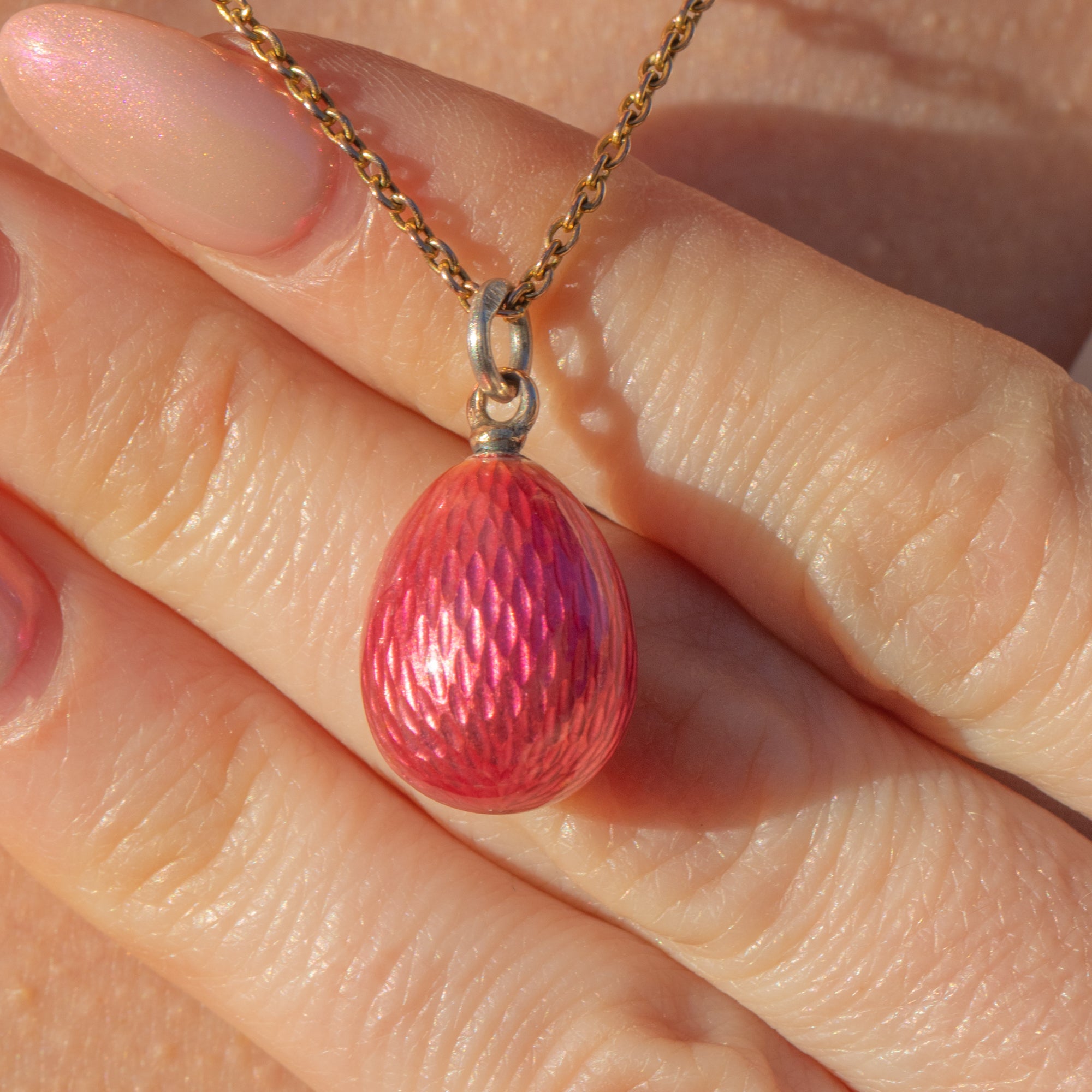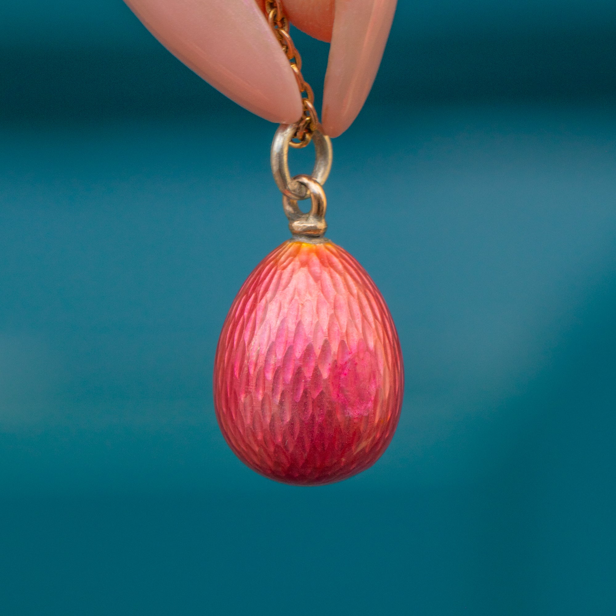 Crafted circa 1910, it was the Faberge egg pendants of the late 19th century that spurred a wave of intrigue around these little charming pieces, and this pink treasure is a fine example.
