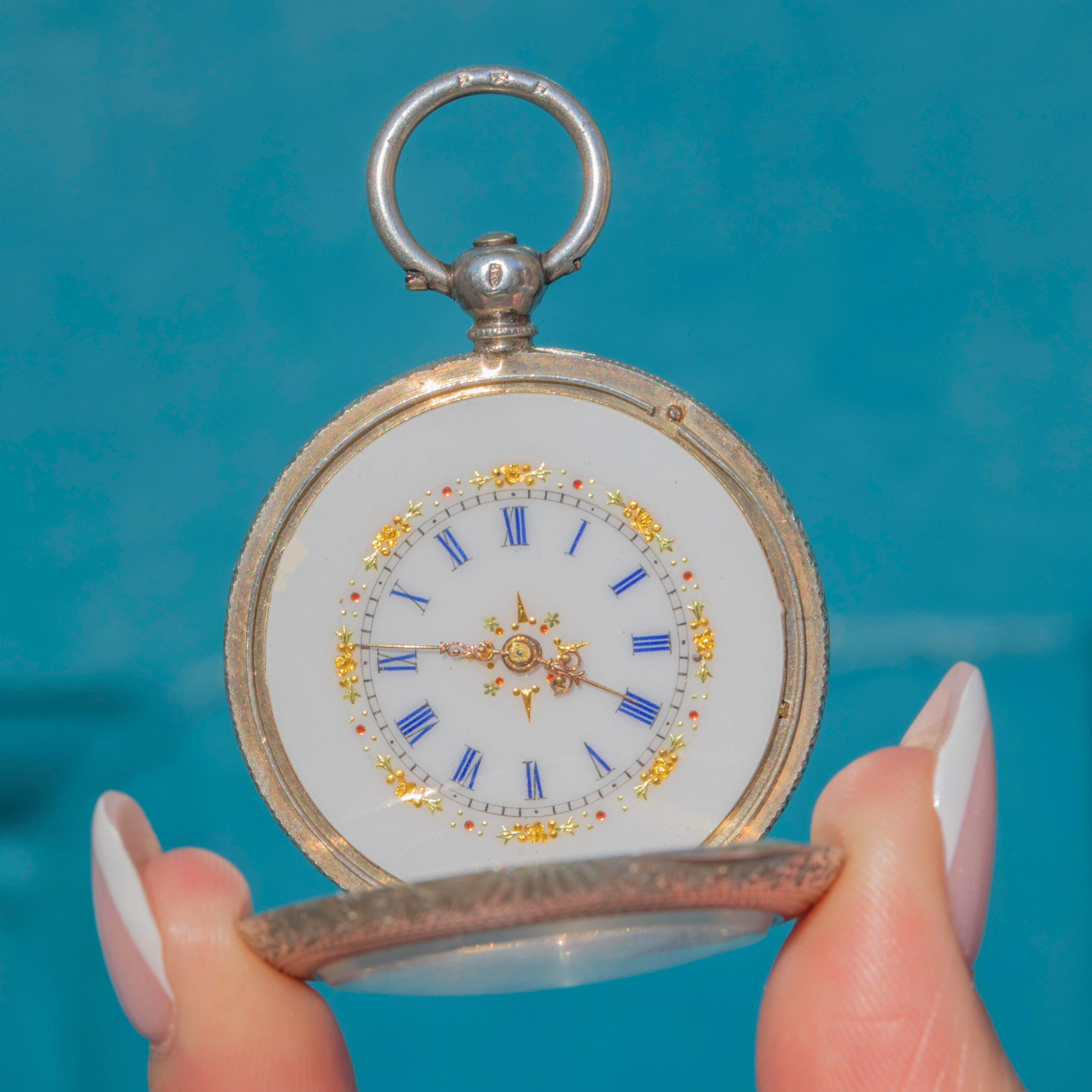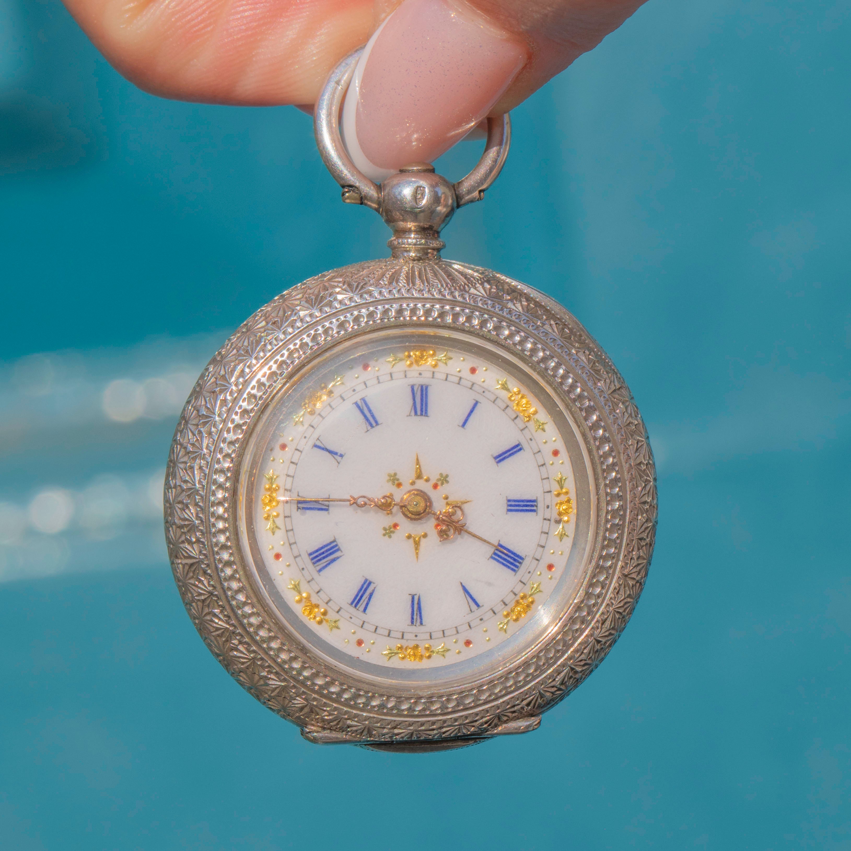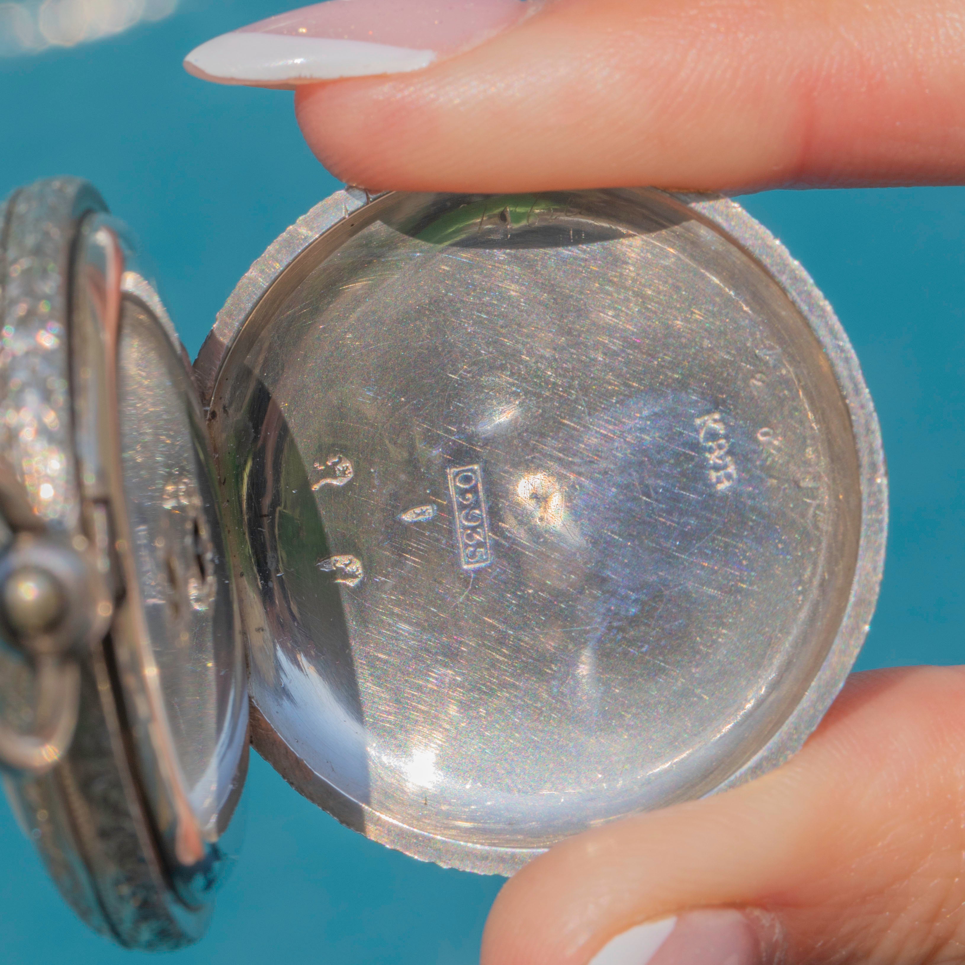 EXCELLENT: This antique Swiss Silver engraved pocket watch is in incredible condition. The watch can be opened easily by pressing the bale at the top, revealing its historic hallmarks inside. The hallmarks and engravings are well-preserved and crisp. This pocket watch will certainly take pride of place in your collection!