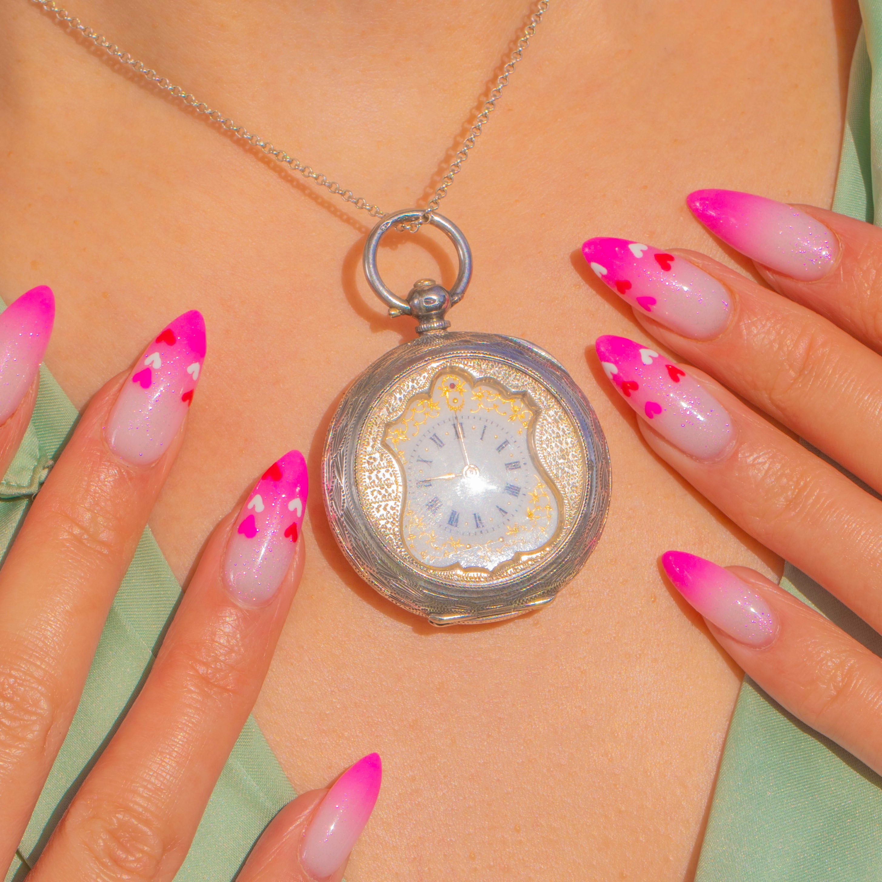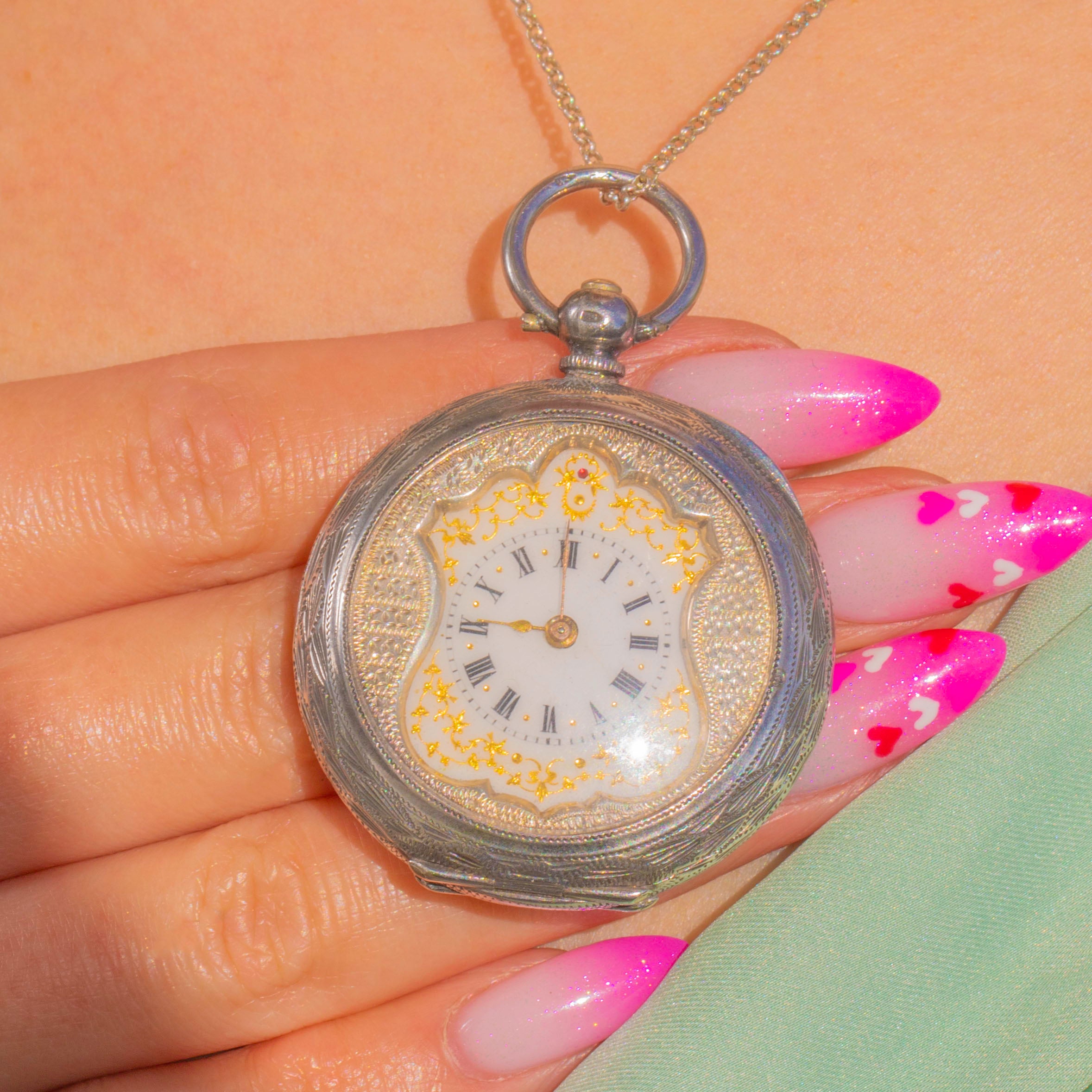 Finely crafted in Swiss Silver, this Edwardian ladies’ pendant watch is a petite delight with an ornate half‑hunter style cover and a distinctive shield‑shaped cartouche framing the dial. The case is beautifully worked with engine‑turned guilloché and chased foliate panels, while the white Enamel dial displays elegant Black Roman Numerals enhanced by Gold star and baton detailing around the periphery, and delicate gilt hands glinting beneath the glass.