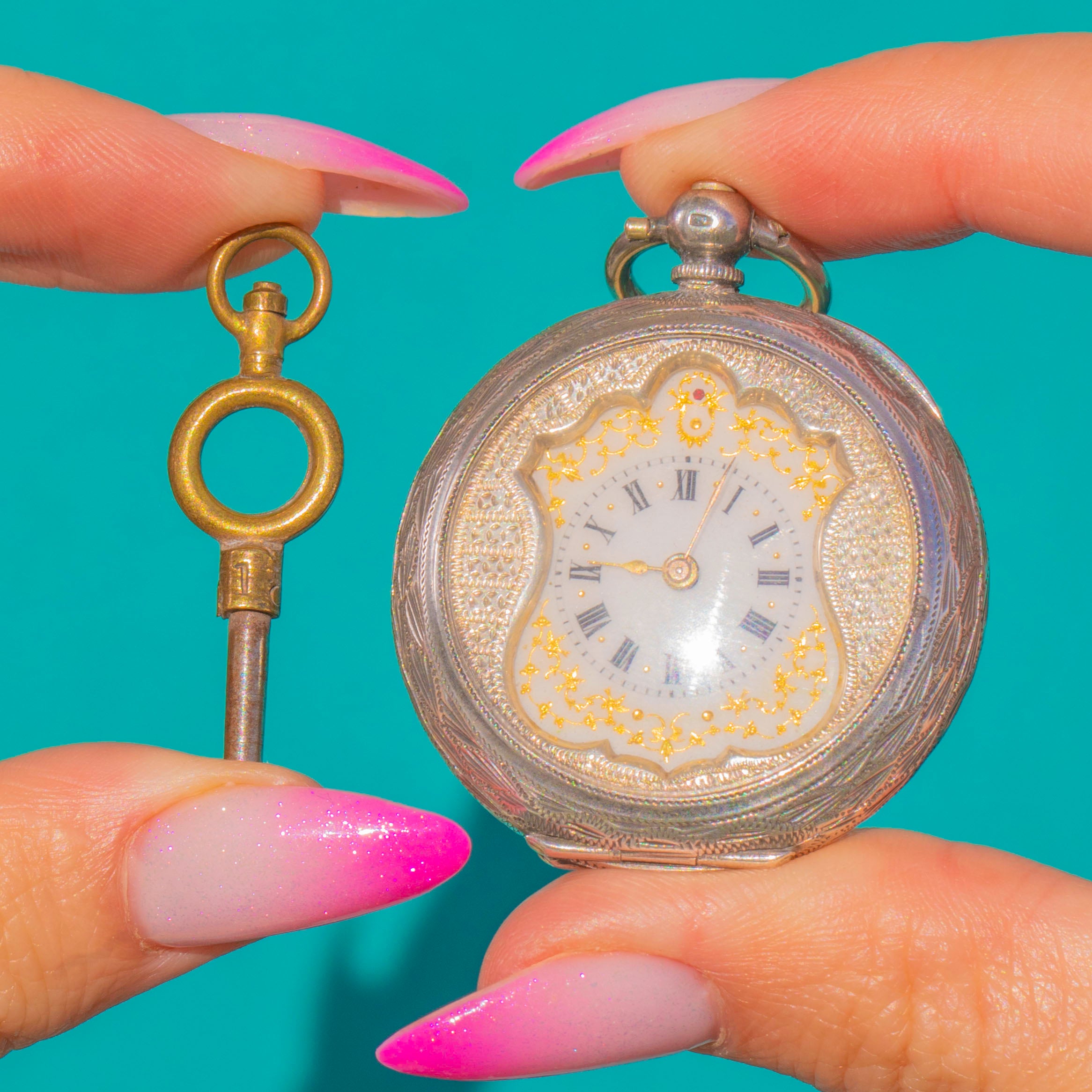 A charming key‑wind, key‑set design, it comes complete with its original winding key. Press and hold the button at the crown to release the back: use the central hole to set the time and the off‑centre hole to wind. Wind in short 10‑turn intervals and only once per day to avoid over‑winding.
