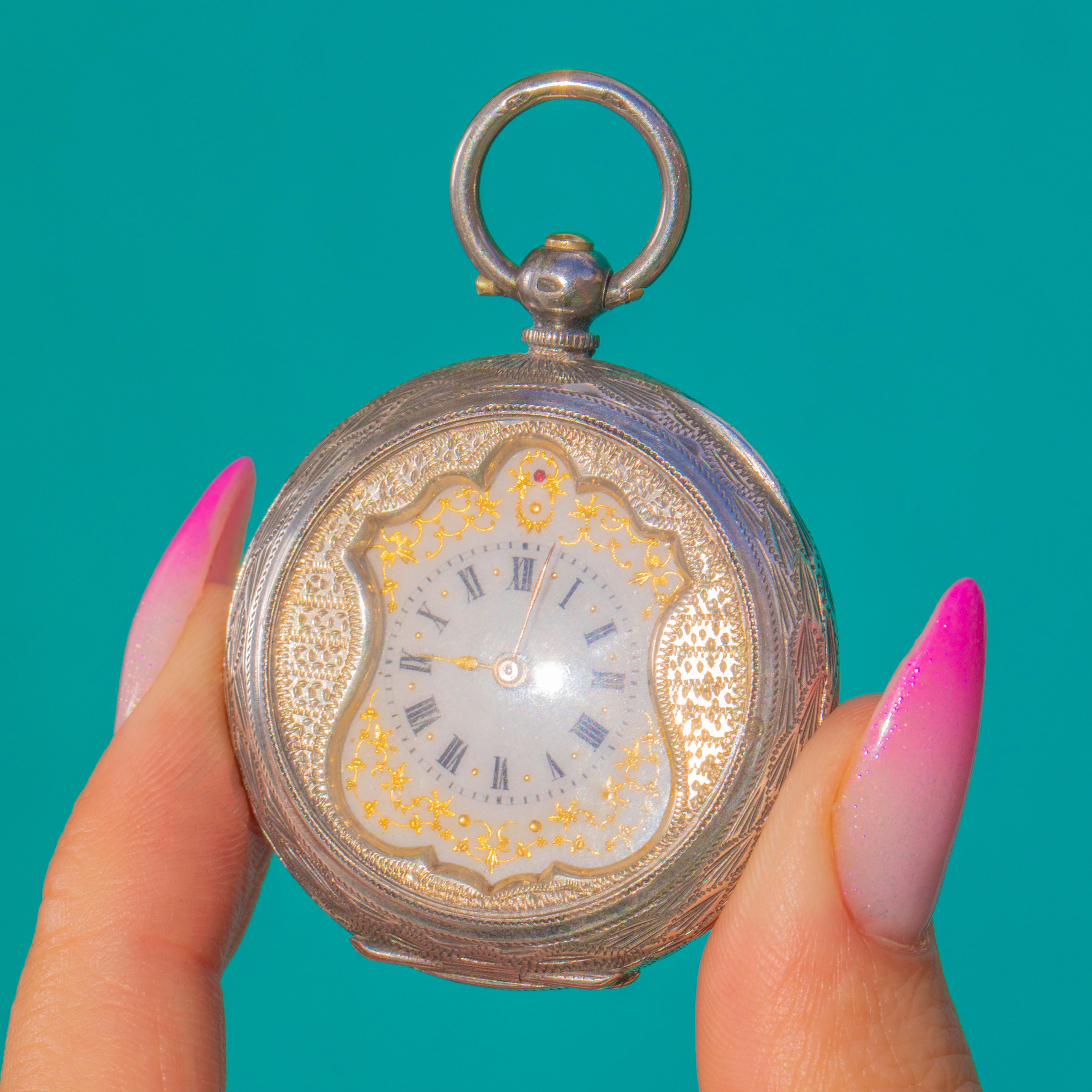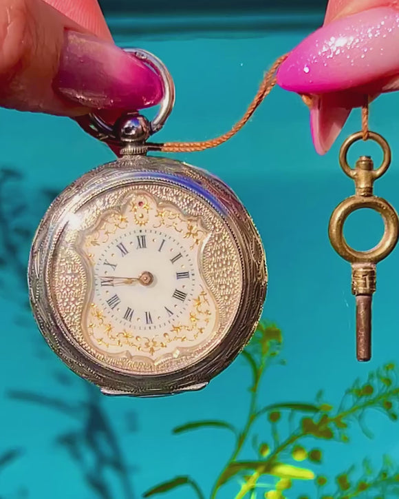 Antique Swiss Silver Ladies Watch Pendant- Shield Design with Key & Ornate Gold Detailing