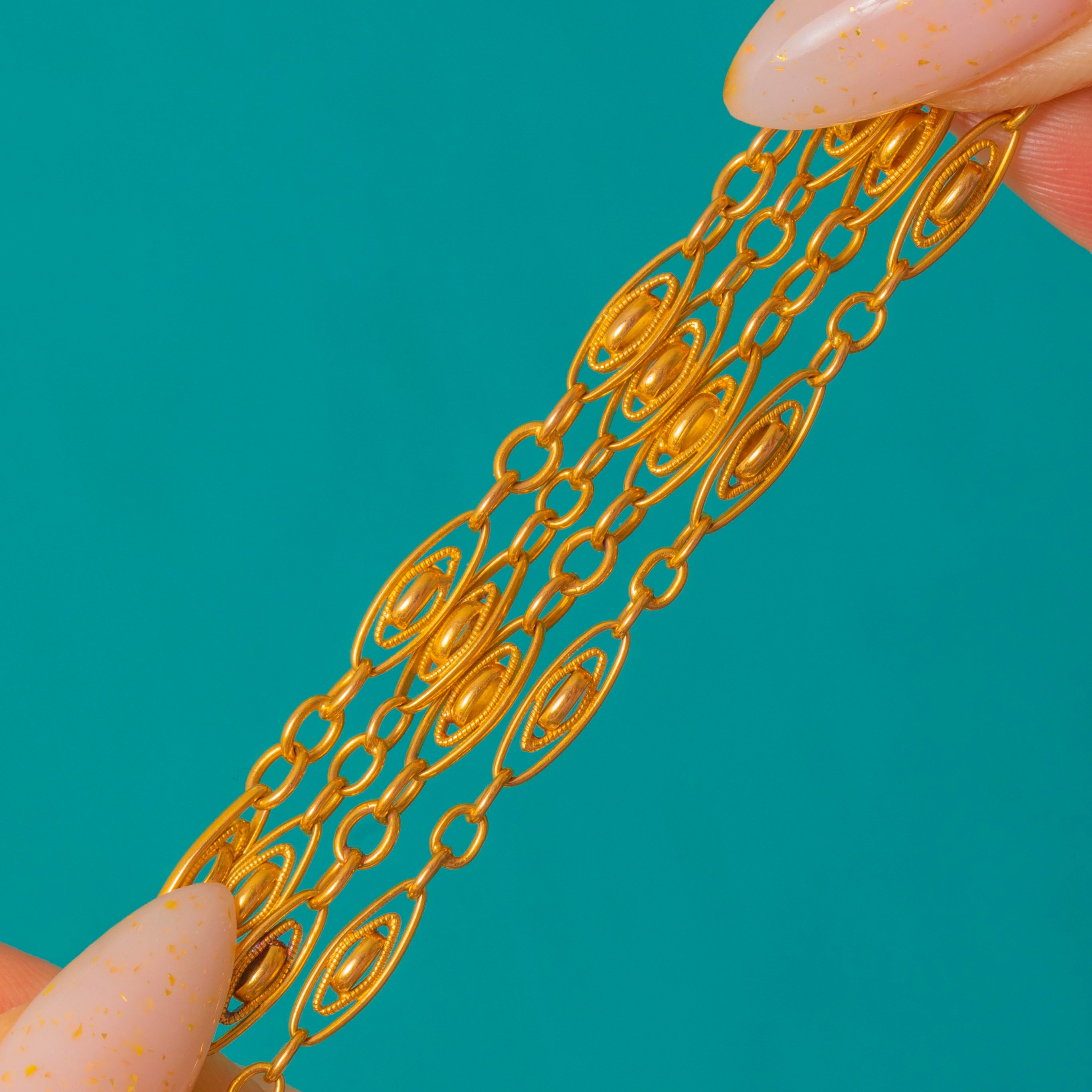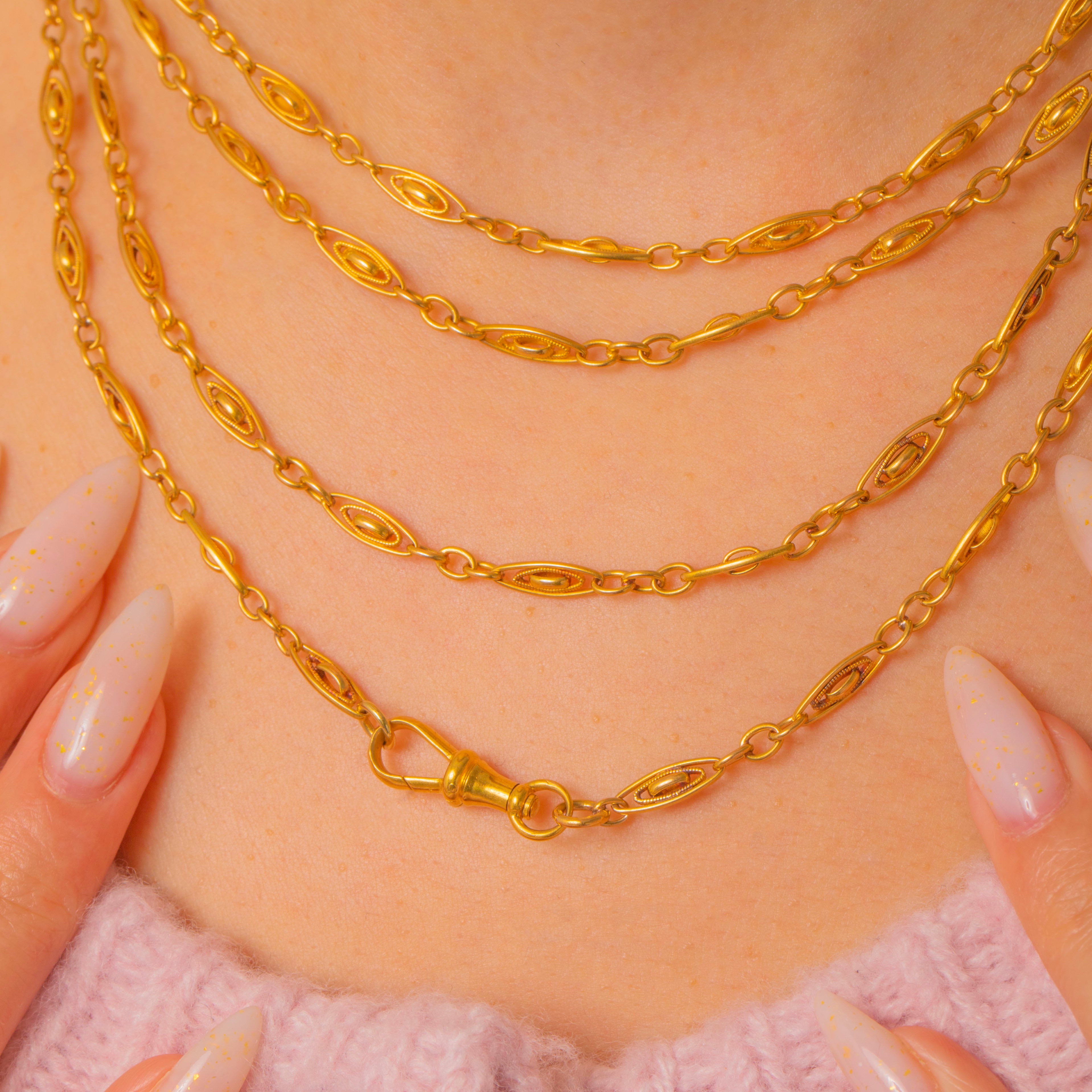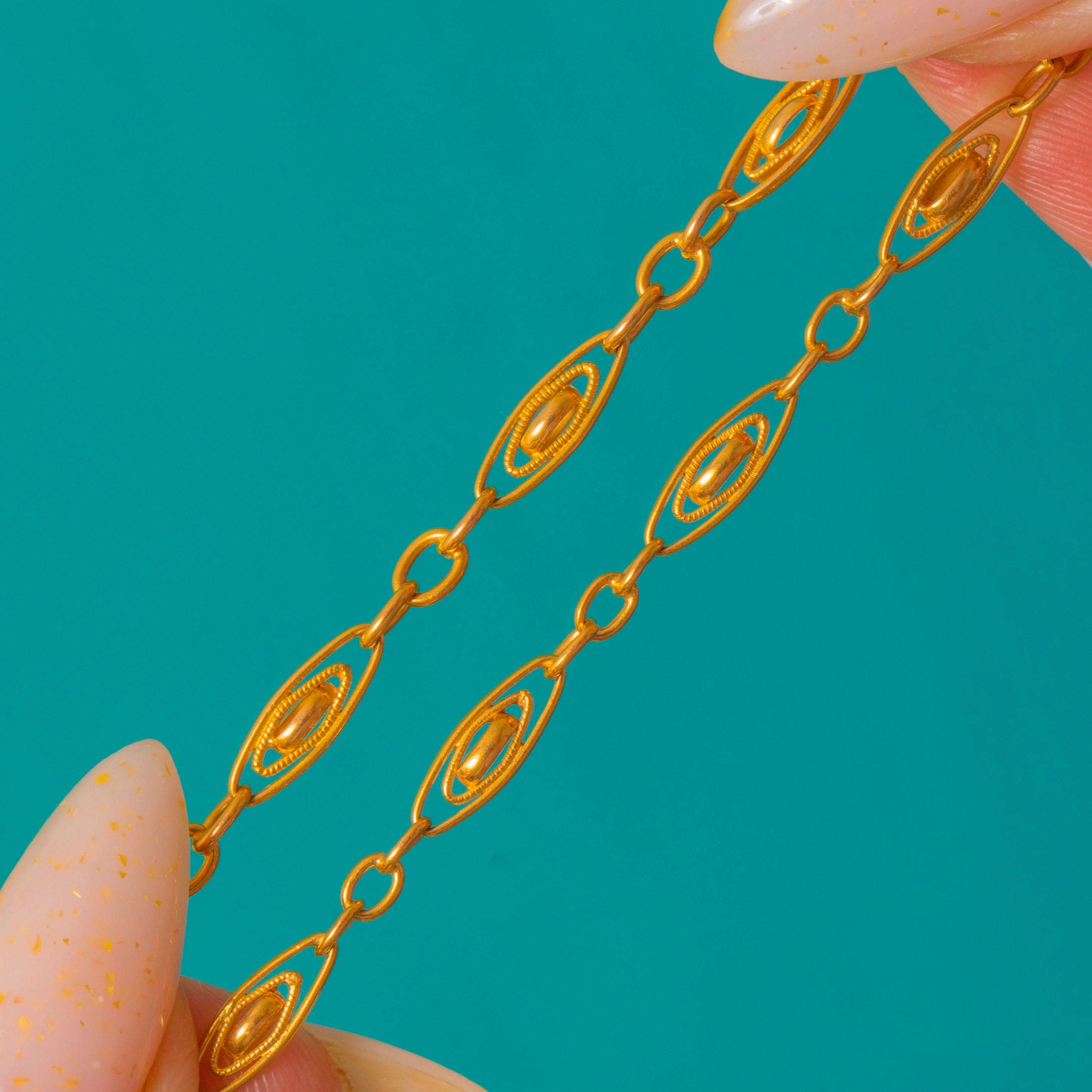 Repeating marquise‑shaped openwork panels, each with a fine beaded inner rim and a raised central ovoid bead, alternate with small oval spacer links to create a rhythmic silhouette that can be worn at full length or looped into multiple shorter tiers.