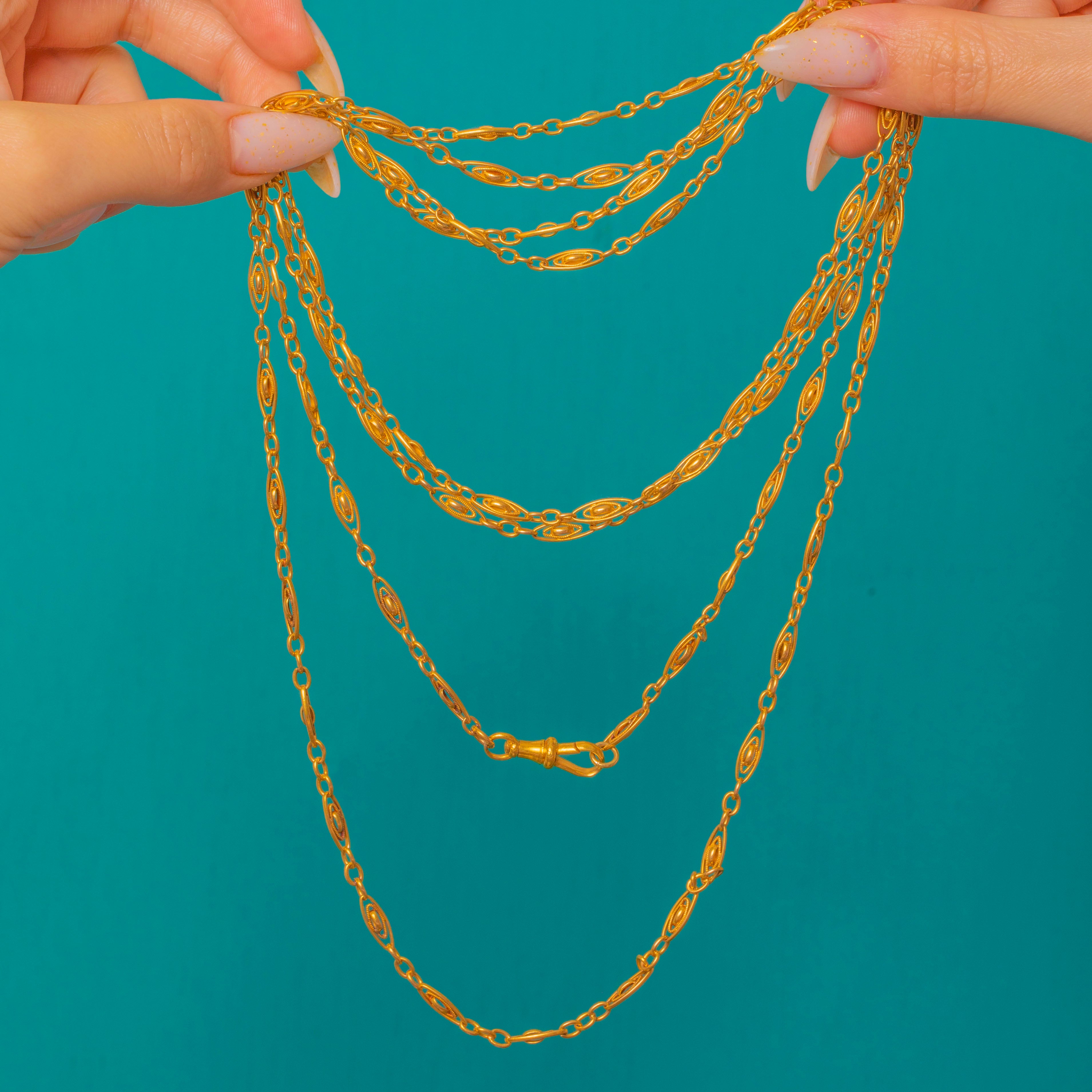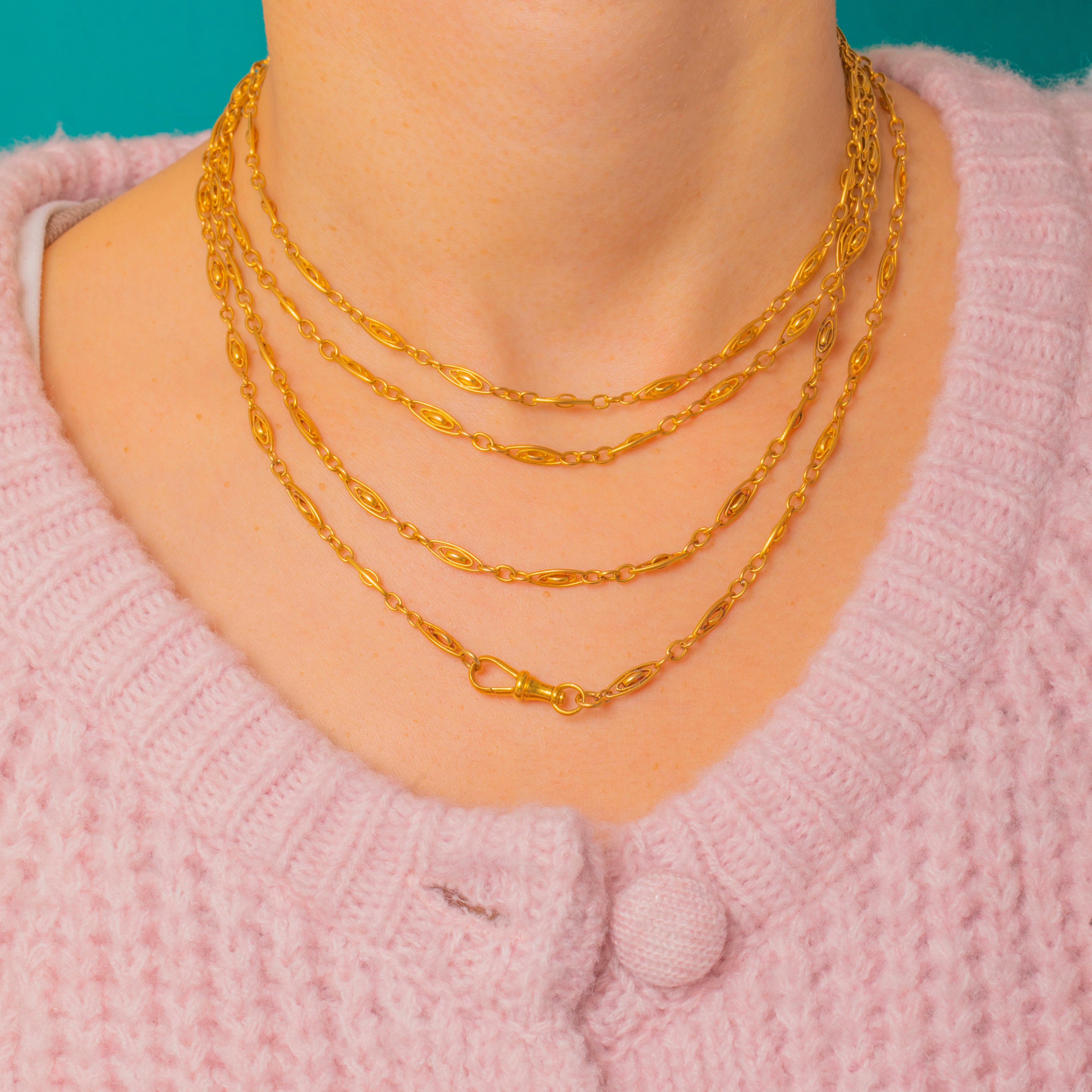An elegant, long decorative chain fashioned in warm yellow 18ct Gold, the piece is refined and endlessly wearable.