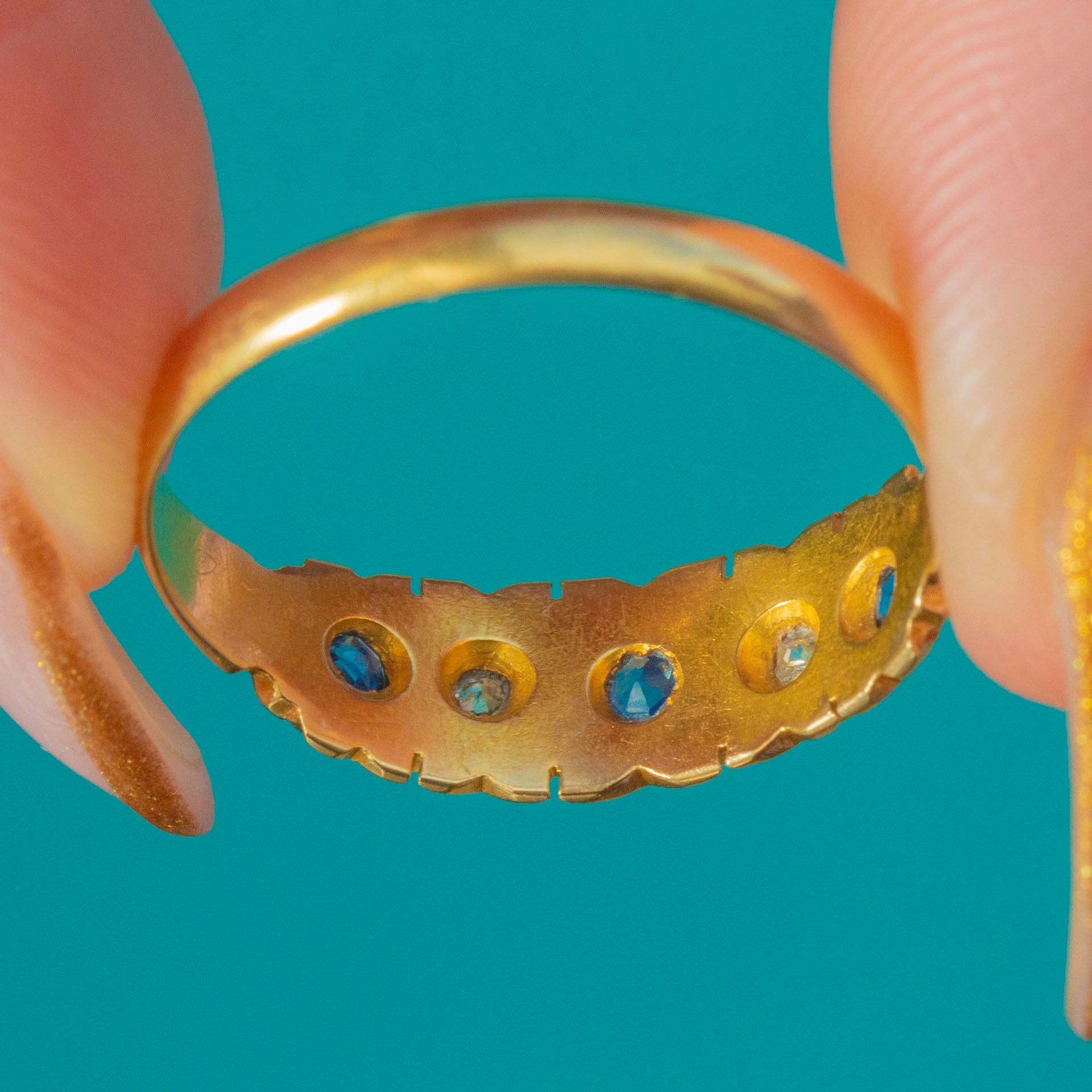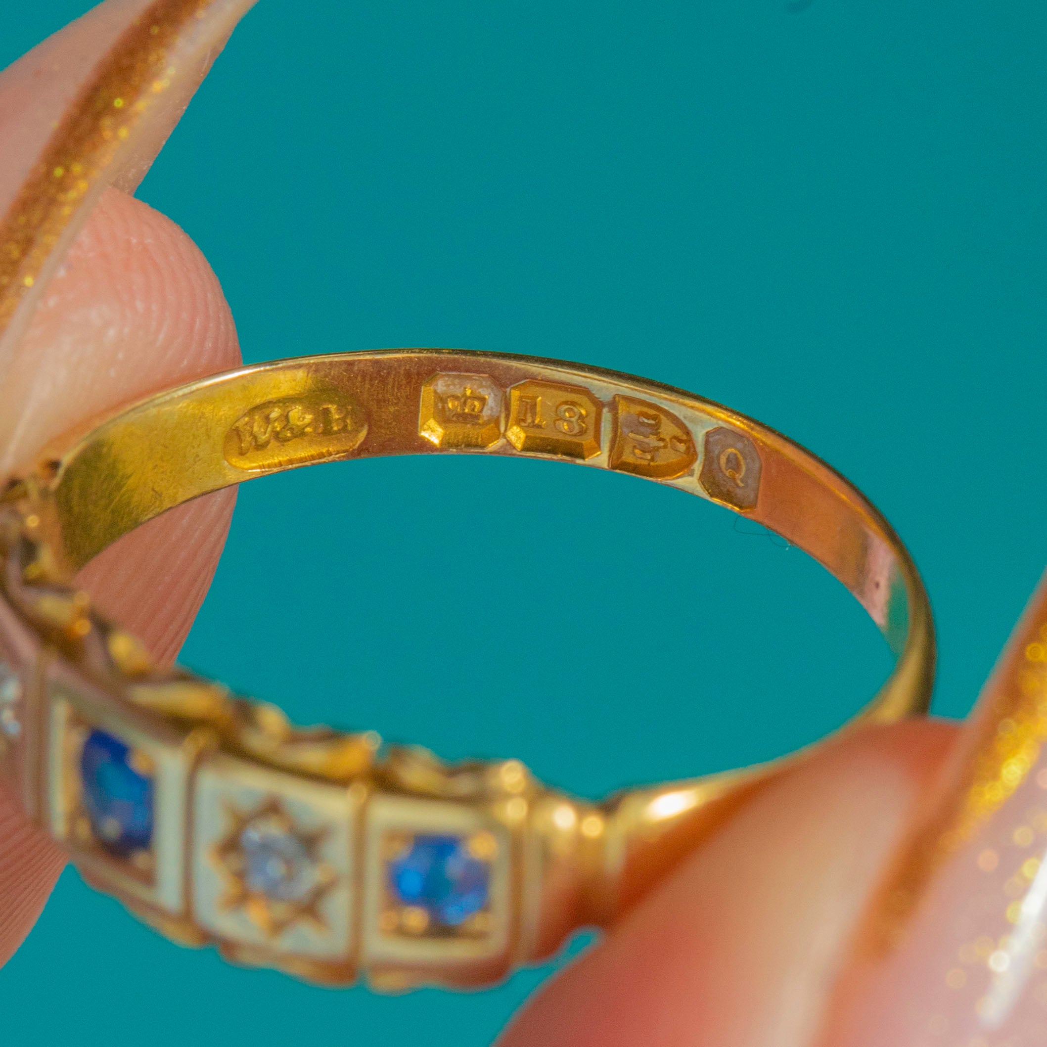 VERY GOOD-EXCELLENT: The Sapphires and Diamonds are original, securely set and free from chips, retaining strong colour and sparkle. The star-set engravings remain crisp. The band shows light wear at the back consistent with age, with no signs of previous resizing. A beautifully preserved late Victorian gypsy ring.
