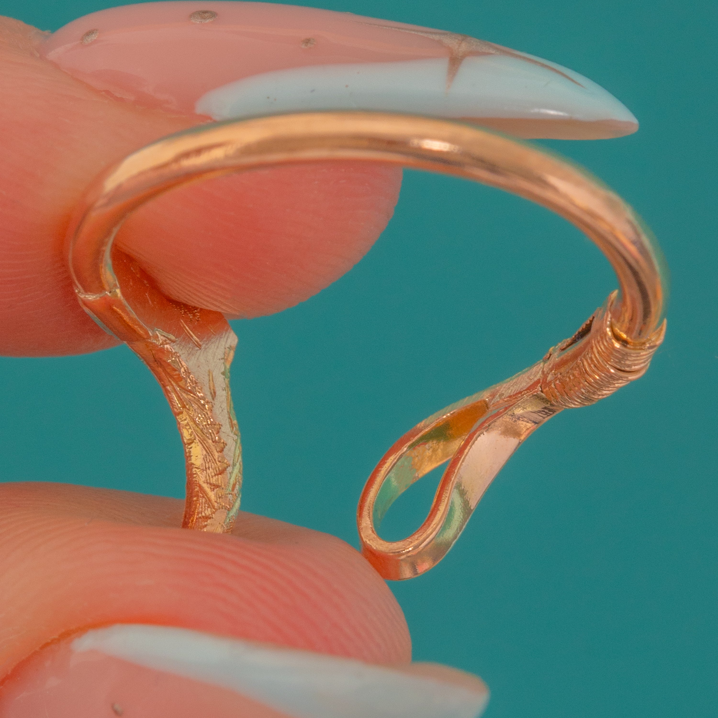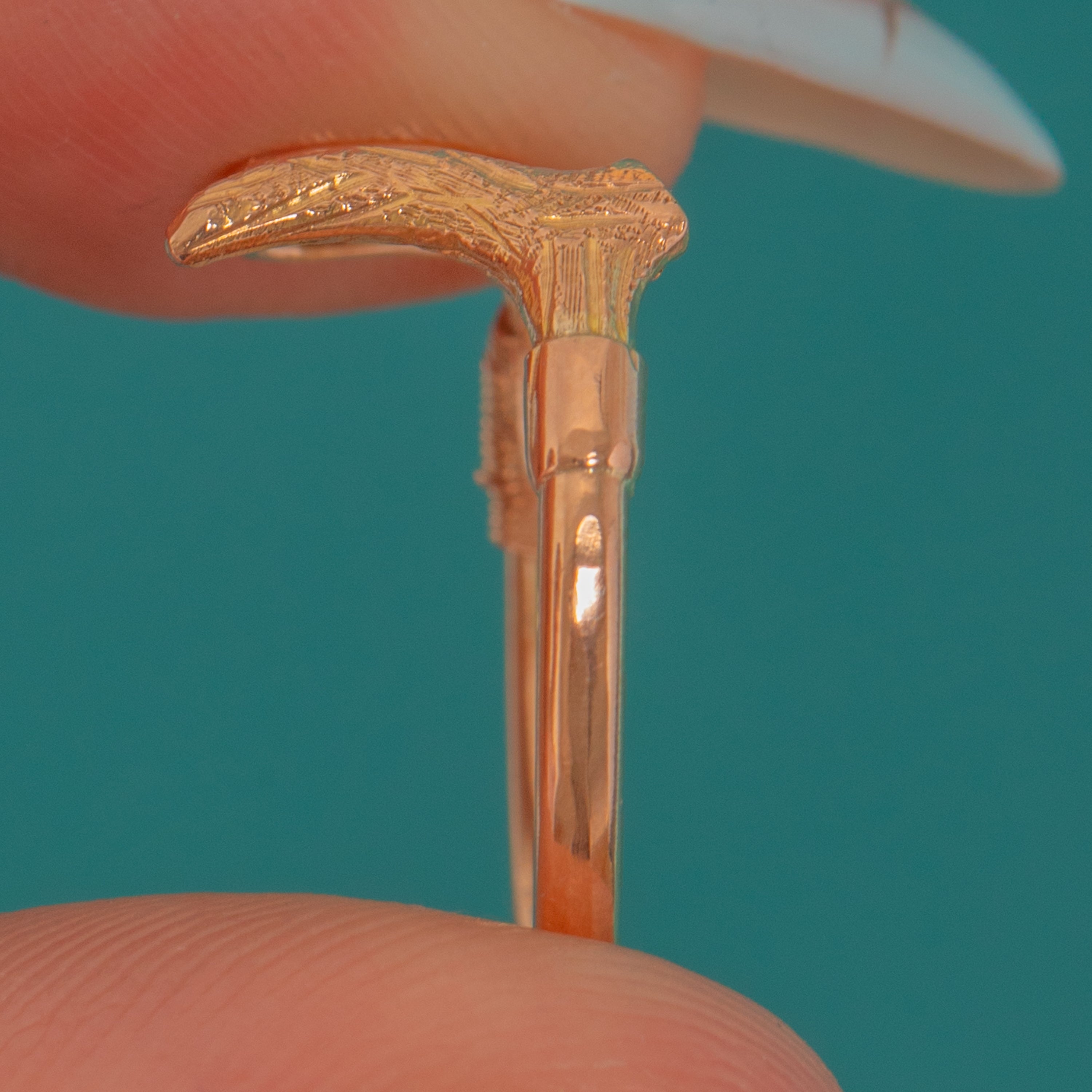 Crafted in warm 9ct Yellow Gold and stamped “9CT” to the crop’s handle, the design is slim, refined and easy to stack or style solo. The band has a gentle, tactile flex owing to the conversion, offering a comfortable fit and a whisper-light presence on the hand.