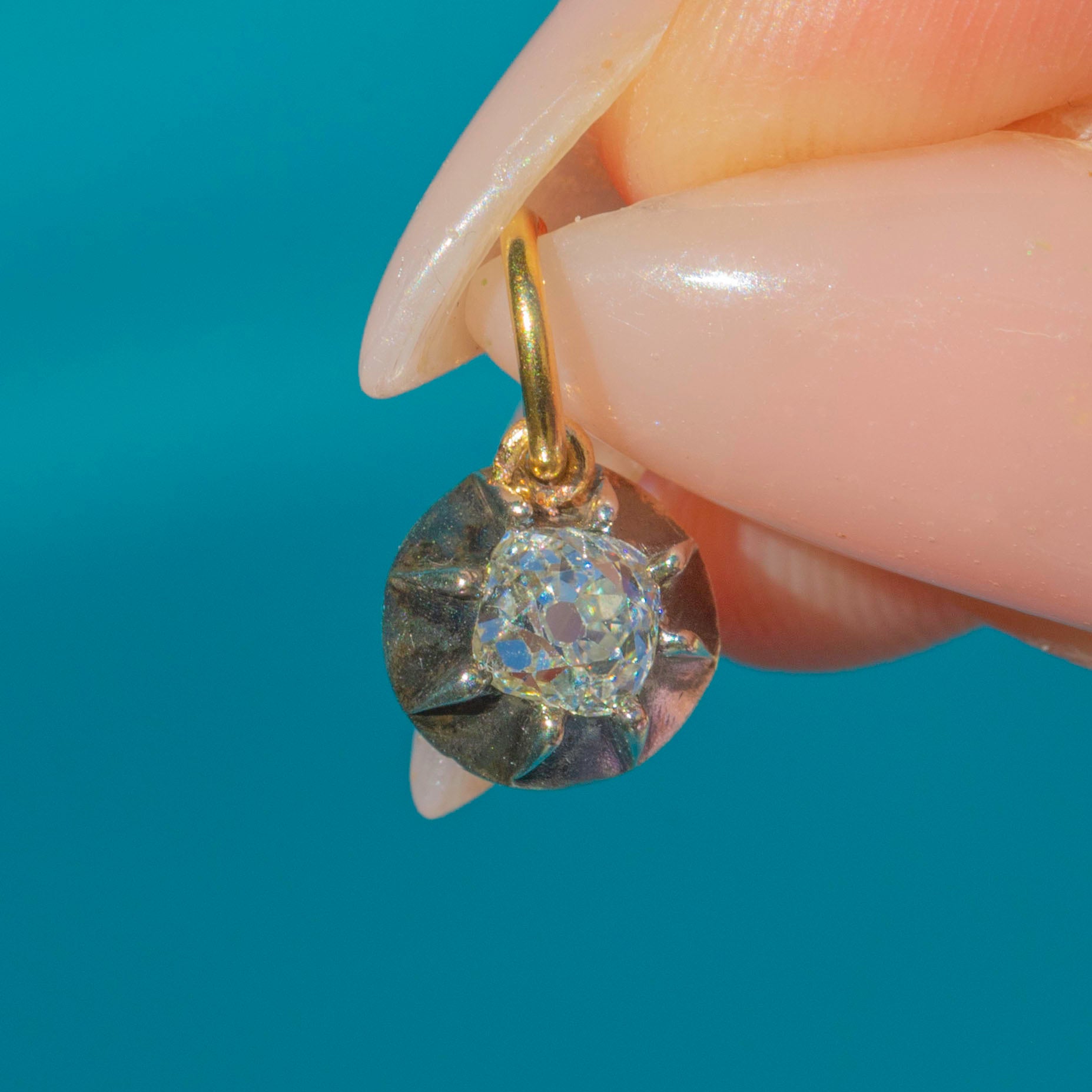 This exquisite Victorian charm is set with a lively Old Mine Cut Diamond weighing approximately 0.30ct. Cushion-shaped with large antique facets, the stone sparkles with all the fire and romance of the 19th century.