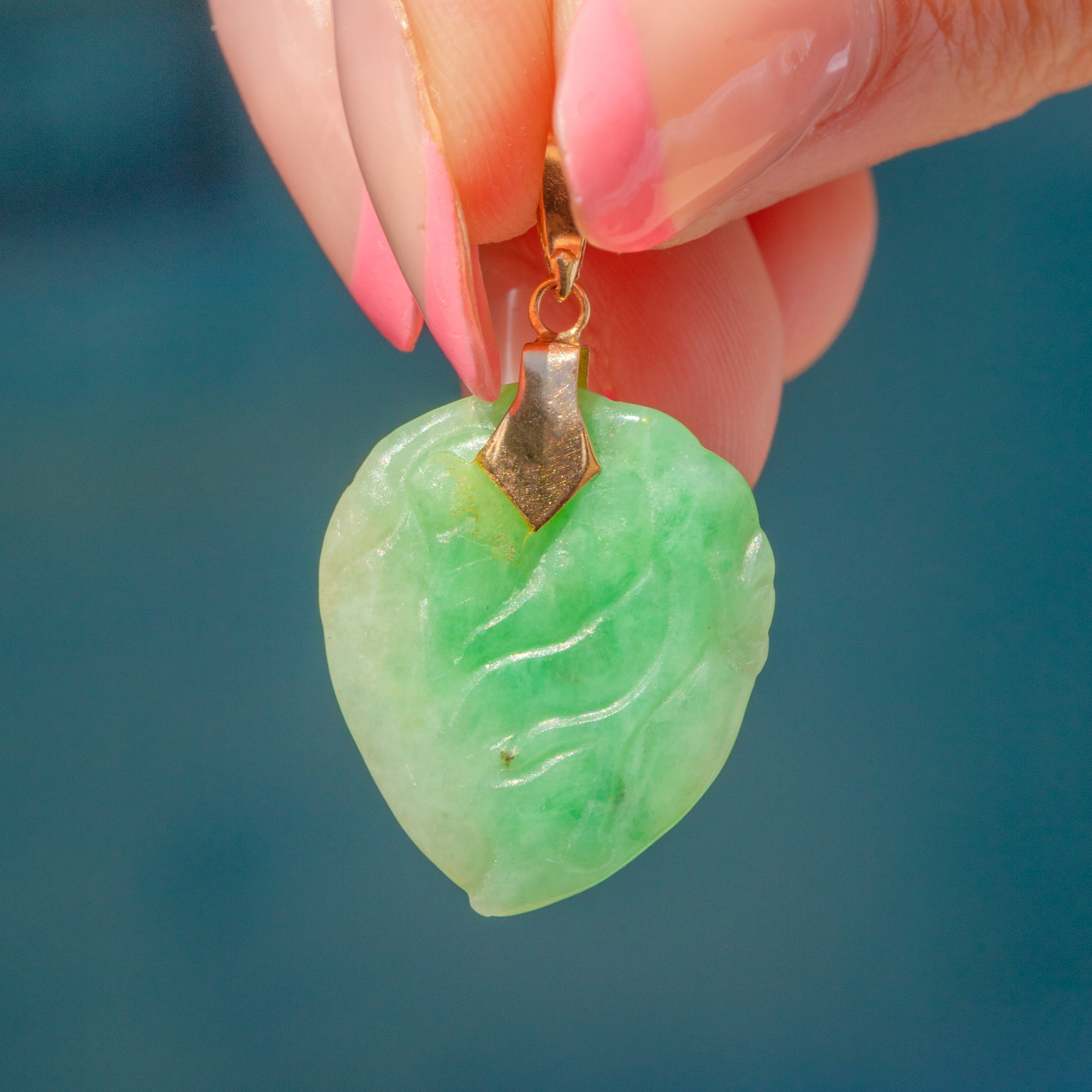 EXCELLENT: This Art Deco 14ct Gold Carved Jade heart pendant is in excellent condition. The Jade is smooth and beautifully carved, with no chips or surface marks, and is securely affixed to the bale. She's a delight!