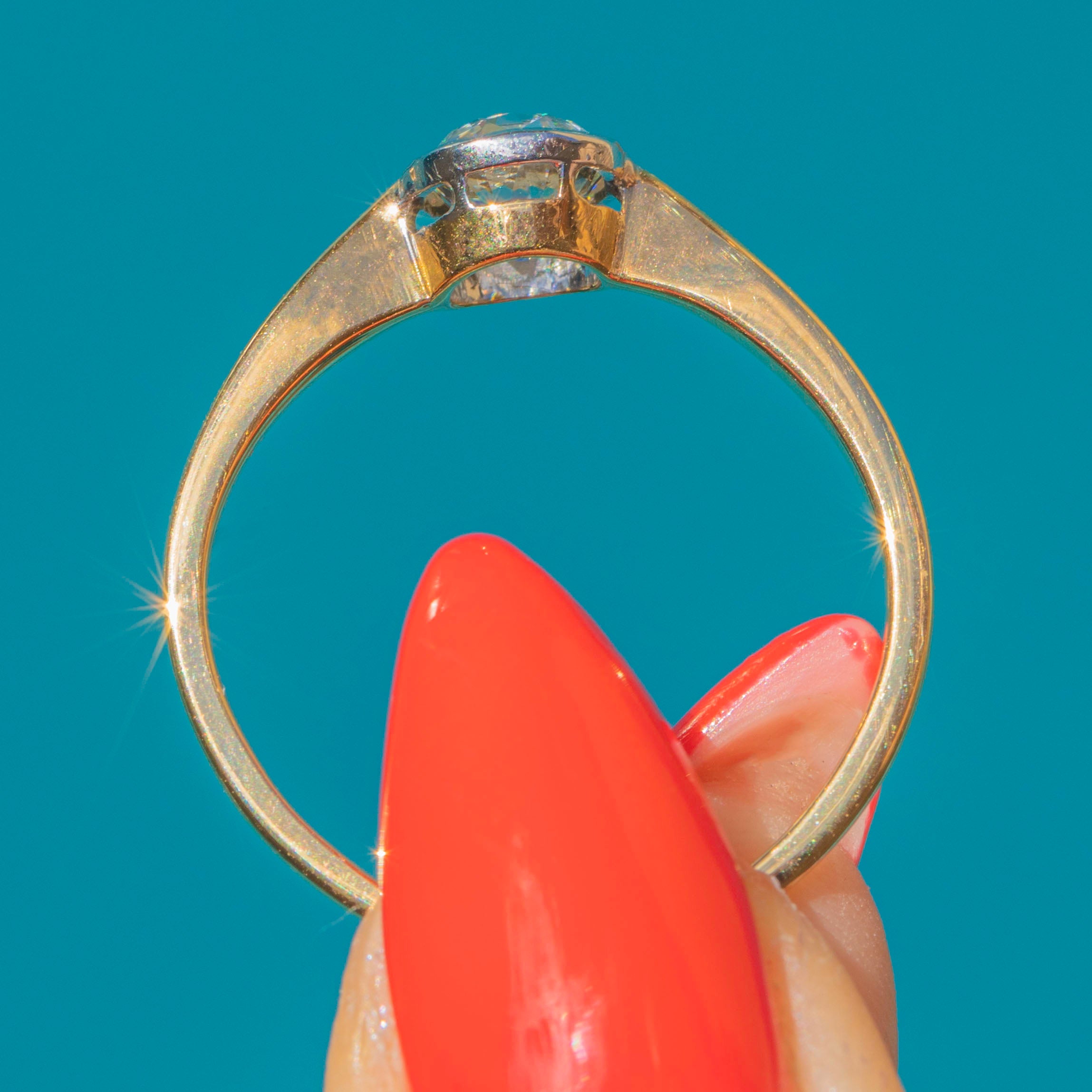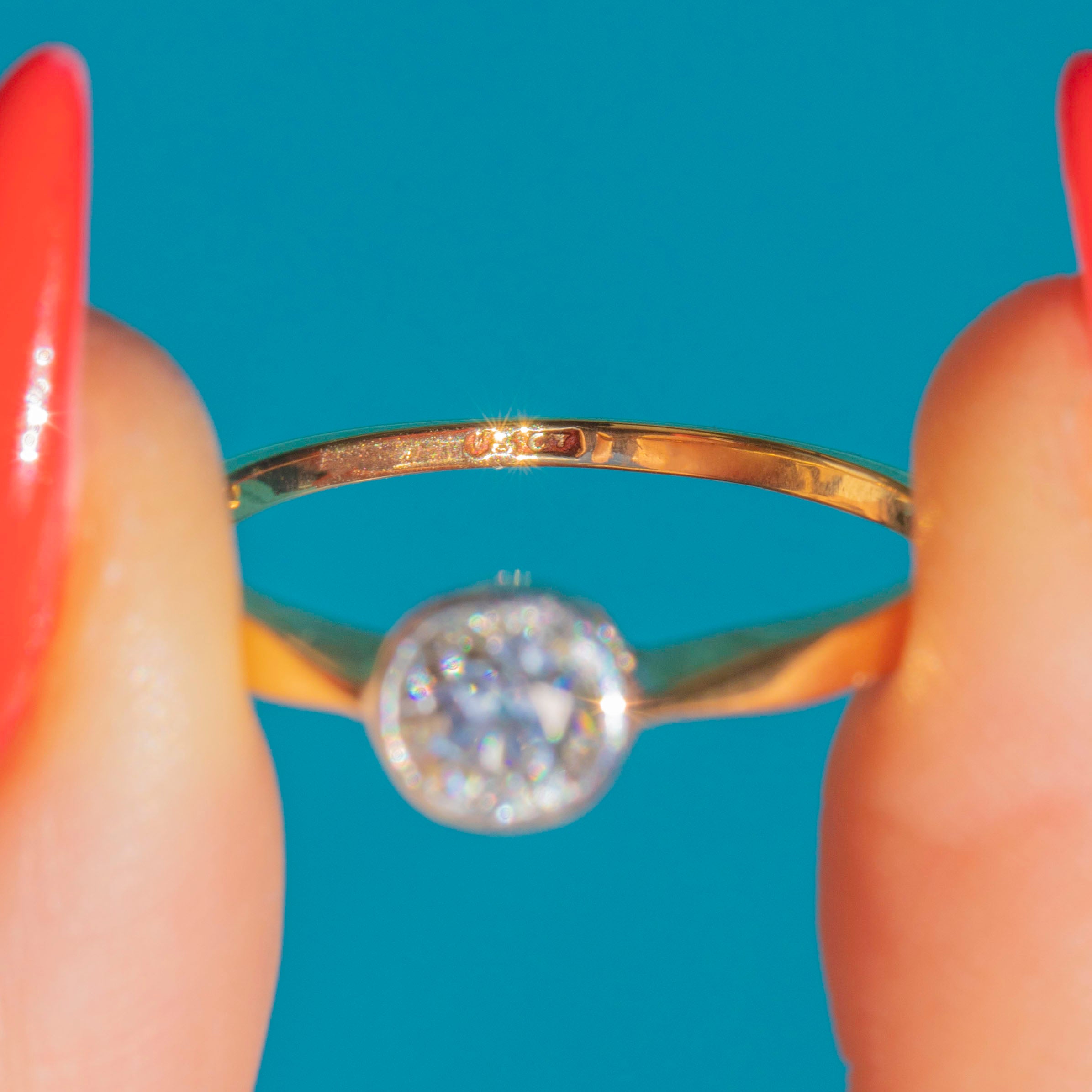 VERY GOOD-EXCELLENT. This Art Deco 18ct Gold bezel-set Diamond solitaire ring is quite the find with an astoundingly rare 0.80ct old European Diamond! The ring is stunning, inlaid with a bright and sparkly old-European cut Diamond in perfect condition with no chips, or abrasion of any kind.