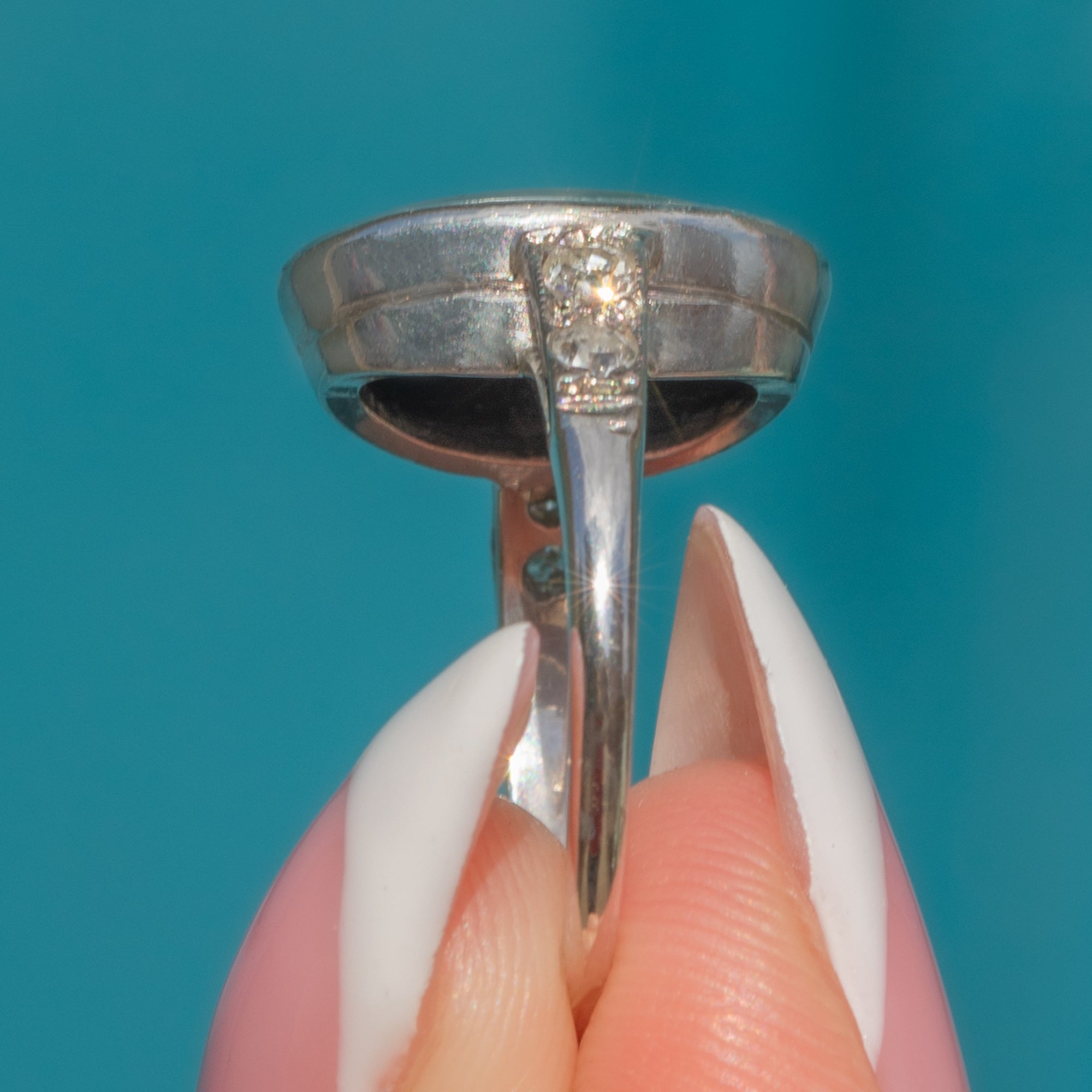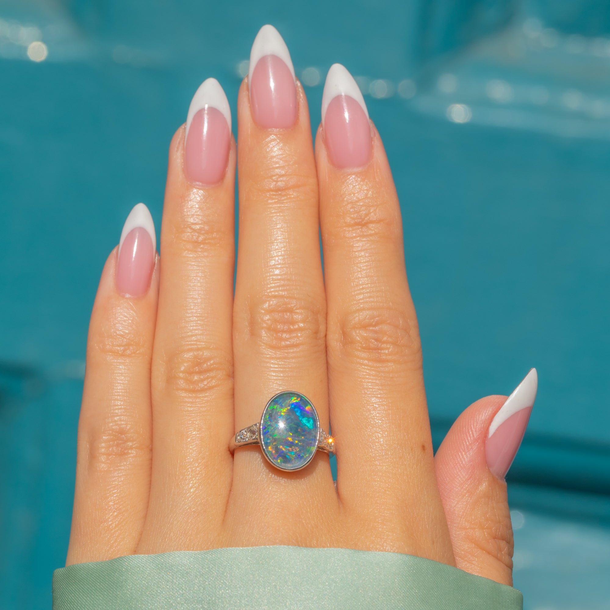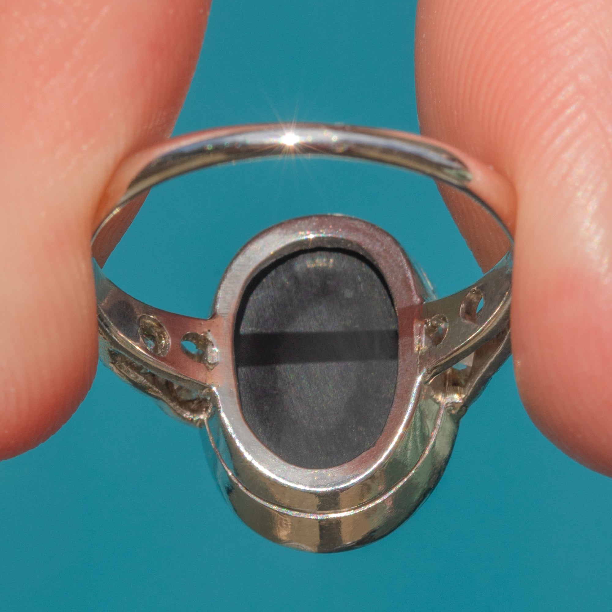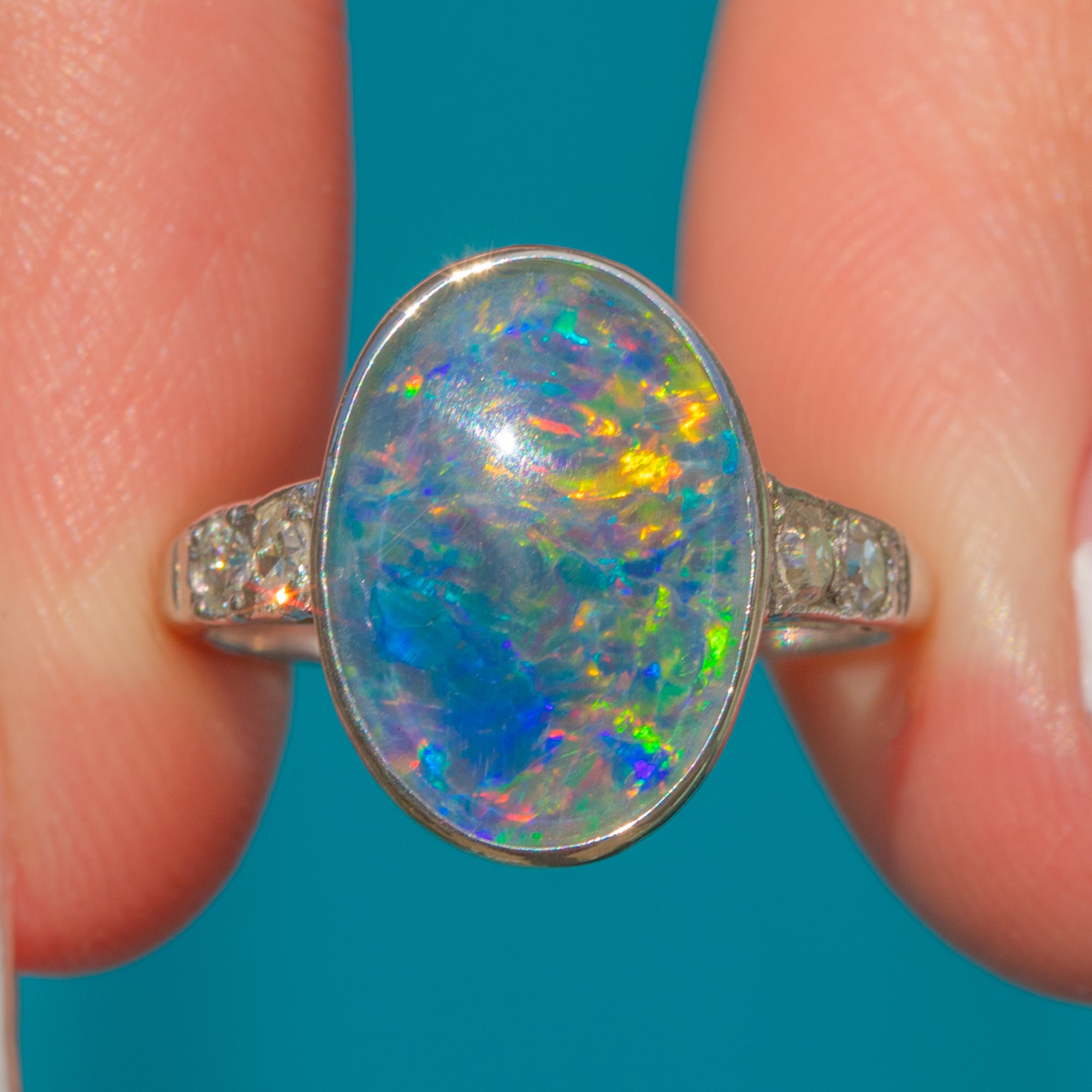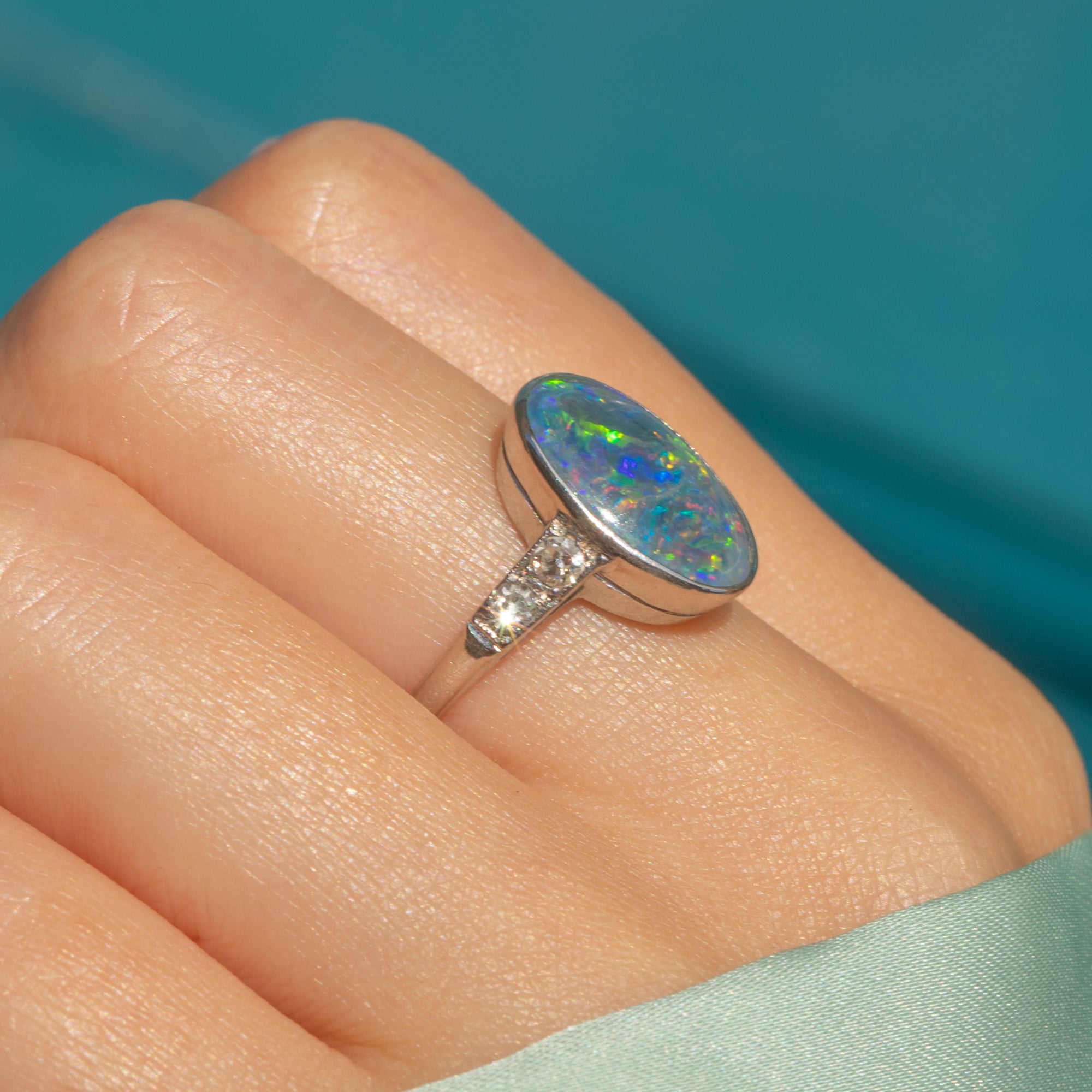 This antique ring is beauty encapsulated and we adore the fusion of colours in the lively Opal Doublet, with electric blues, zingy greens, and vivid violets bursting from the smooth cabochon surface. This Art Deco ring, Diamonds twinkling, will capture the eyes of onlookers and enchant with its unique design!