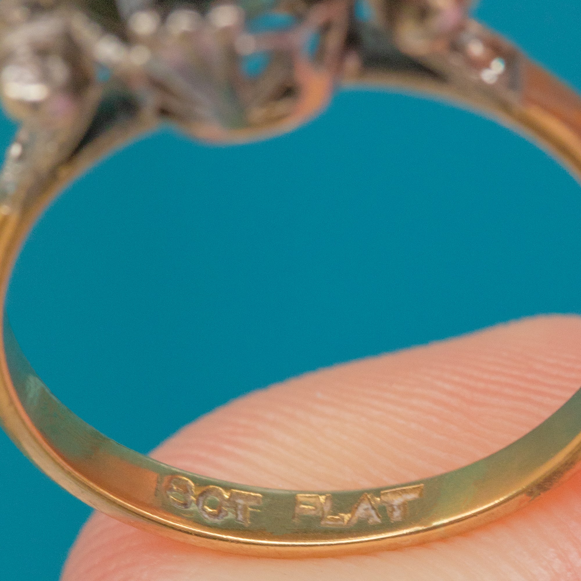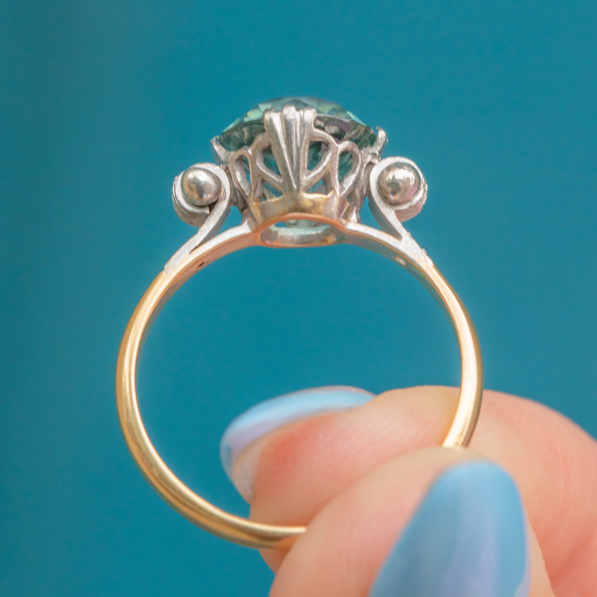 This striking antique Zircon ring exudes Deco elegance! Crafted from sumptuous 18ct Gold and inlaid with an icy blue 2.90ct Zircon flanked by scintillating Diamonds, this Art Deco ring will make an impact adorning your hand.