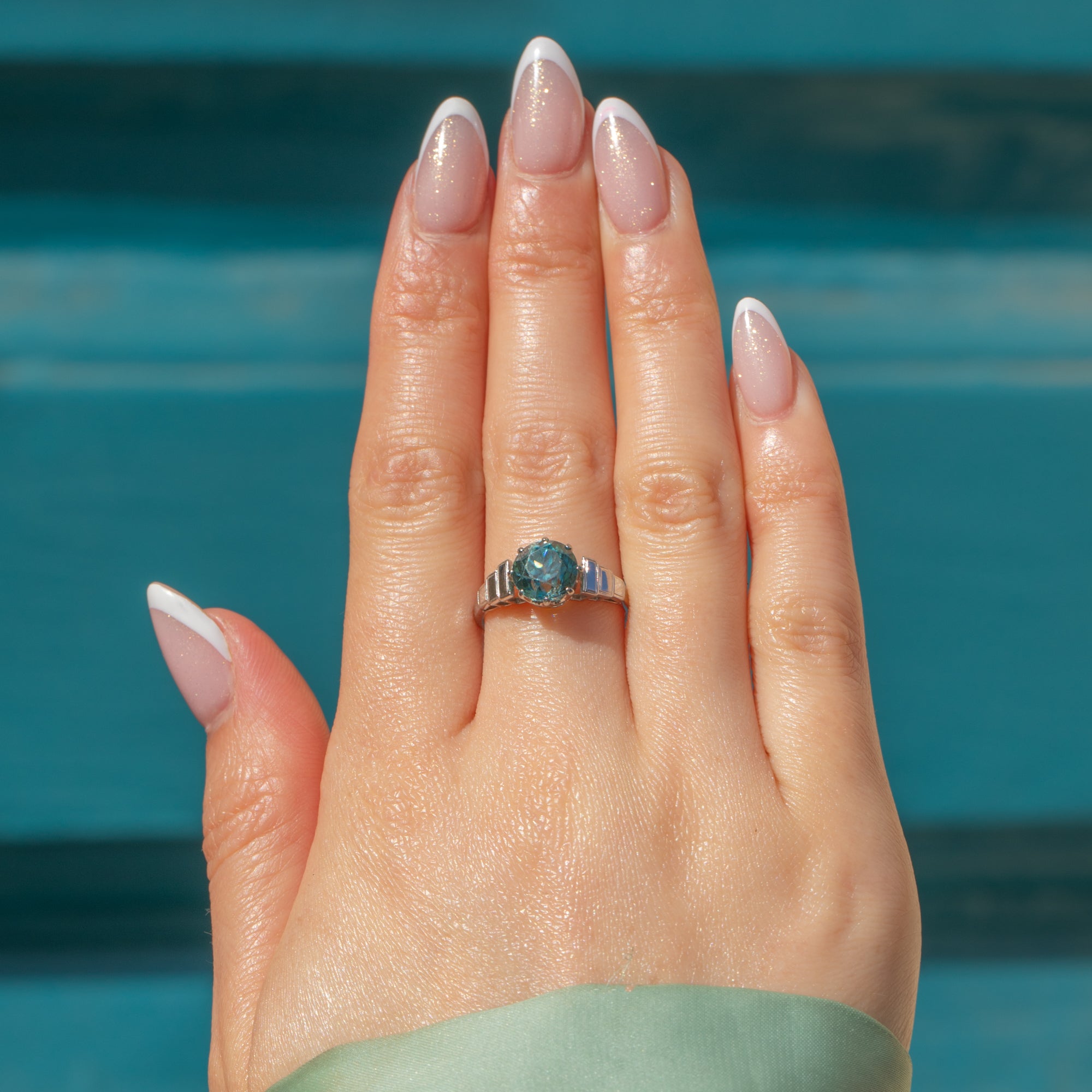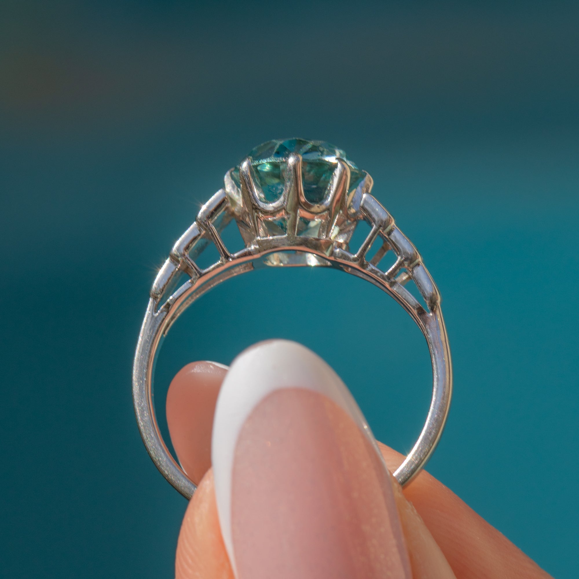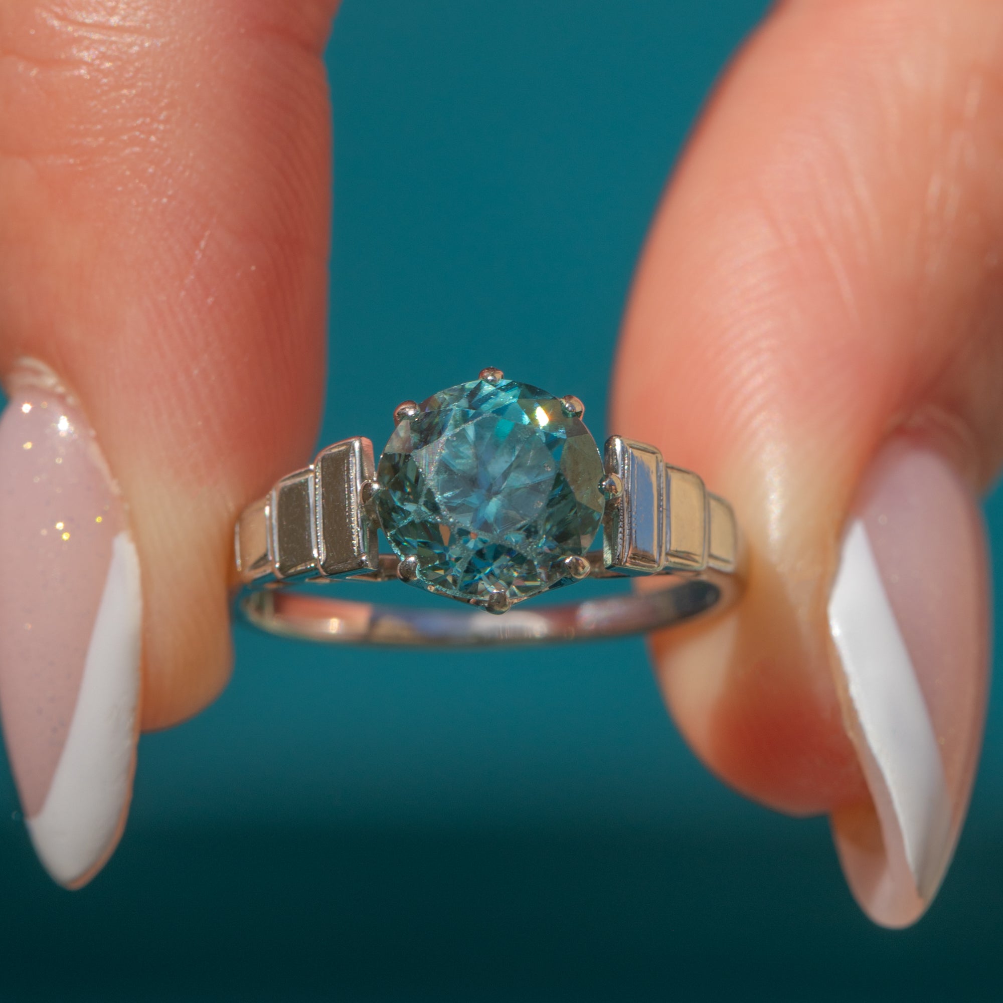 This Art Deco 18ct Gold Blue Zircon solitaire ring is super cute and sparkly! Crafted from 18ct White Gold, the focal point is an icy blue 1.00ct Zircon, displayed within classically Deco bold, geometric shoulders.