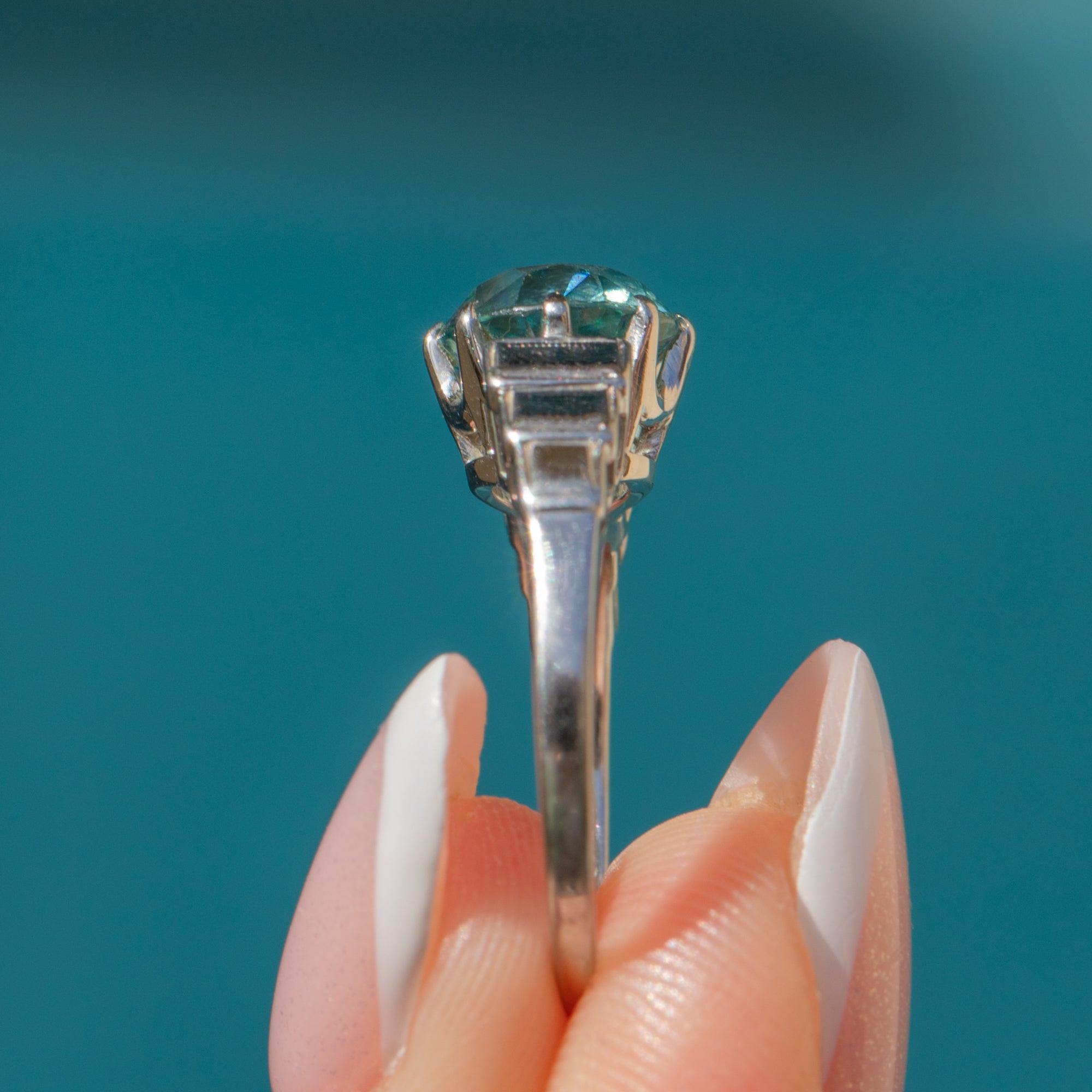 VERY GOOD: This Art Deco 18ct Gold Blue Zircon solitaire ring is tip-top condition. The Zircon is snug in its settings and the White Gold has a high-shine polish and luminescence! While there is evidence on the back of a previous resize, this does not affect the overall impact of the piece.