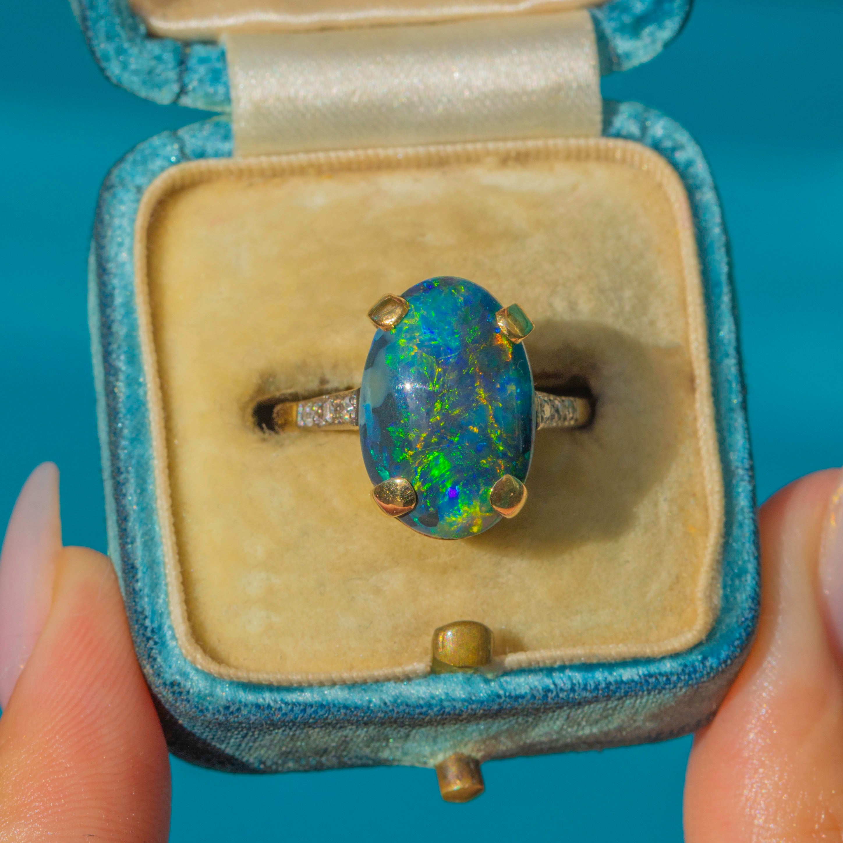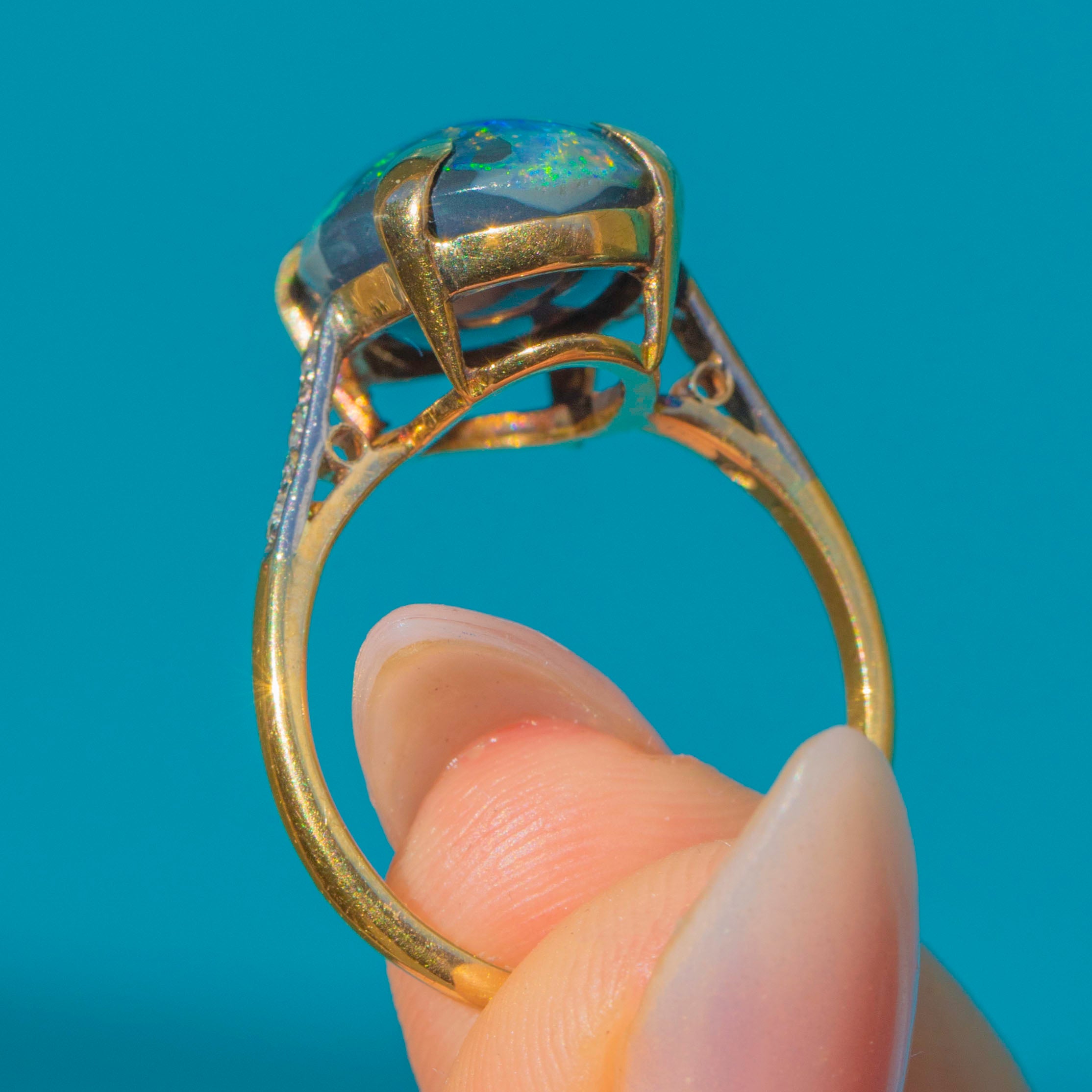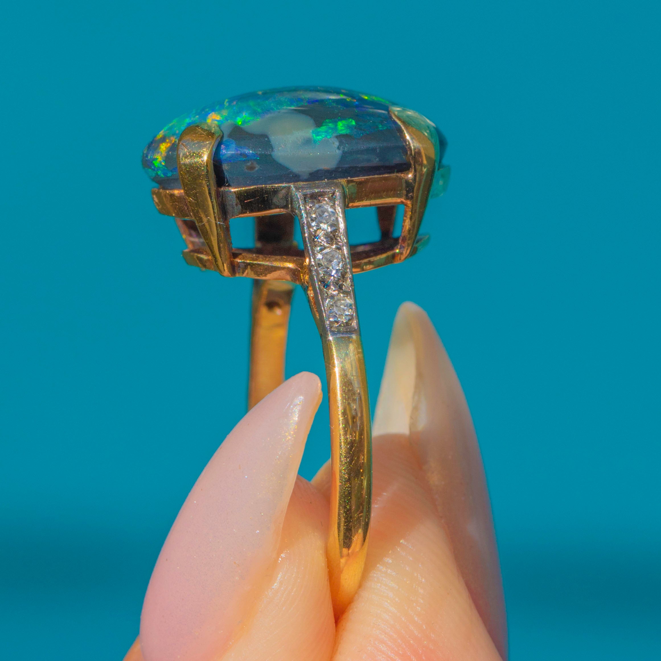 The shoulders are set with bright G-H colour, VS1-VS2 clarity Diamonds that add sparkle and refinement, enhancing the depth and fire of the Opal. Stamped “18k” and accompanied by WGI certification, this is a rare and striking statement piece for any serious antique jewellery collection.