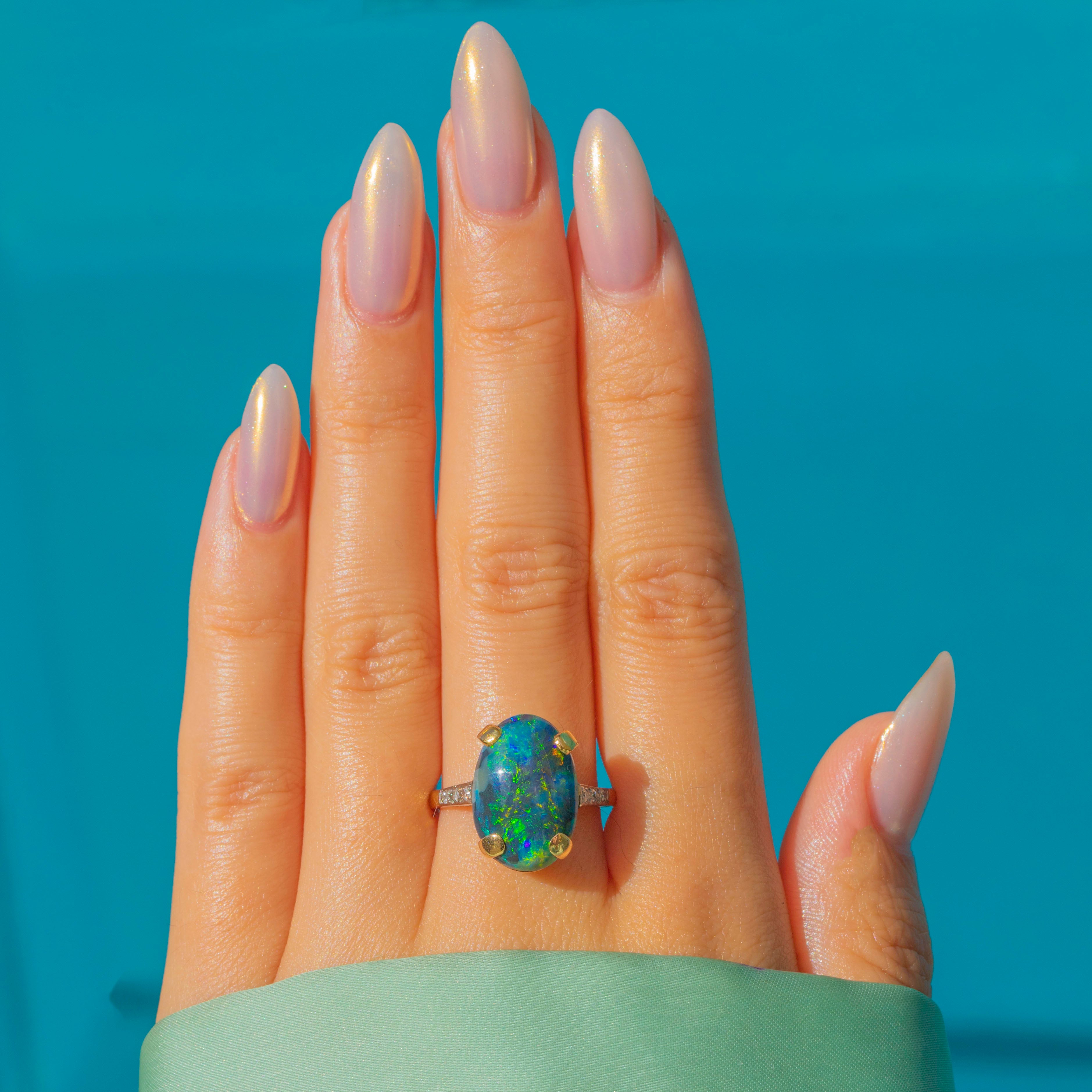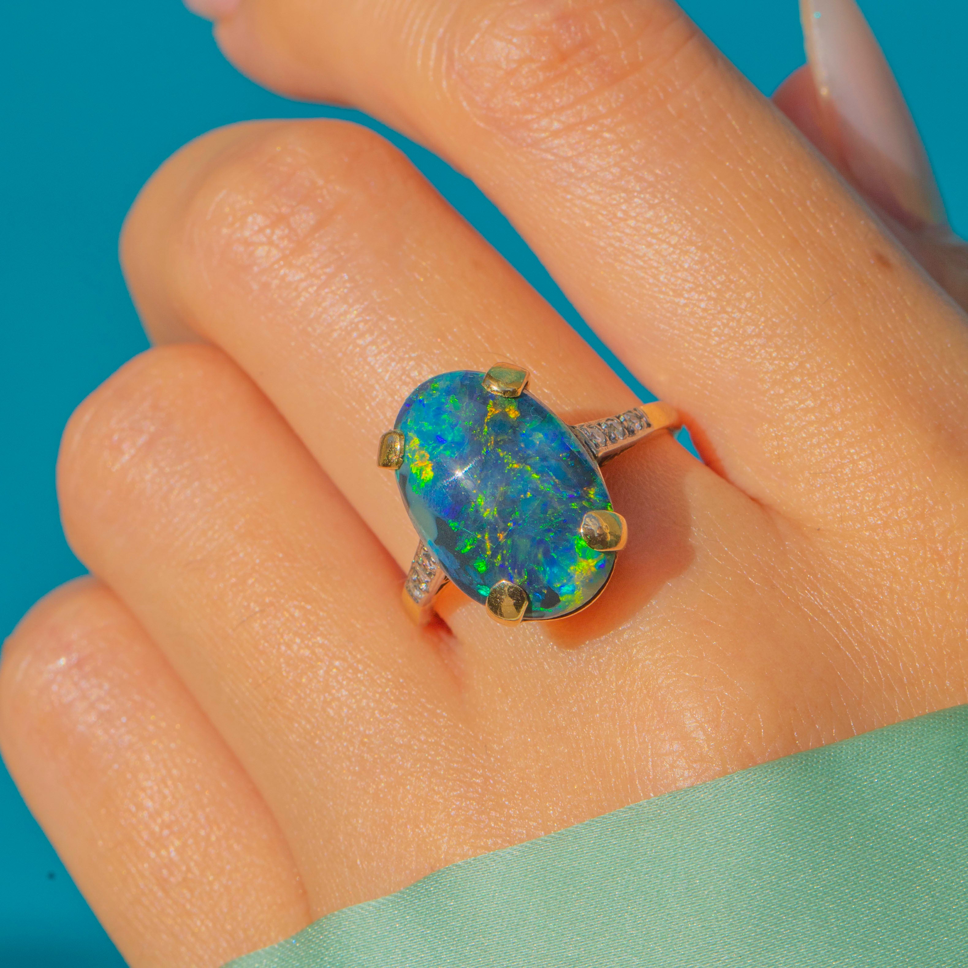 An exceptional Art Deco ring featuring a certified solid Black Opal weighing 4.60cts, set in 18ct Gold with White Gold settings and Diamond shoulders. The oval cabochon displays a mesmerising play of colour, a hallmark of the finest Black Opals, and sits proudly within its elegant Art Deco mount.
