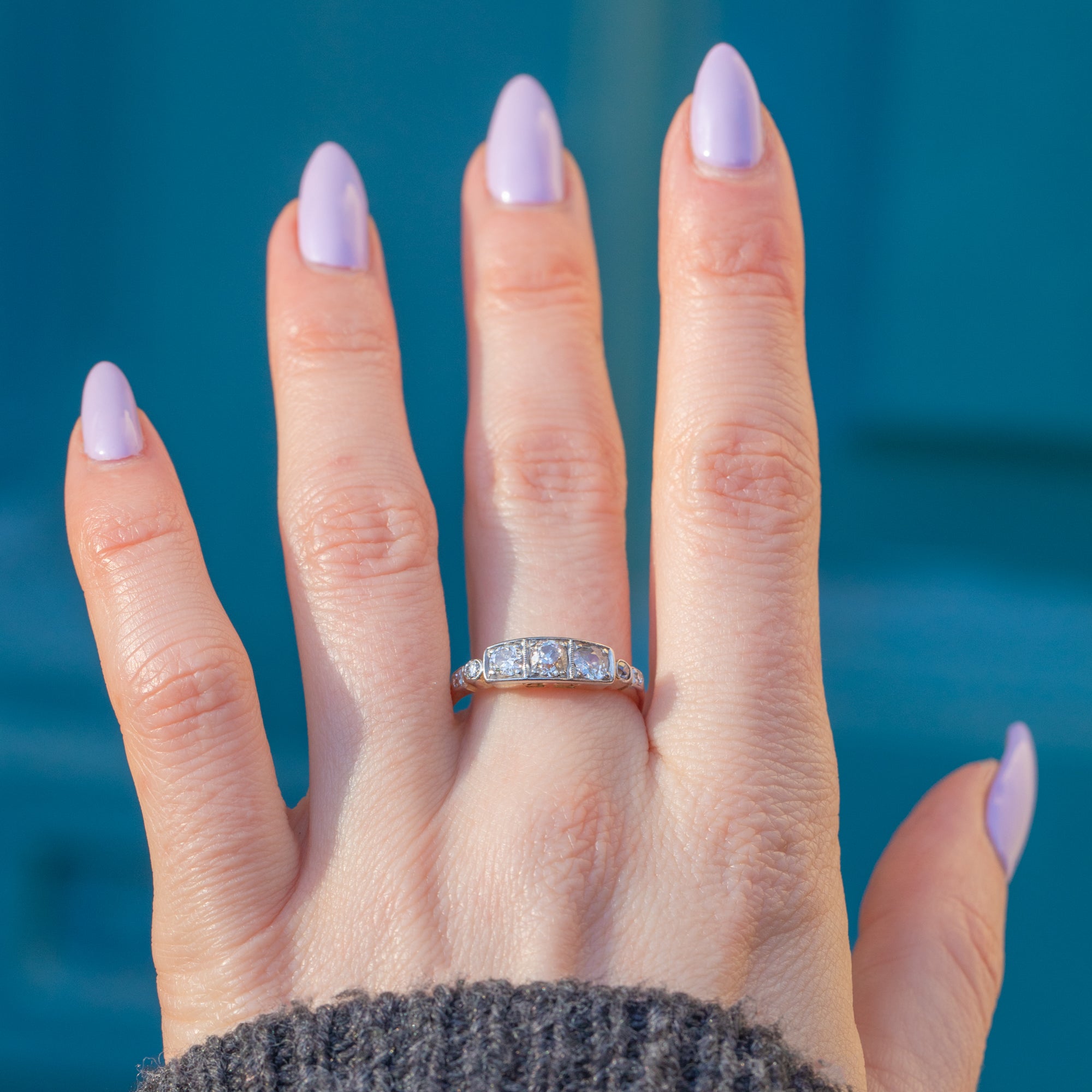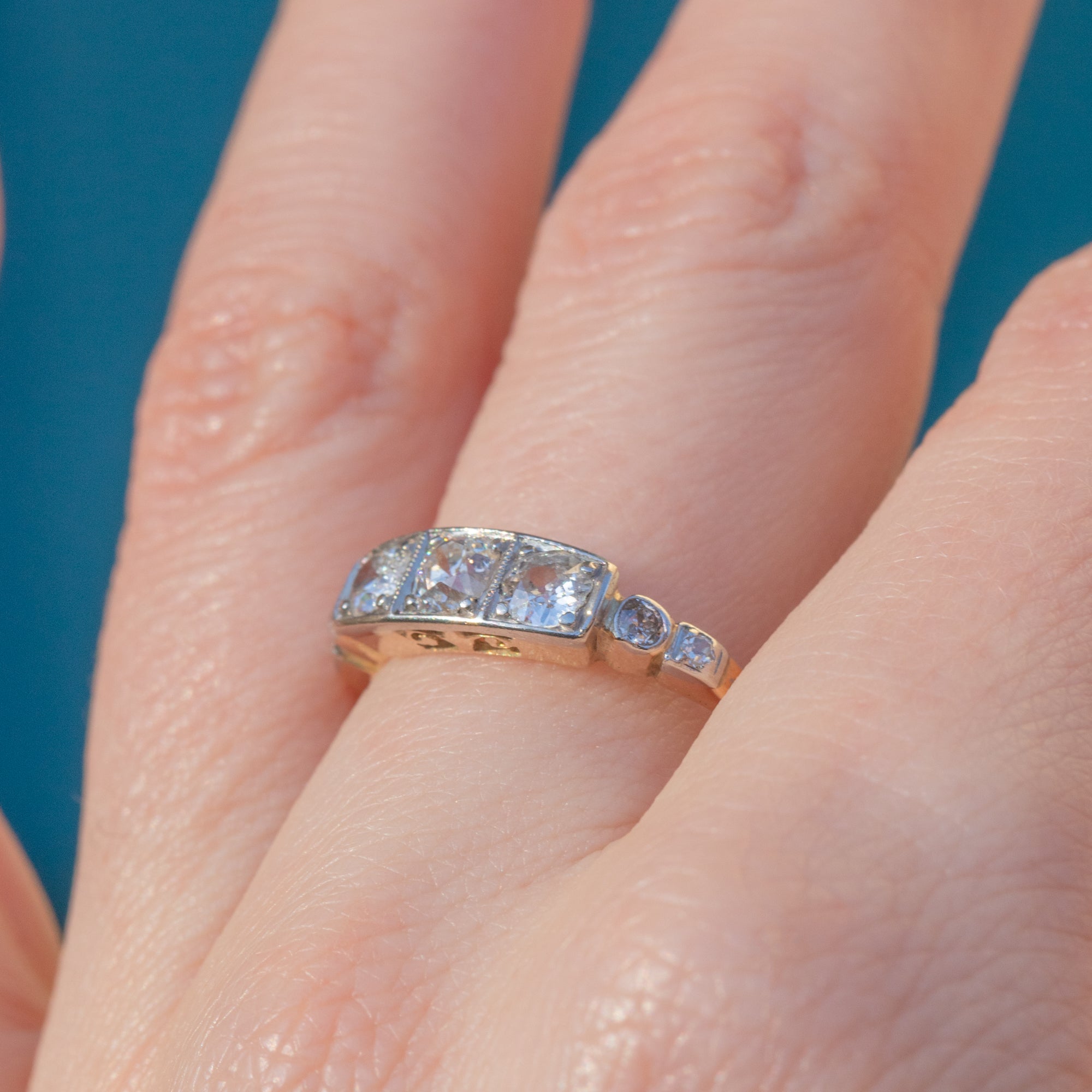 Boasting seven Diamonds, with three gorgeous central Old-European-cuts, this 0.60ct Diamond ring twinkles from all angles. A testament to Art Deco craftsmanship, she is bold yet elegant, with her antique Diamonds effortlessly complemented by her 18ct White Gold settings.