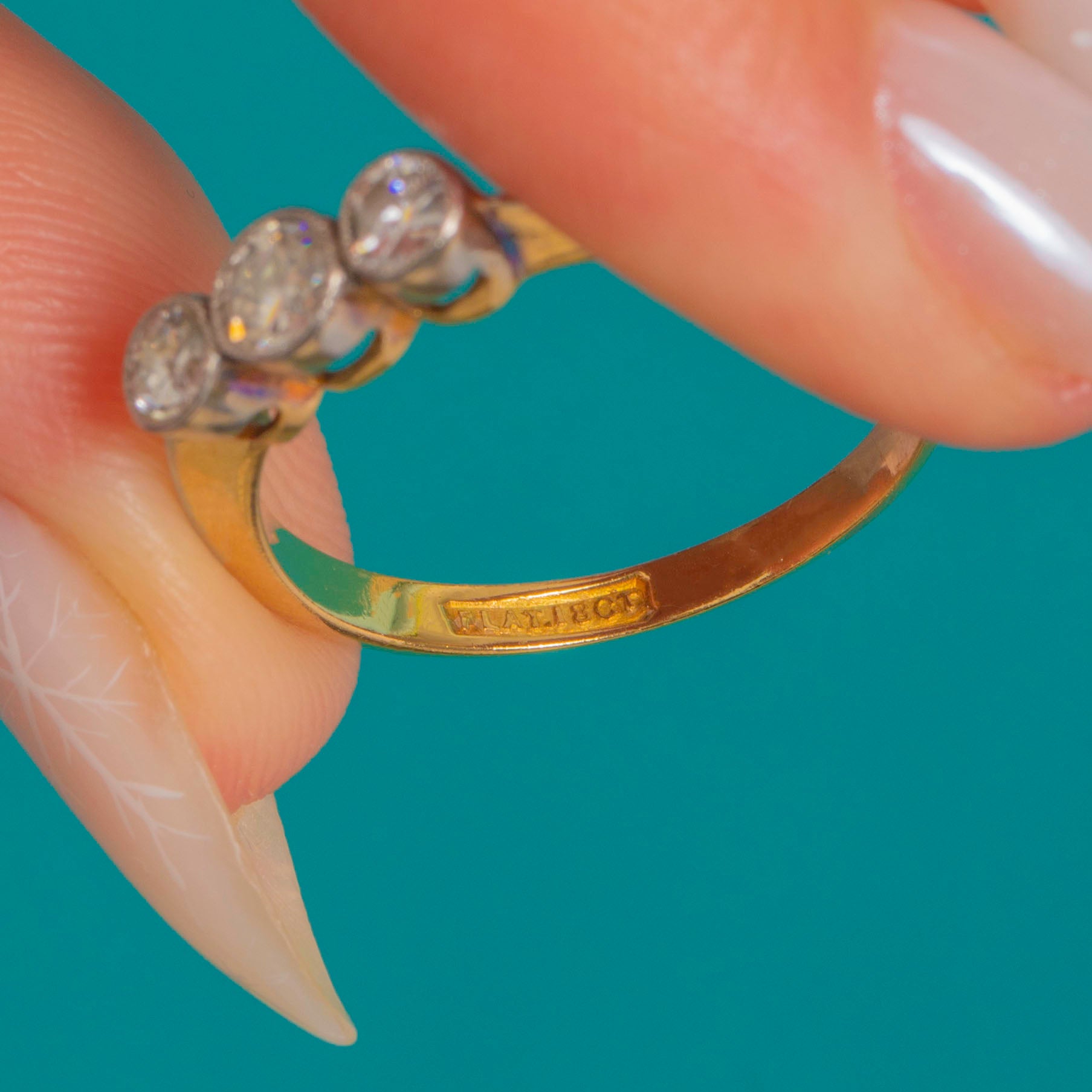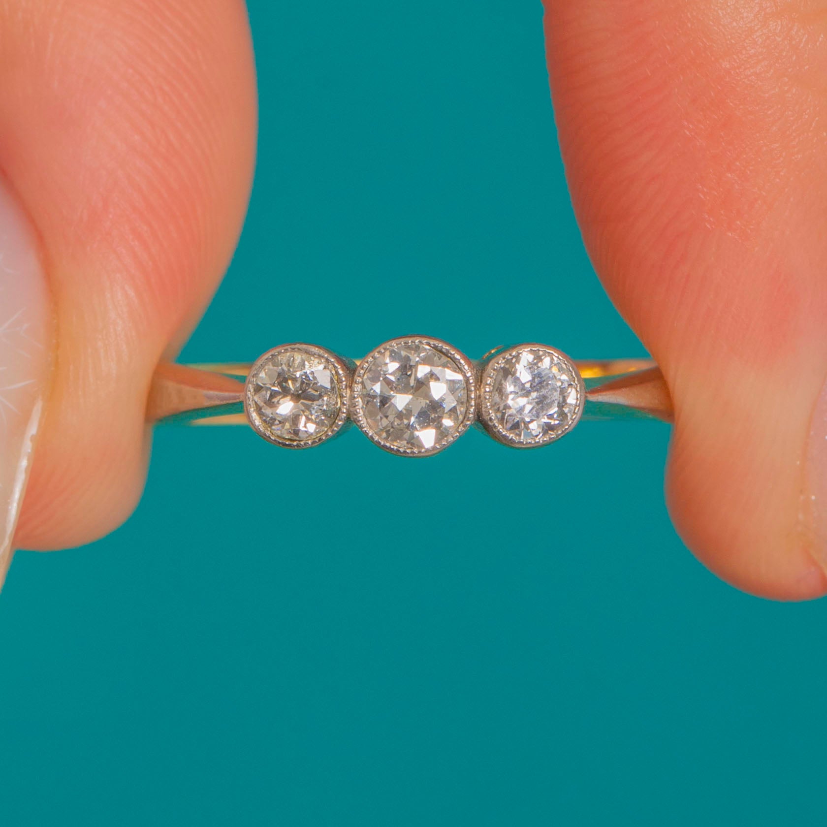 This beautifully balanced Art Deco trilogy ring pairs warm 18ct Gold with crisp Platinum millegraine settings, creating that instantly recognisable early 20th century contrast. Across the top sit two Old European cut Diamonds flanking a rare 1930s Transitional cut centre stone, all chosen for their bright, lively sparkle and old-world charm.