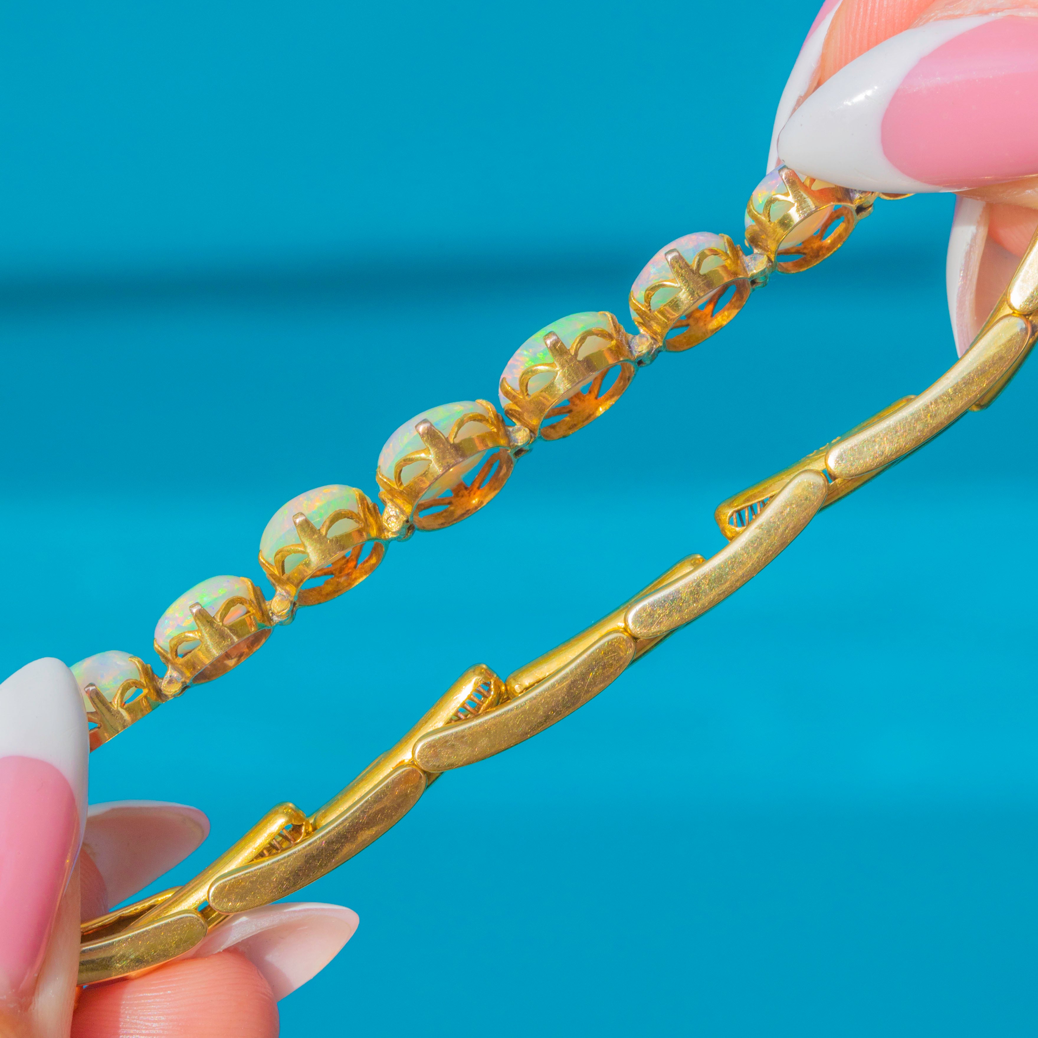 This Art Deco 18ct Gold expanding bracelet features nine graduated Opals with 9ct Gold settings. Its adjustable design sits comfortably on the wrist, showcasing the natural fire and vibrant colours of each stone. The bracelet combines practicality with refined Art Deco elegance, making it a timeless piece for everyday wear or special occasions.