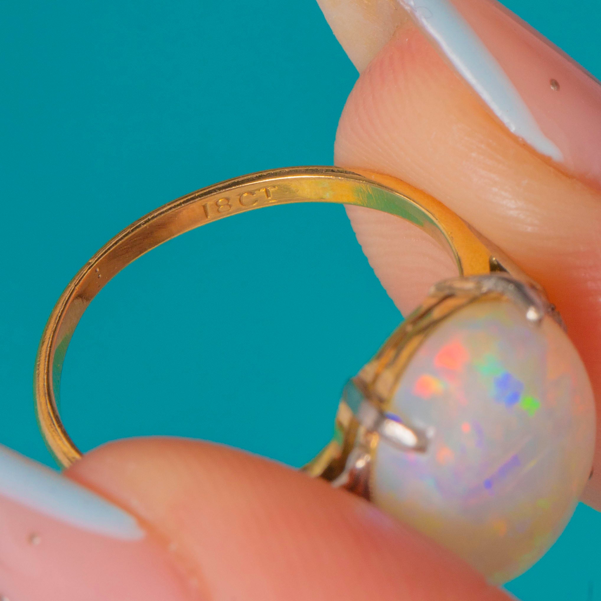 VERY GOOD-EXCELLENT: The Opal is smooth and glossy with vibrant play-of-colour and no chips observed; only light, age-appropriate surface wear. The White Gold settings are crisp with secure claws and fine milgrain detail, showing gentle patina consistent with age. The Yellow Gold shank is strong with a neat previous sizing seam visible to the underside.