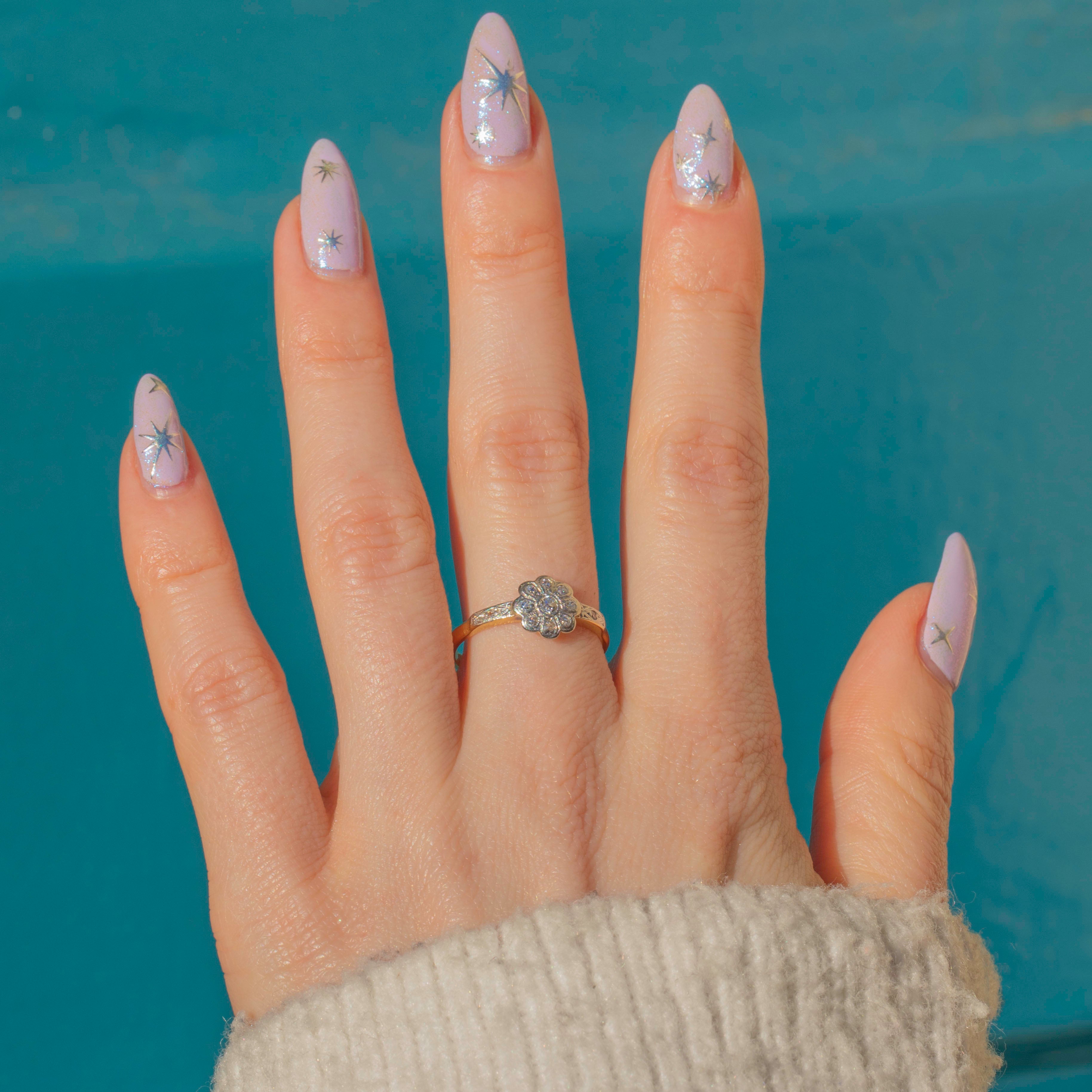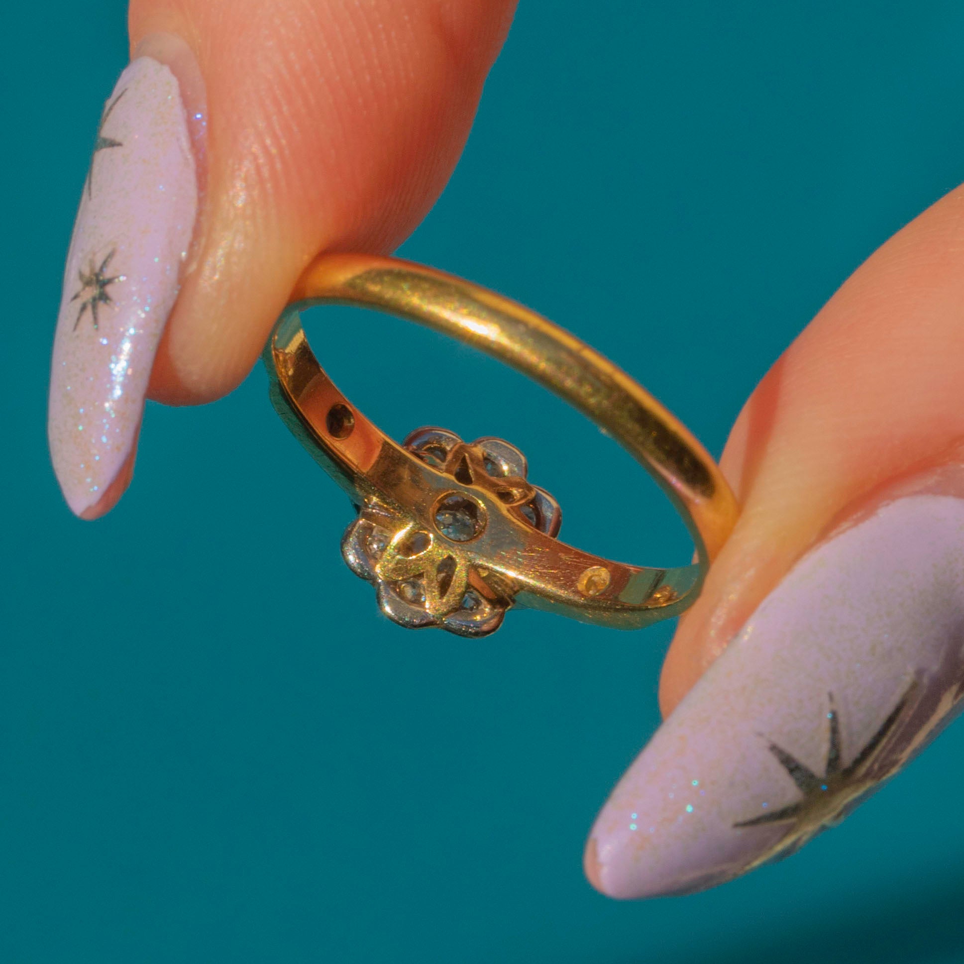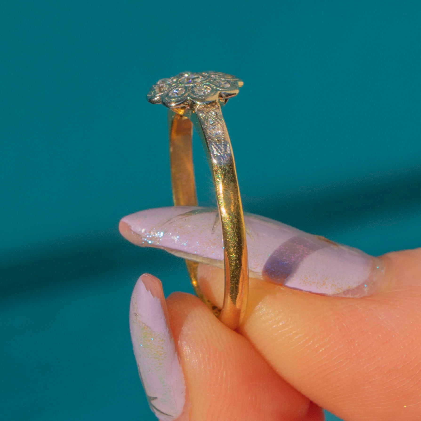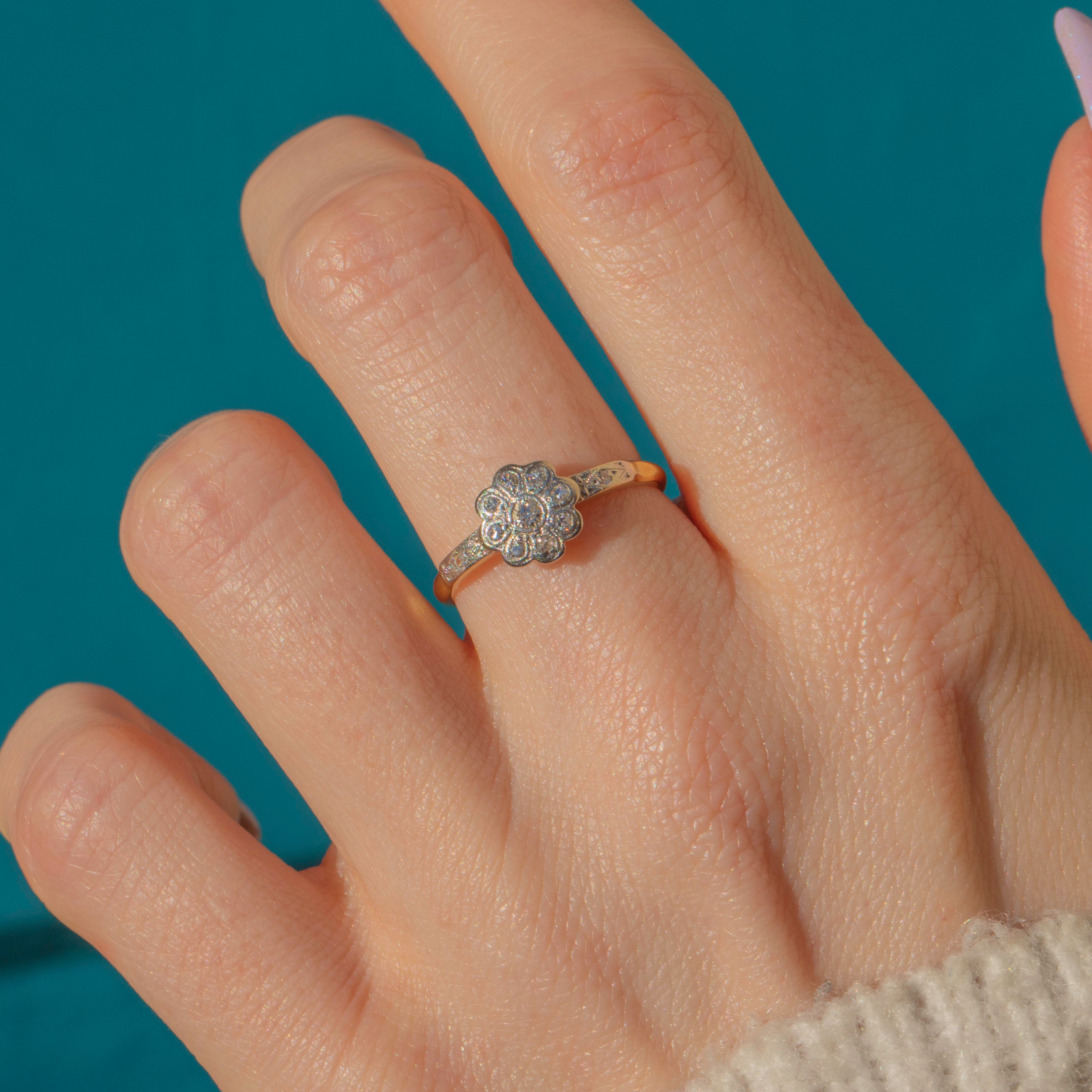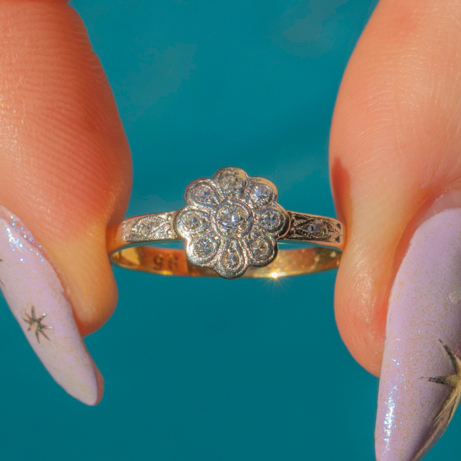 This Art Deco 18ct Gold & Platinum Diamond daisy cluster ring is a timeless treasure. A beautiful flower with an everlasting bloom, this antique ring features a cluster of scintillating Diamonds in a daisy motif, giving her a feminine allure.