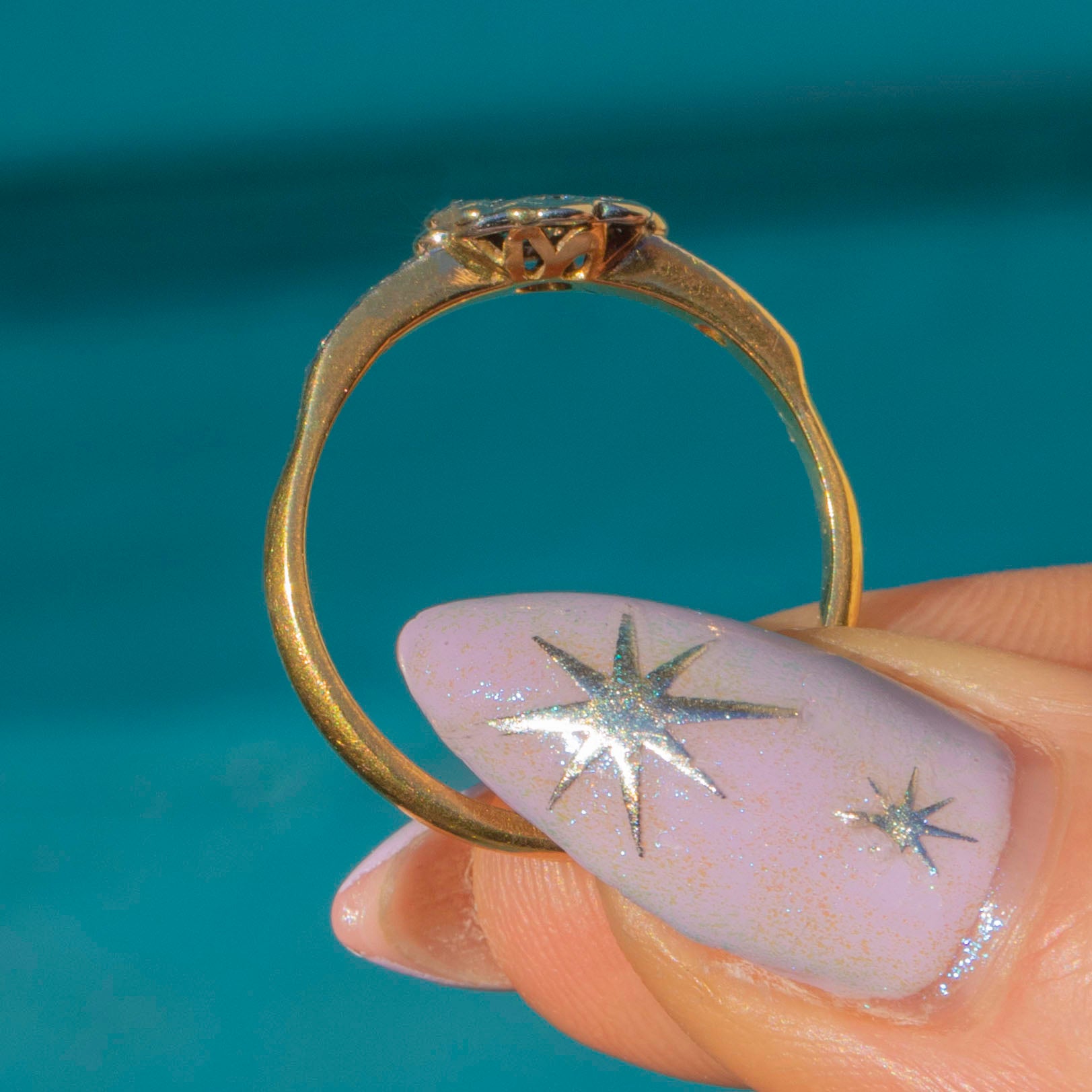 In quintessential Art Deco style, she is crafted from a combination of 18ct yellow Gold and Platinum making her a robust piece perfect for daily wear. She has a beautiful presence on the finger and with 0.15cts of bright and lively Diamonds, she would make a wonderful choice for an engagement ring!