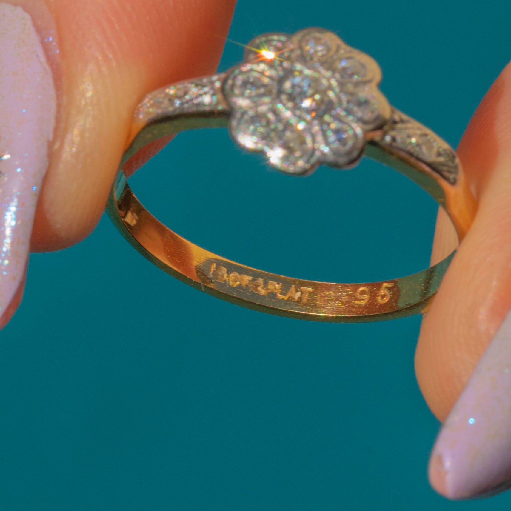 EXCELLENT. This antique 18ct Gold and Platinum Diamond cluster ring is in excellent condition. The Diamonds are secure in their Platinum settings, free from scuffs or scratches. The inside of the ring is clearly stamped 18CT&PLAT. With a sturdy yellow Gold band, this Art Deco ring is the perfect forever piece!