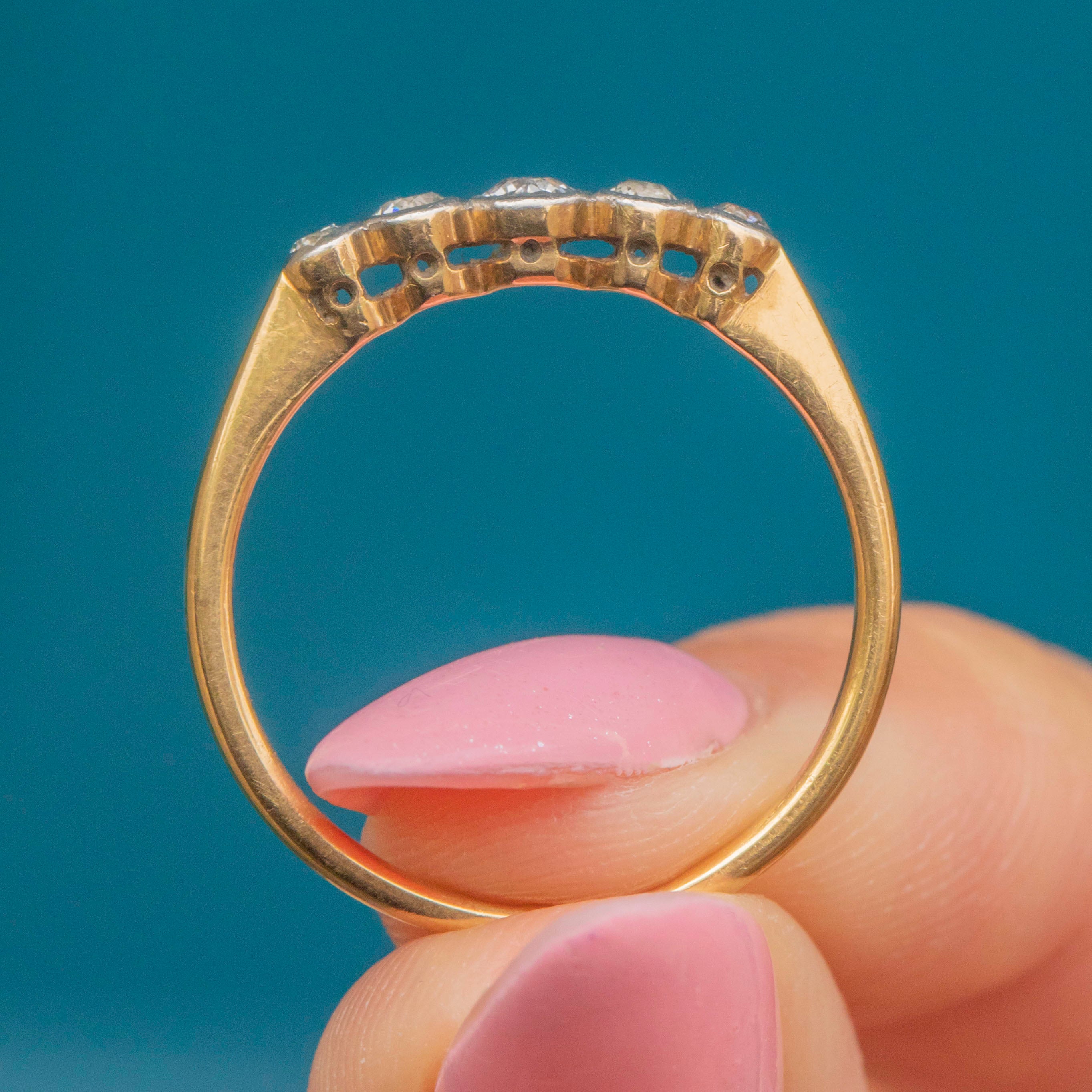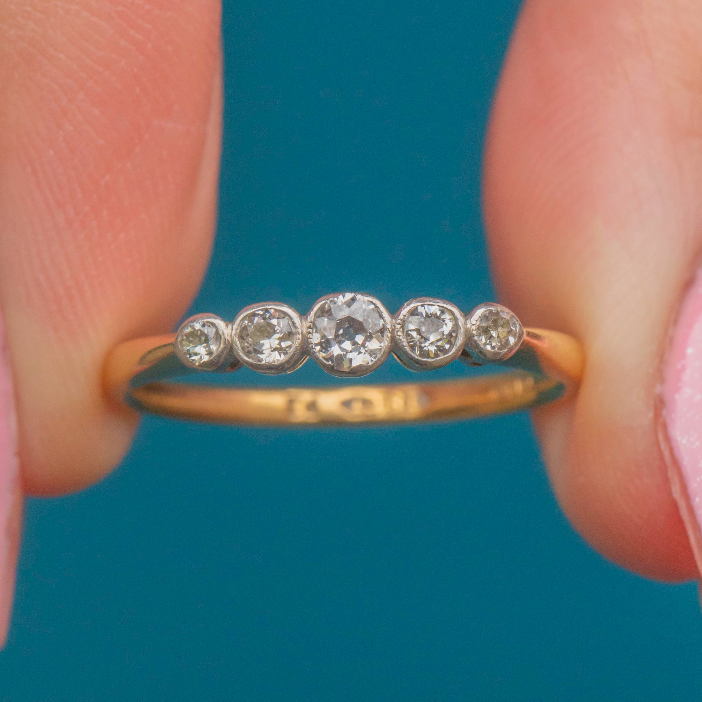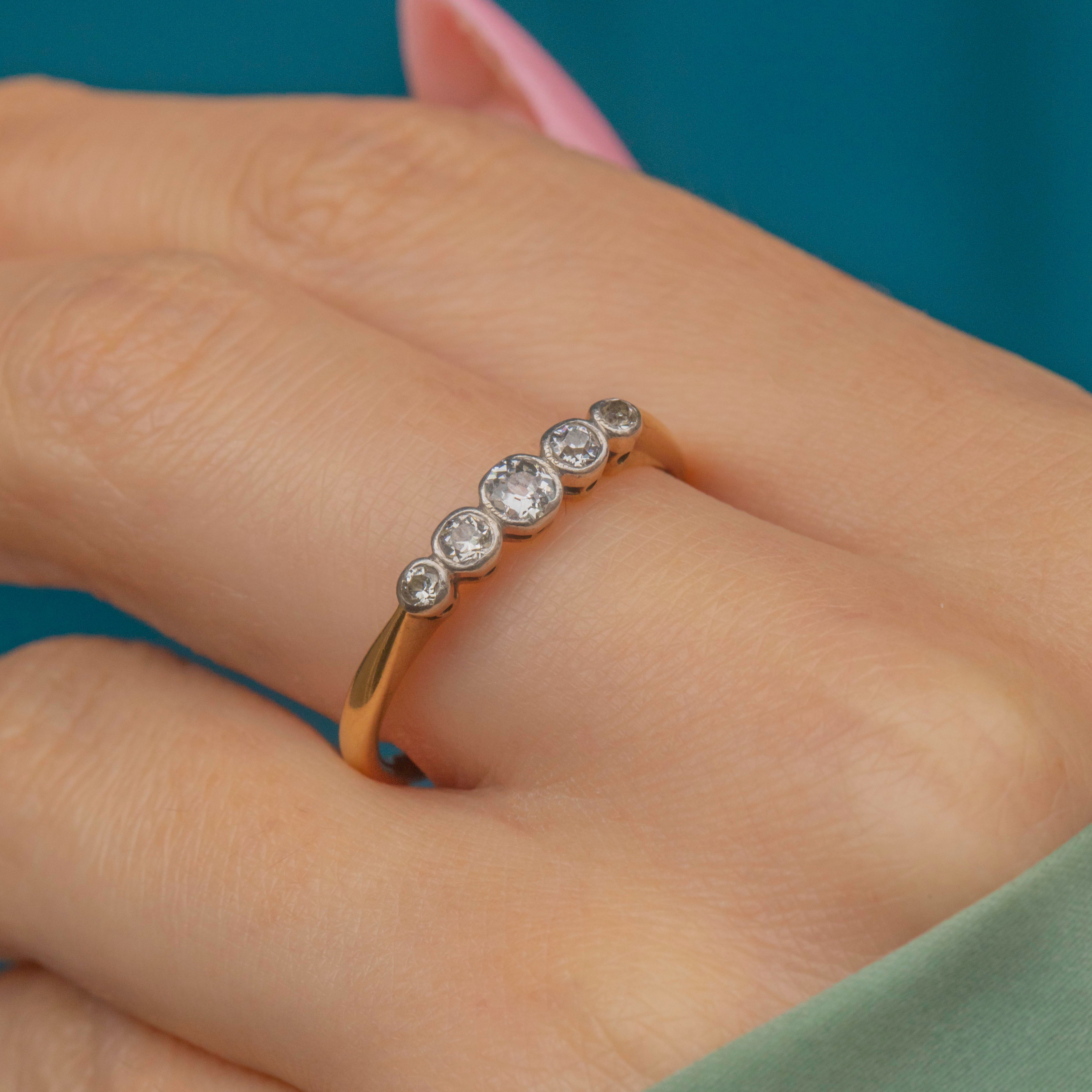 Boasting five scintillating graduating Diamonds, with a distinct shimmer set within glossy Platinum settings, this antique ring dazzles from every angle. Her dainty Diamonds rest on a buttery warm 18ct Gold band, giving this Art Deco ring a classic and sophisticated finish.