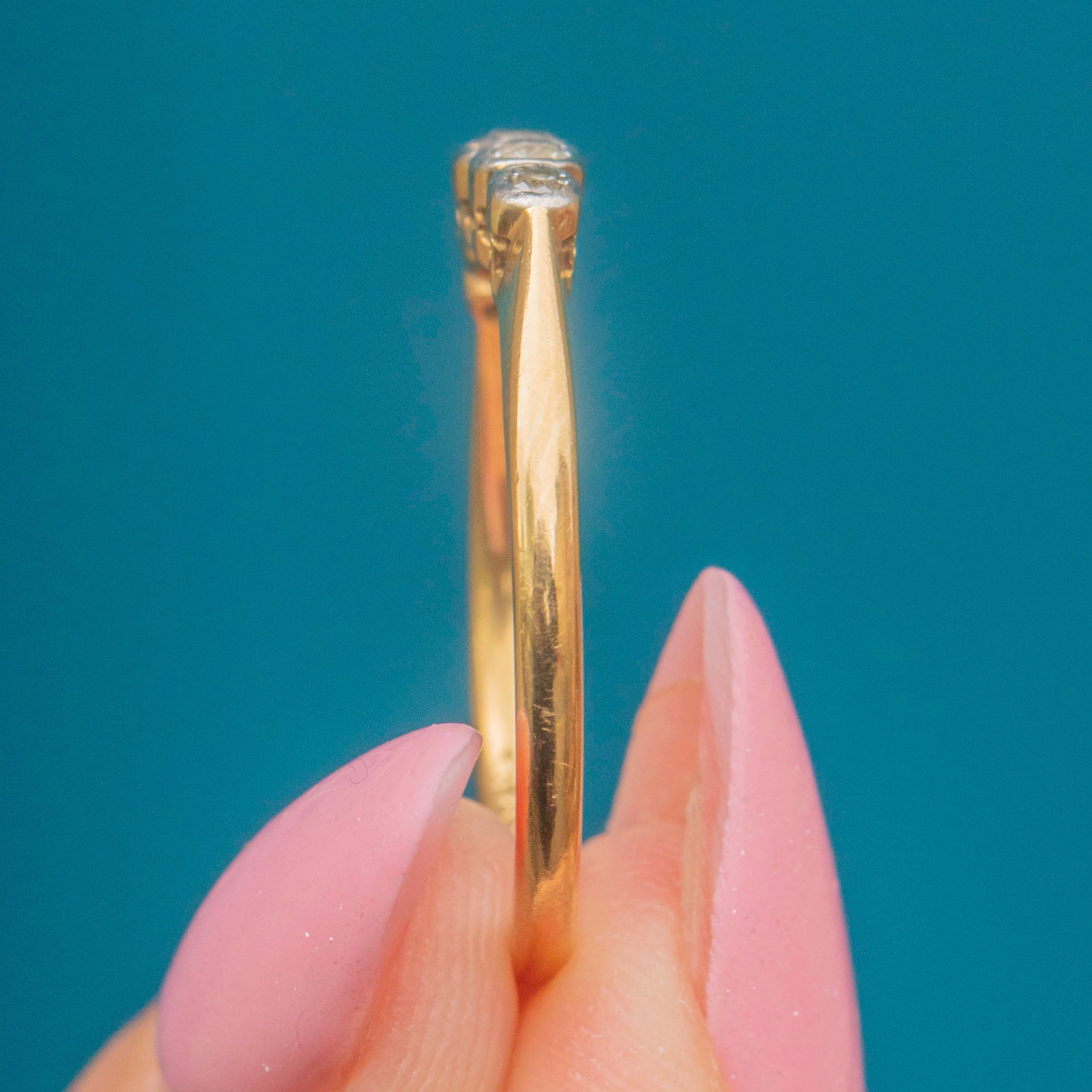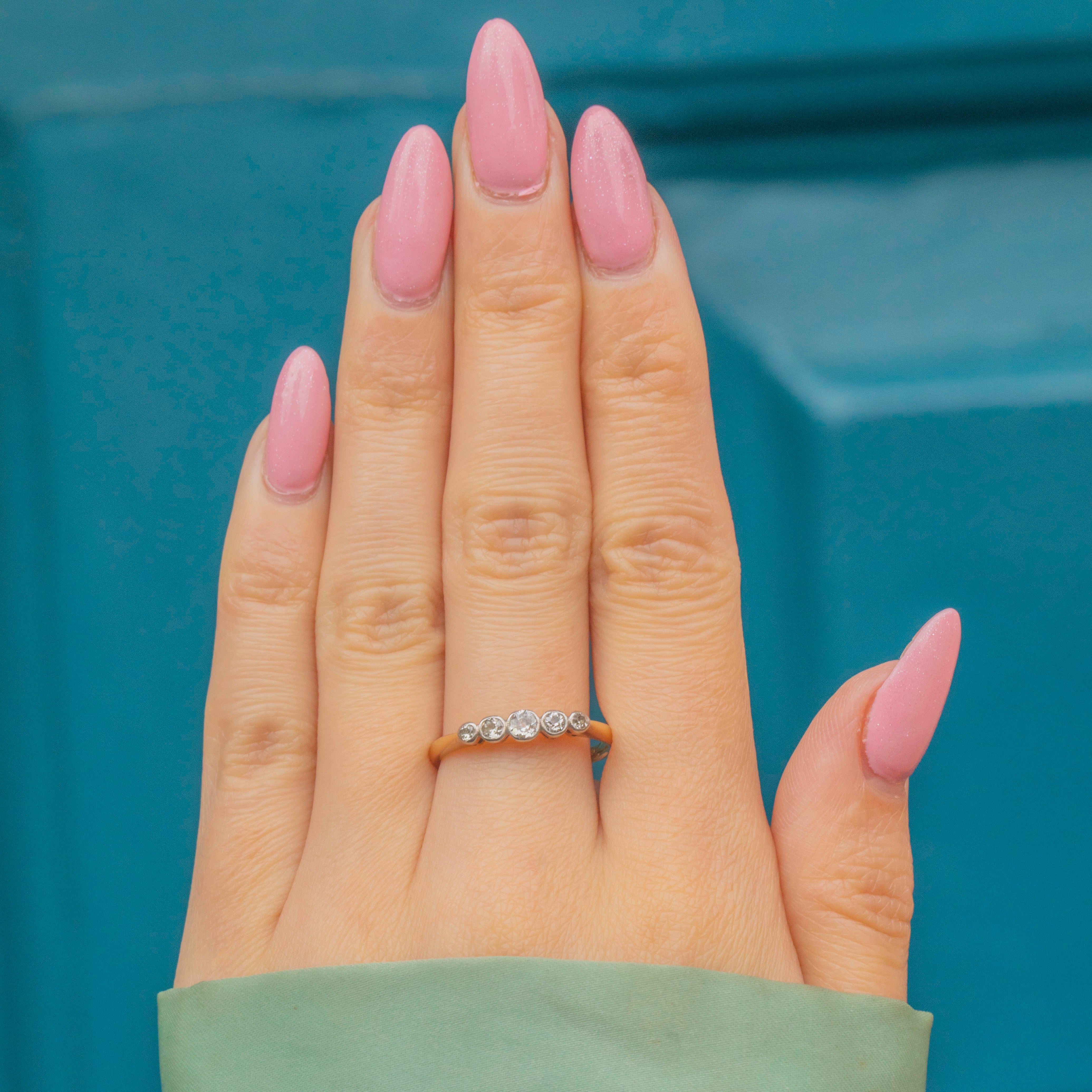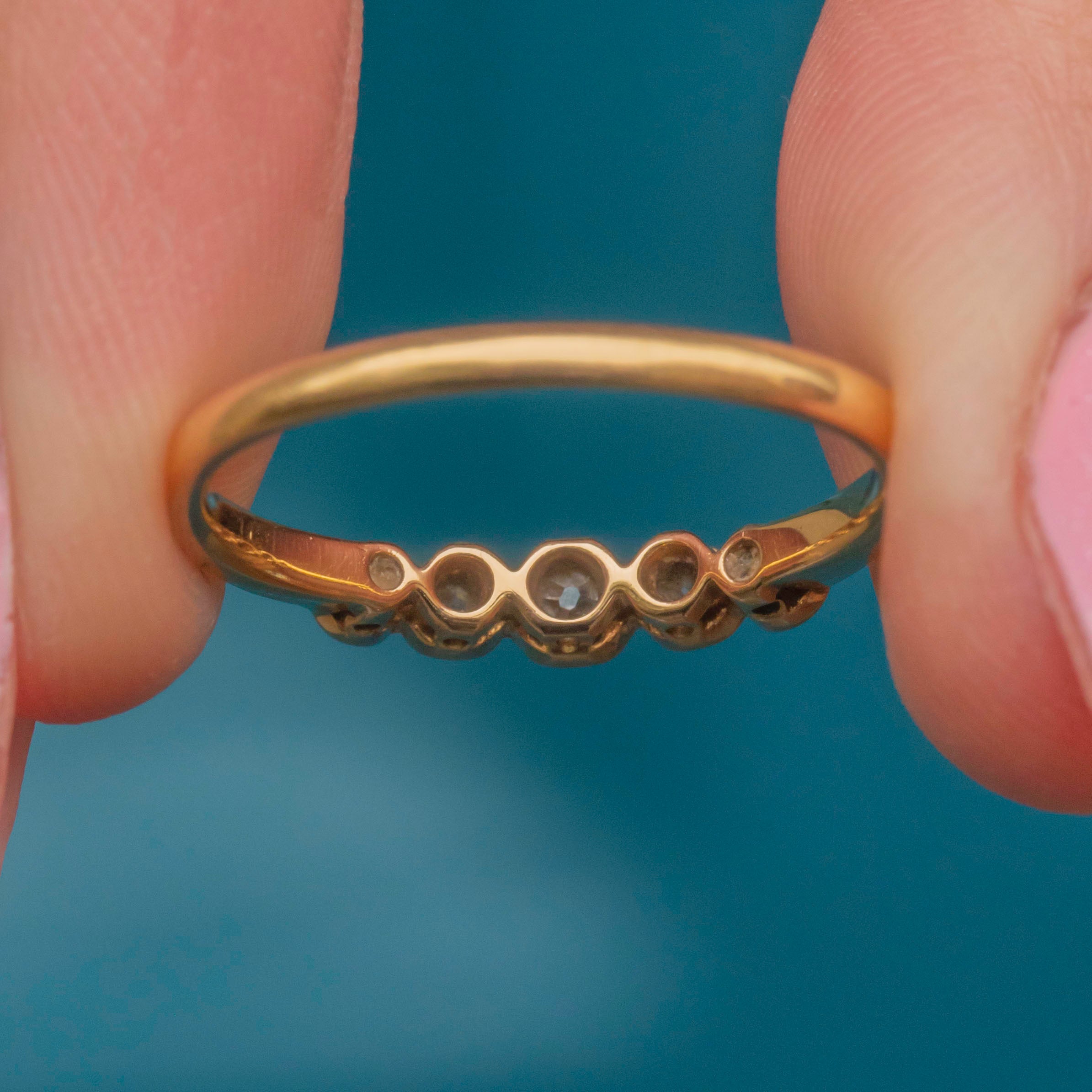 Boasting five scintillating graduating Diamonds, with a distinct shimmer set within glossy Platinum settings, this antique ring dazzles from every angle. Her dainty Diamonds rest on a buttery warm 18ct Gold band, giving this Art Deco ring a classic and sophisticated finish.