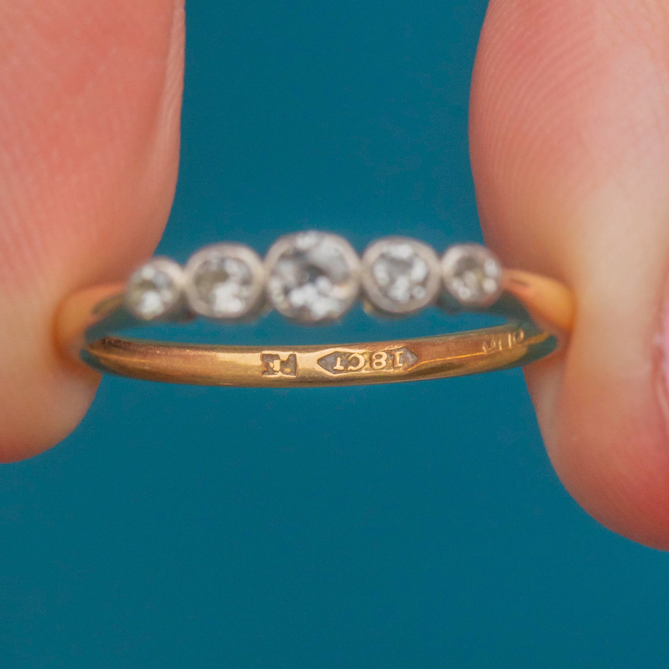 EXCELLENT: This Art Deco 18ct Gold and Platinum Diamond five stone ring is in excellent condition. Each of her Diamonds is radiant and set securely within its Platinum setting. The 18ct Gold band is robust and with little else to note, she can be worn with utmost confidence!