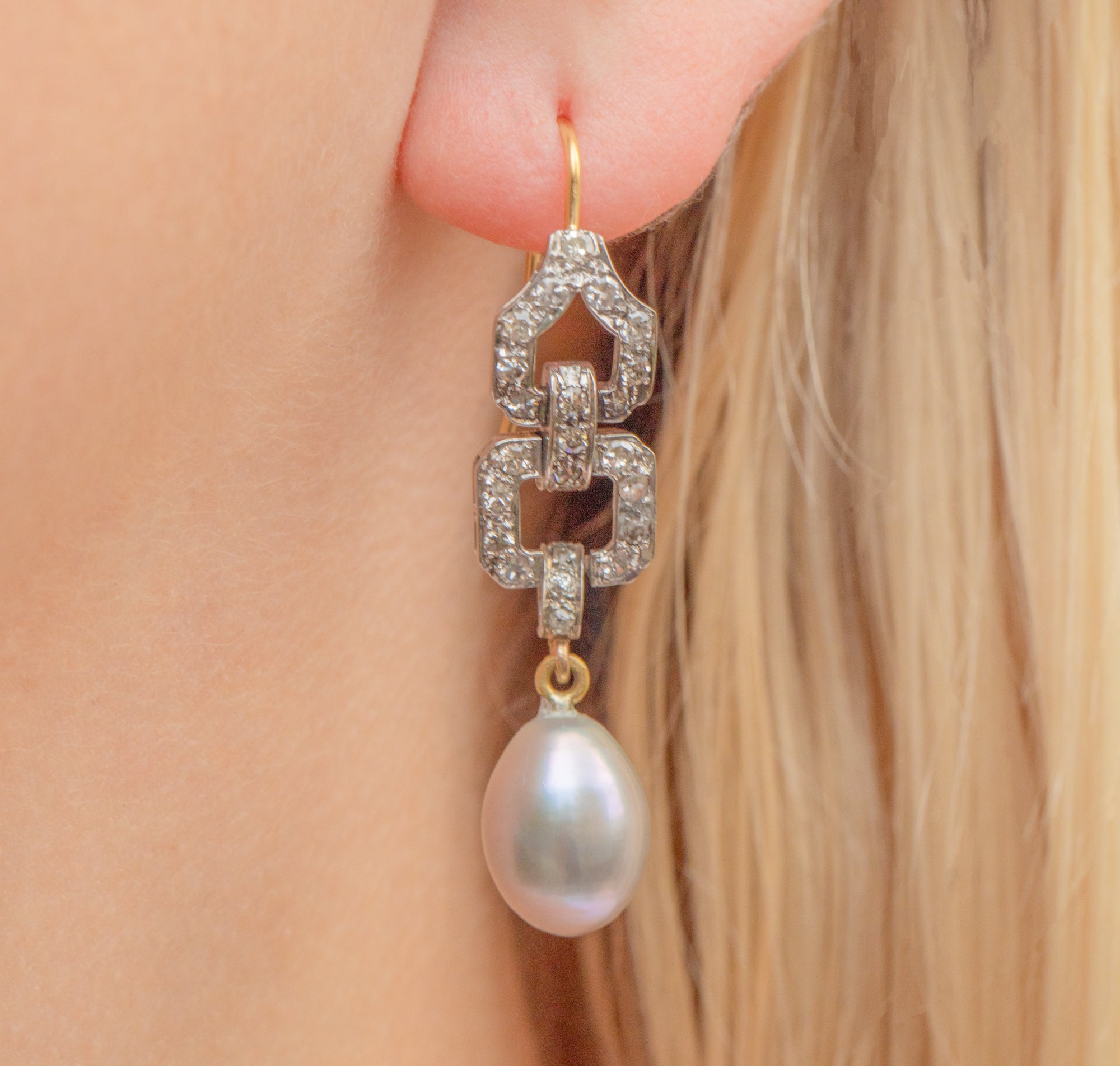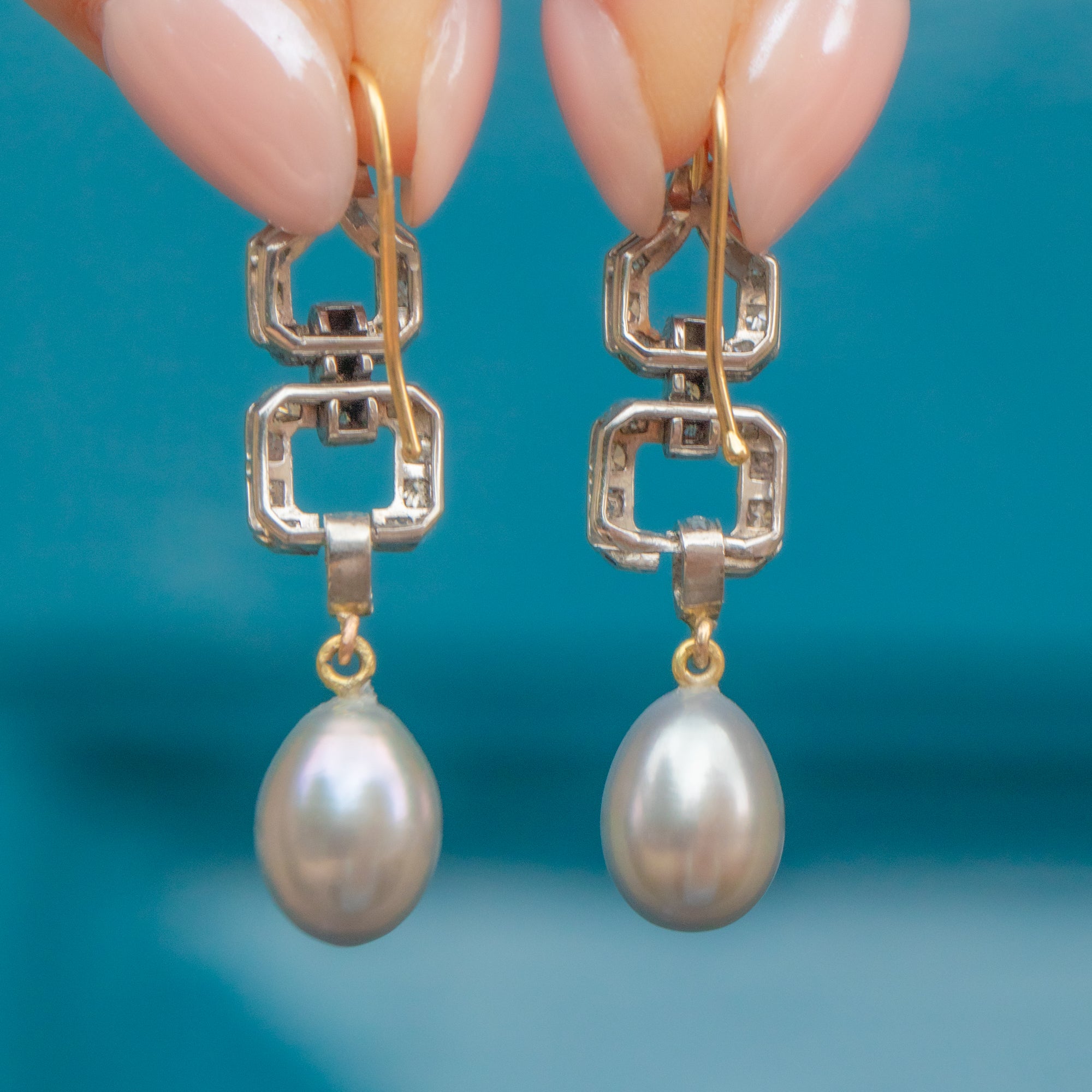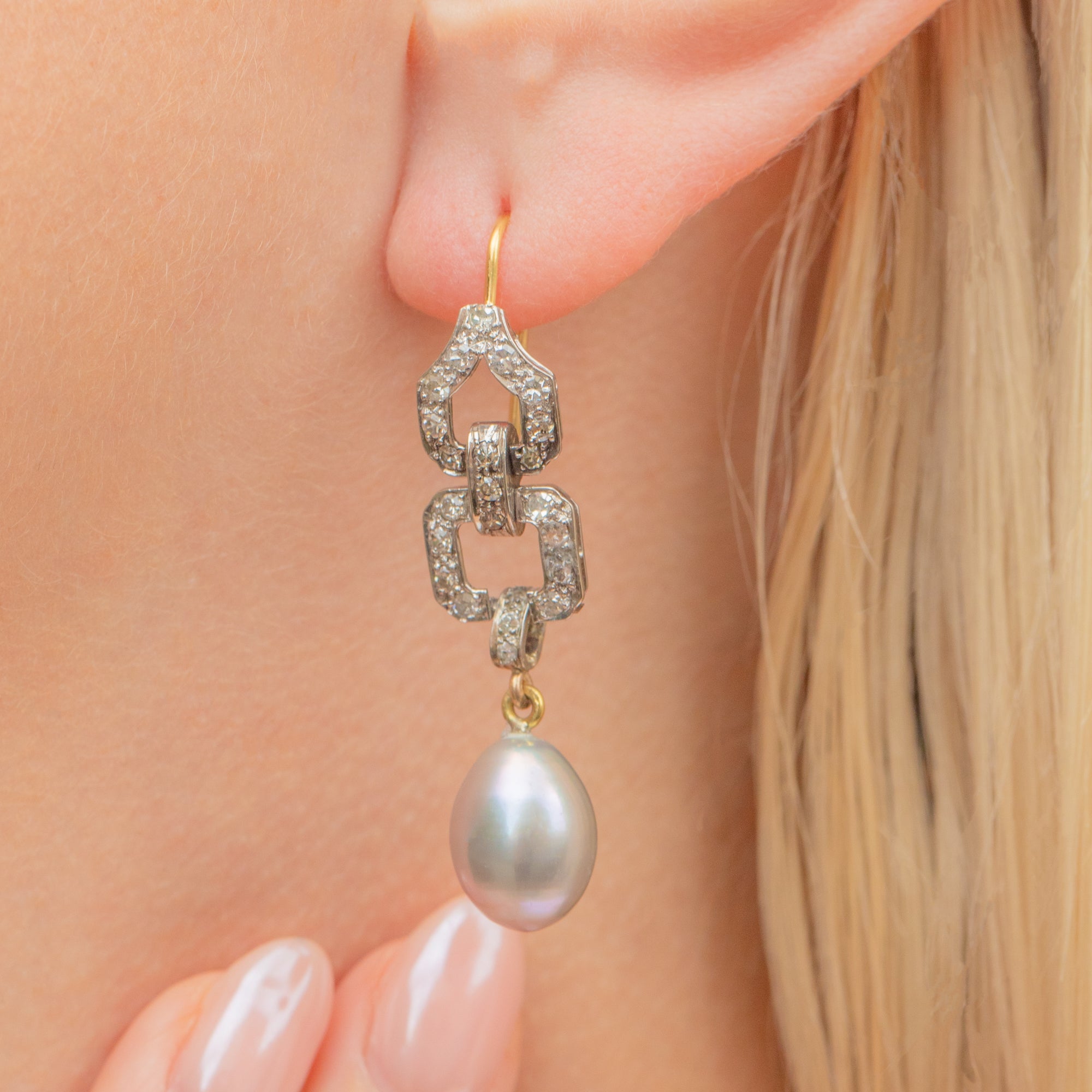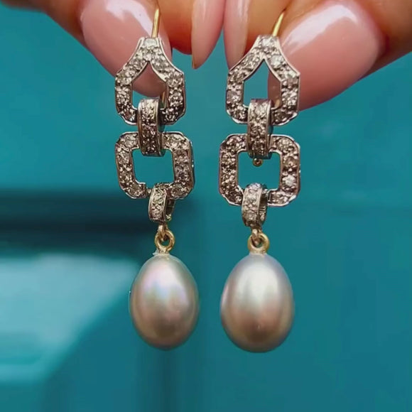 Each earring features shimmering Diamonds that dance with the light, with drops formed of Pear shaped Pearls with an exceptional silver shimmer, embodying classic beauty. Whether chosen for a special occasion or as a daily expression of elegance, these Art Deco earrings will elevate any outfit, showcasing exceptional craftsmanship and refined taste.