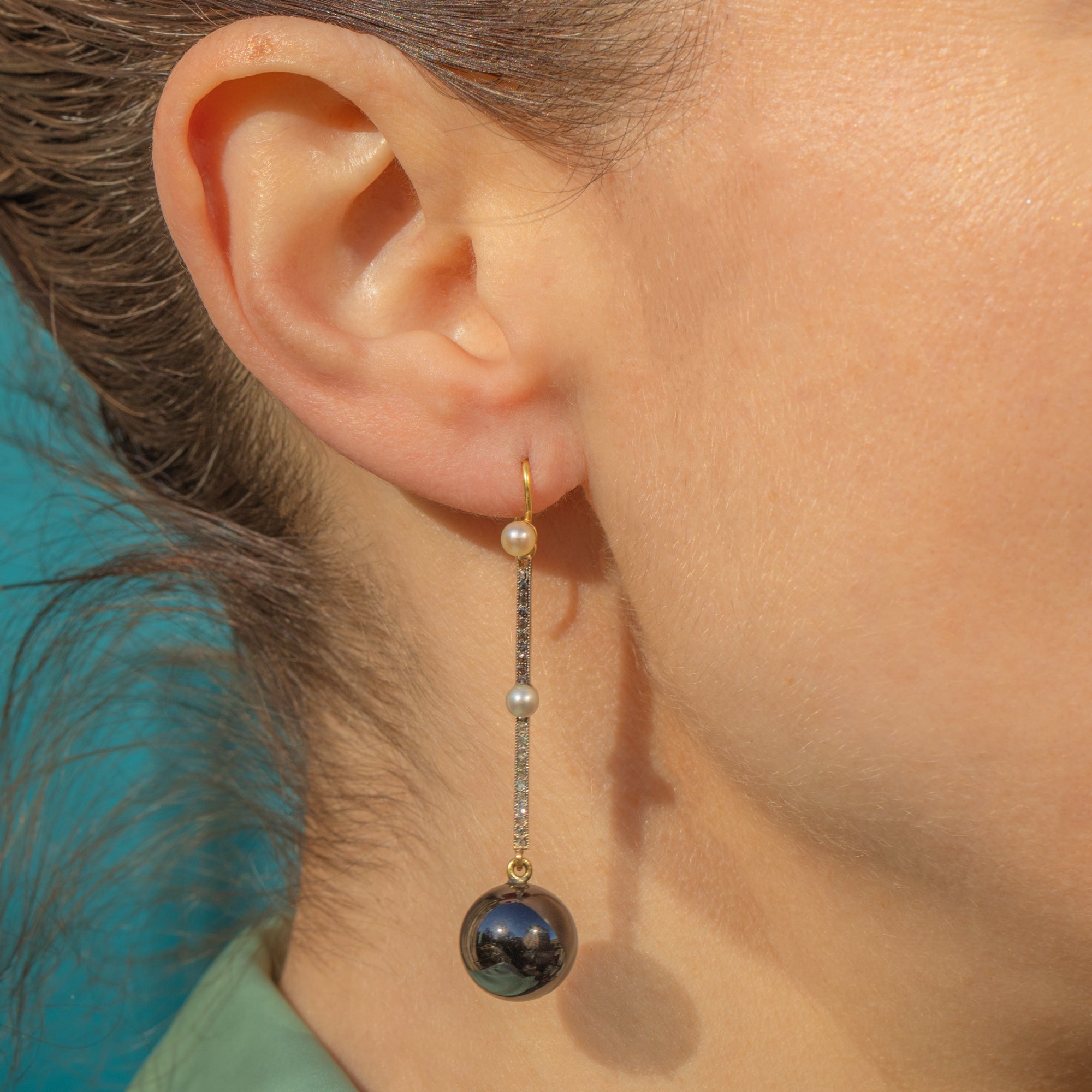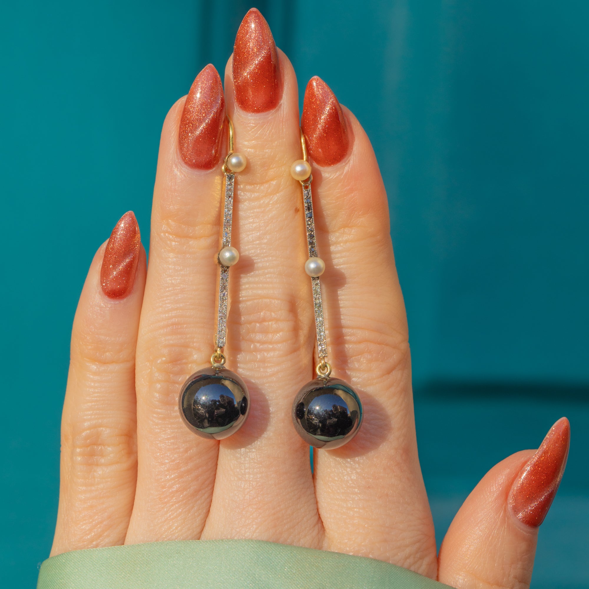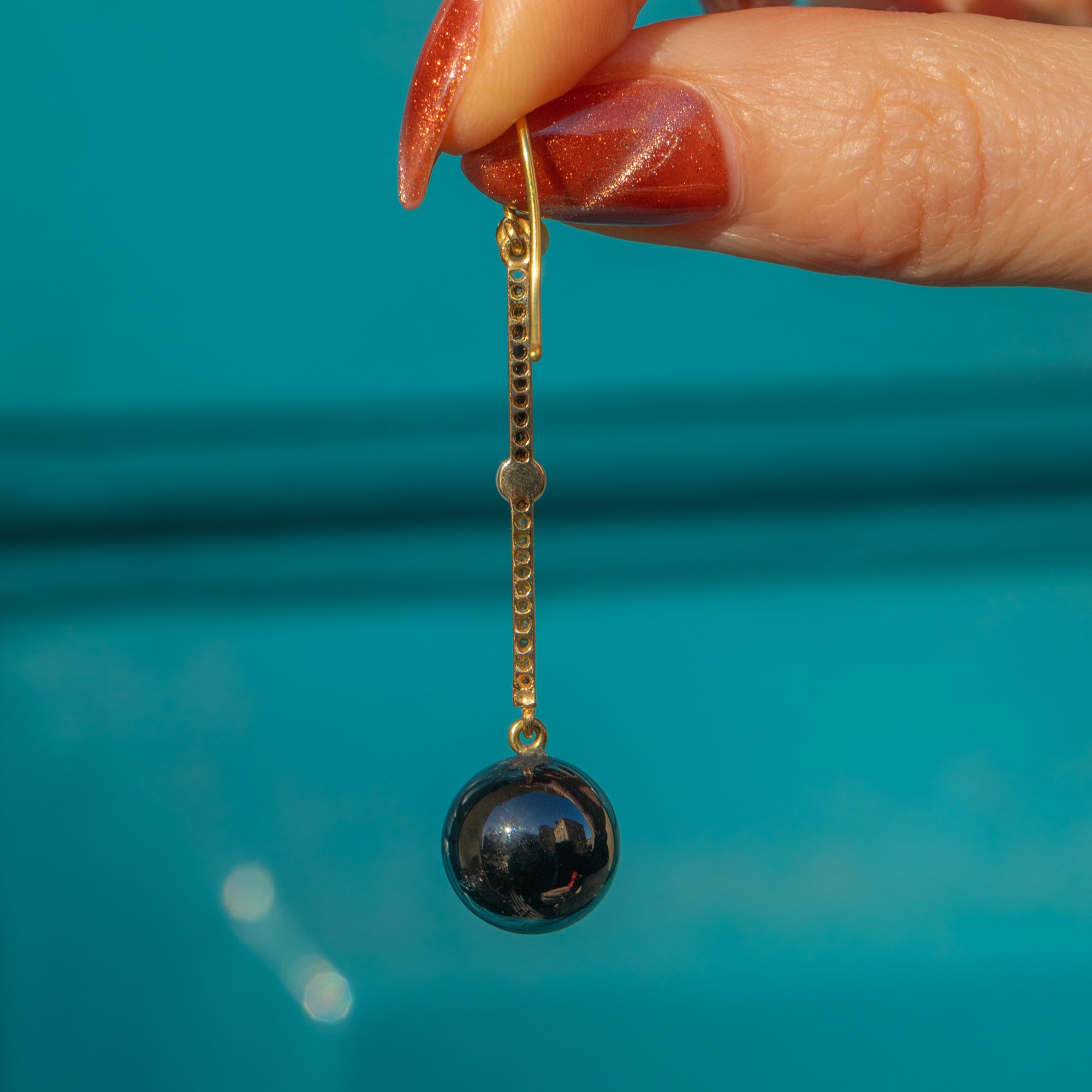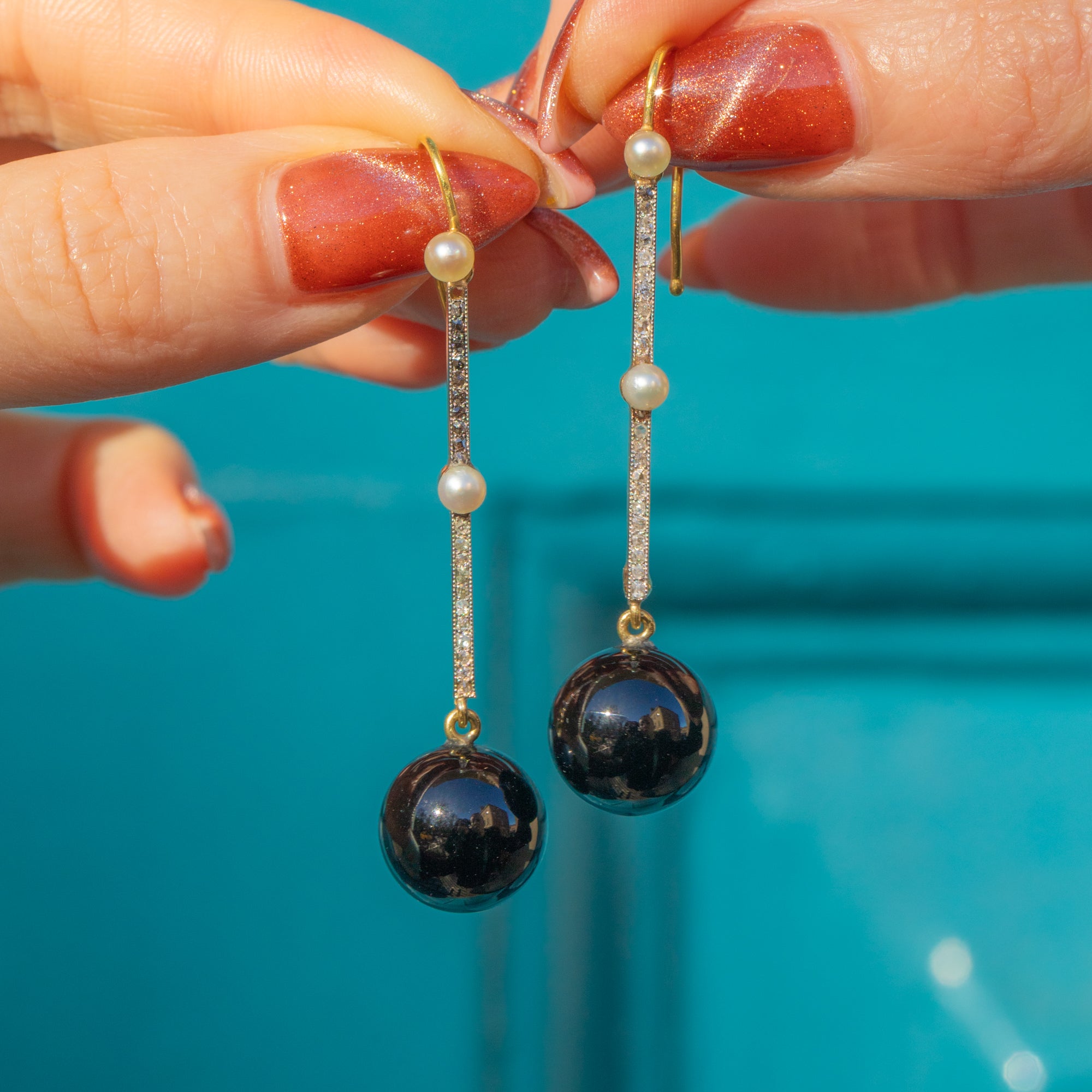 These Art Deco 18ct Gold & Platinum Onyx Diamond drop orb earrings are such an opulent pair! Each earring boasts a glossy Onyx sphere suspended from a gorgeous Diamond-encrusted bar, which twinkles from afar, accented by two lustrous Pearls.
