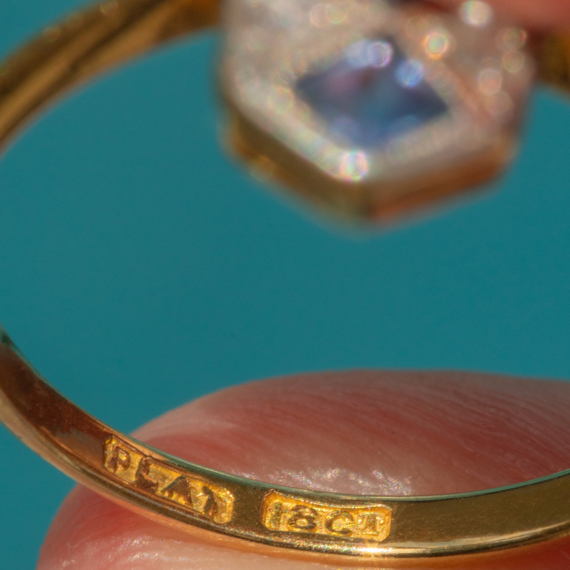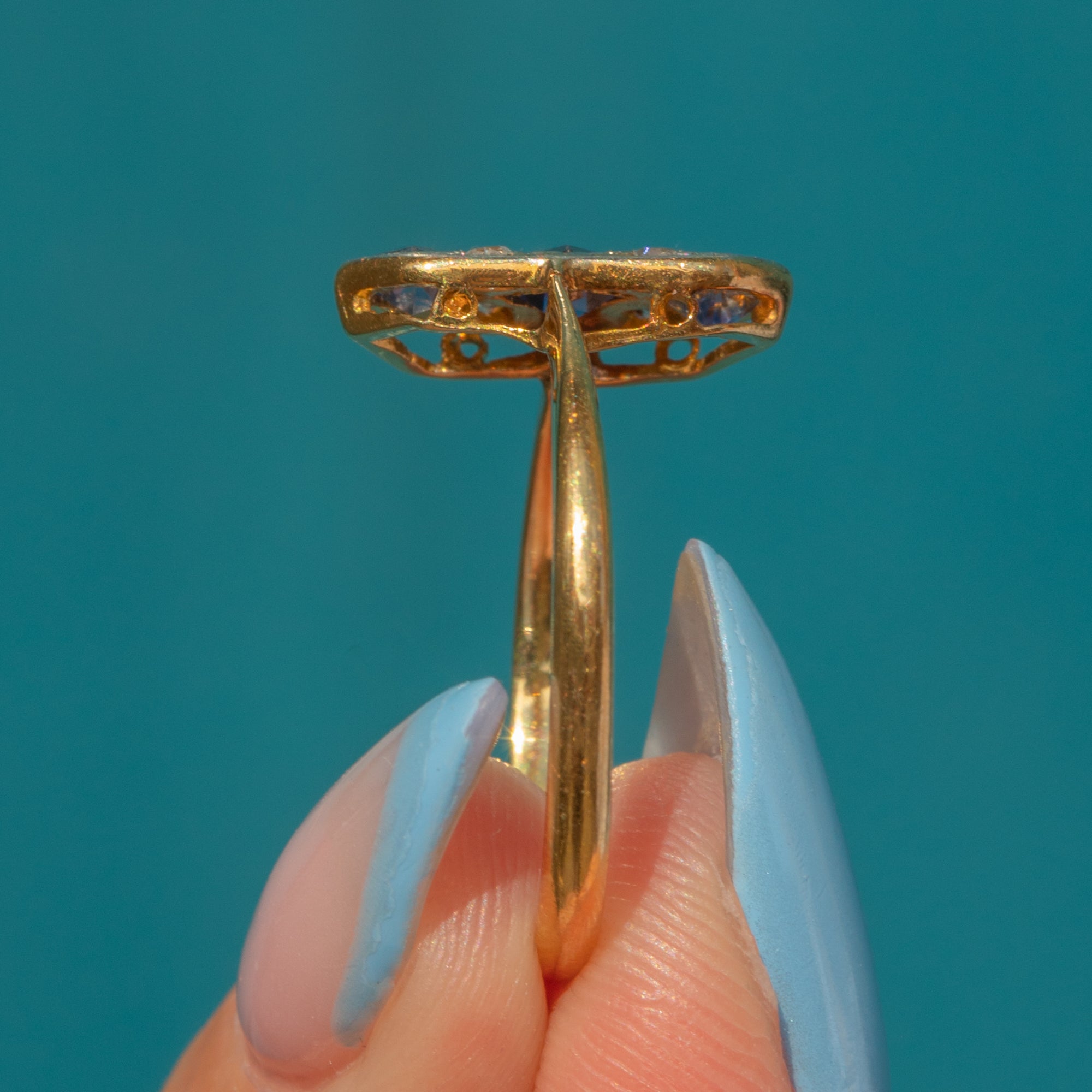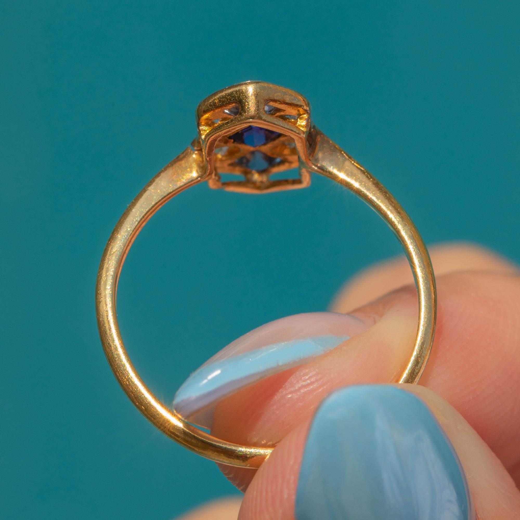 Crafted into a panel design, this quintessentially Art Deco ring provides wonderful finger coverage. Complete with a buttery 18ct Gold band, this antique Sapphire and Diamond ring is a wonderful option to add a pop of colour to your collection!