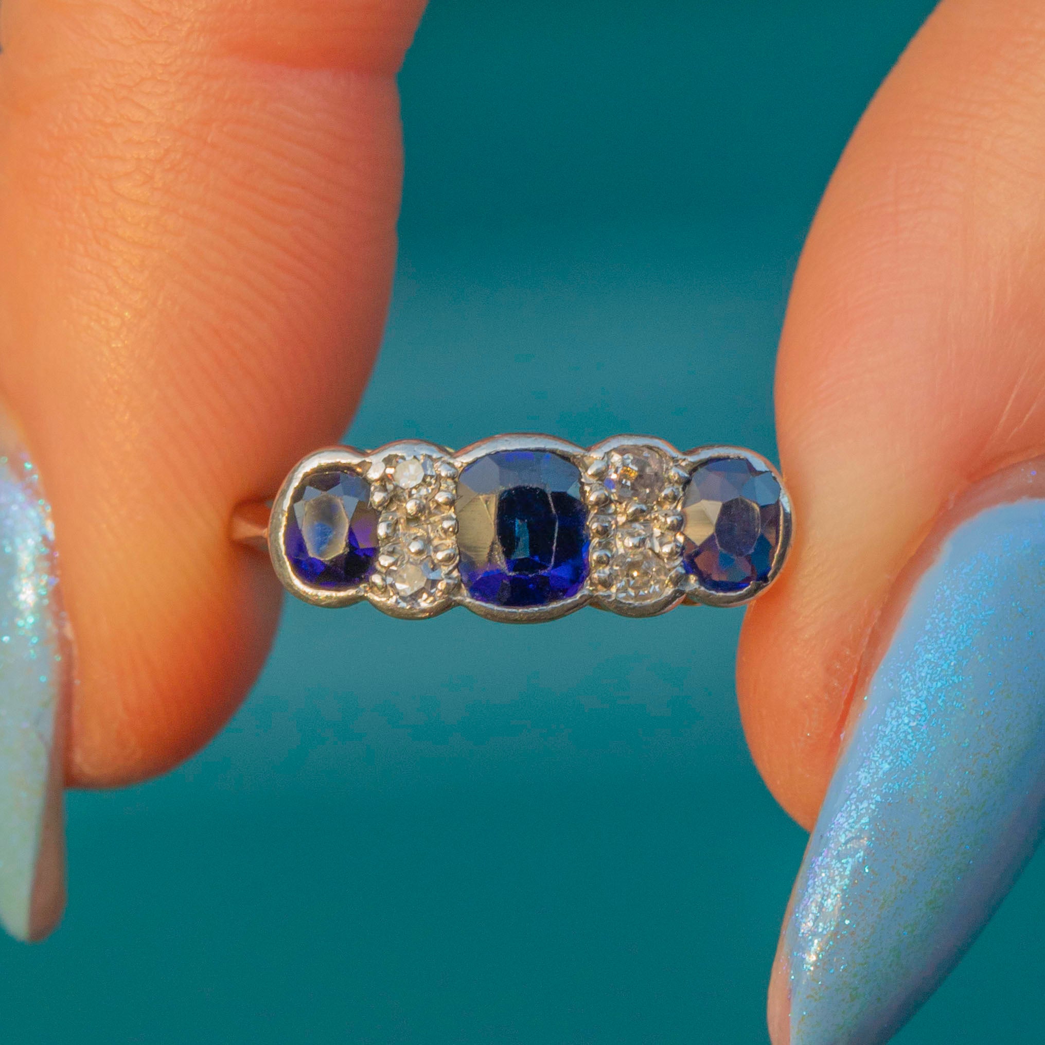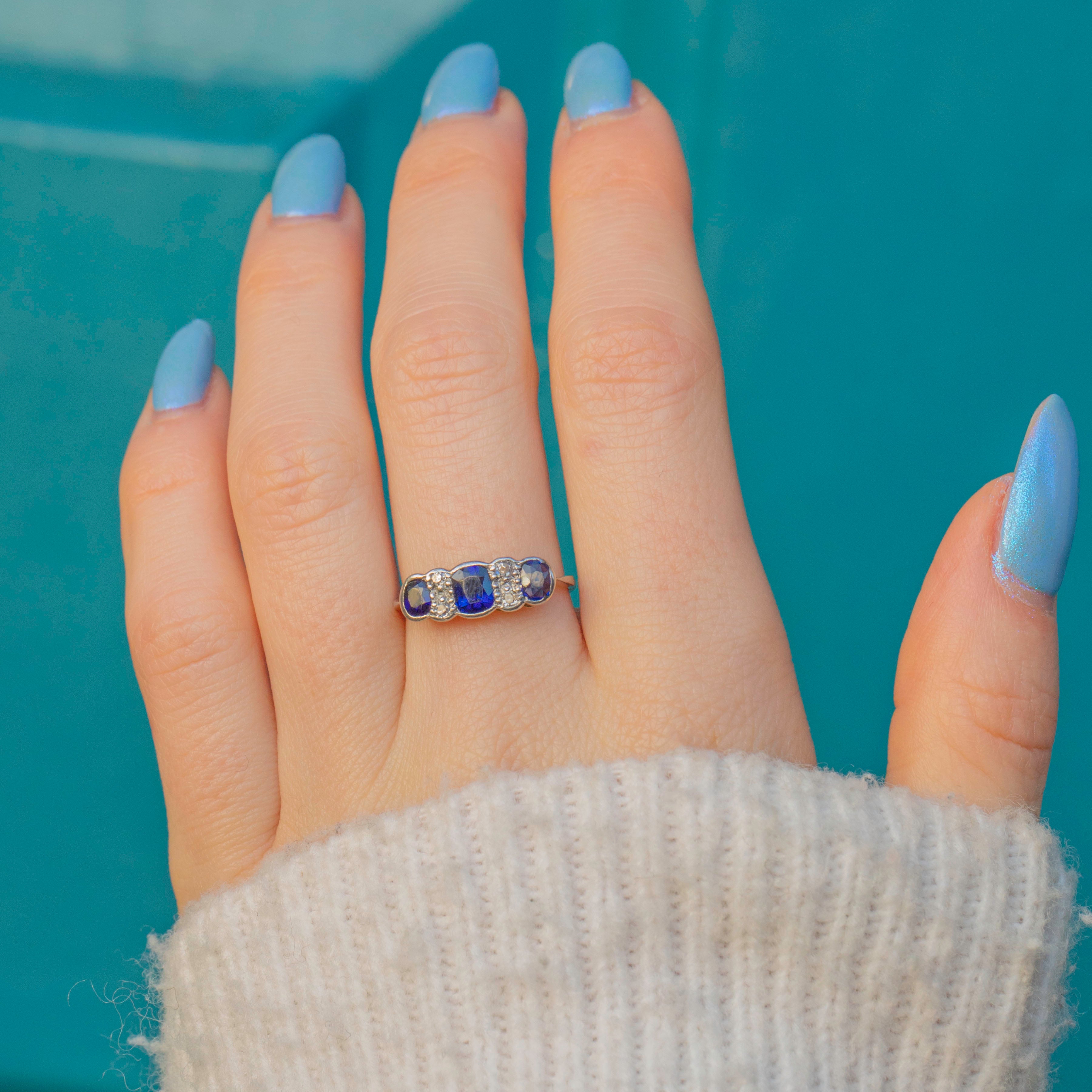 This antique ring features three radiant Sapphires, each a rich navy blue which gleam fantastically as they catch the light. They are interspersed by four scintillating Diamonds, with each gemstone effortlessly complimenting the next.