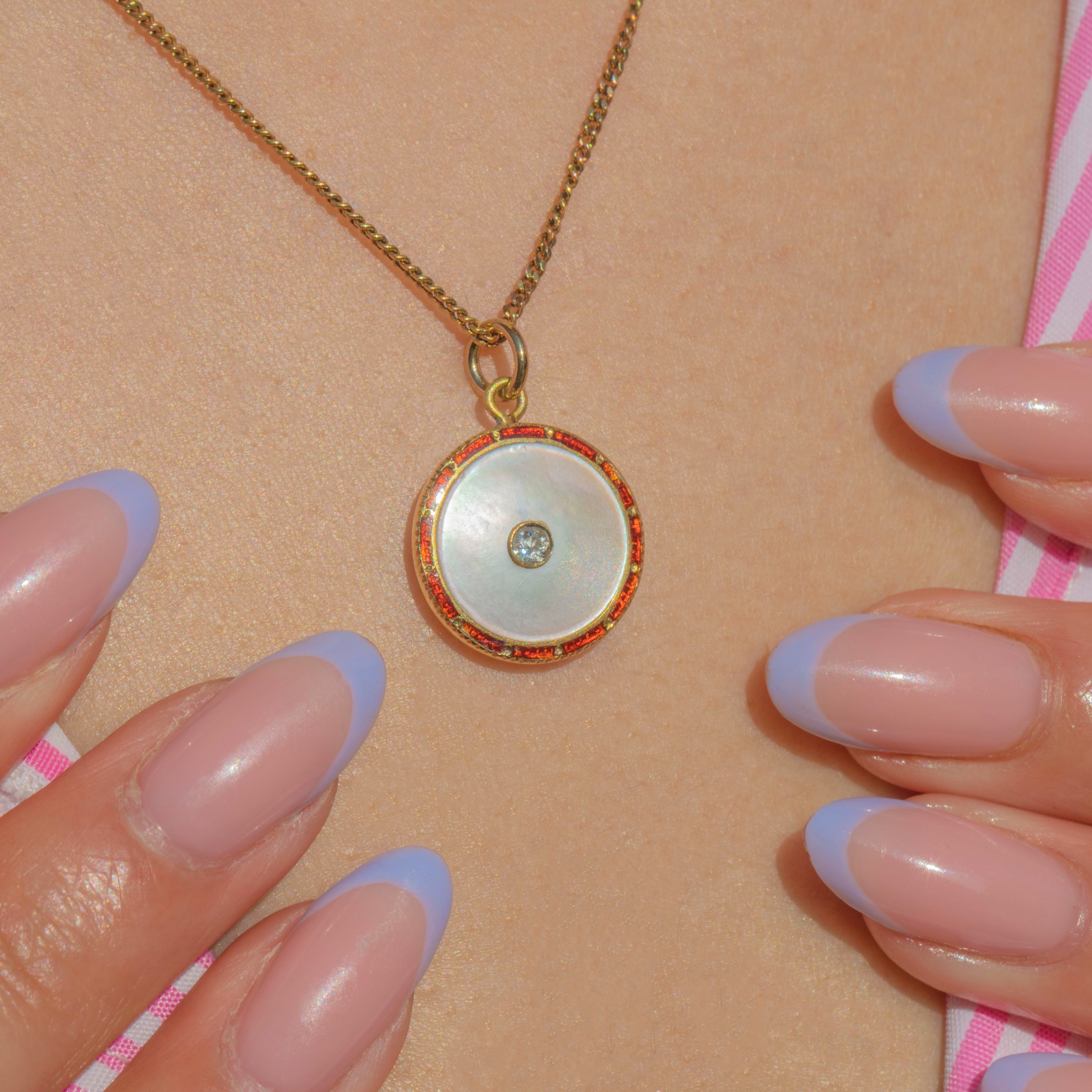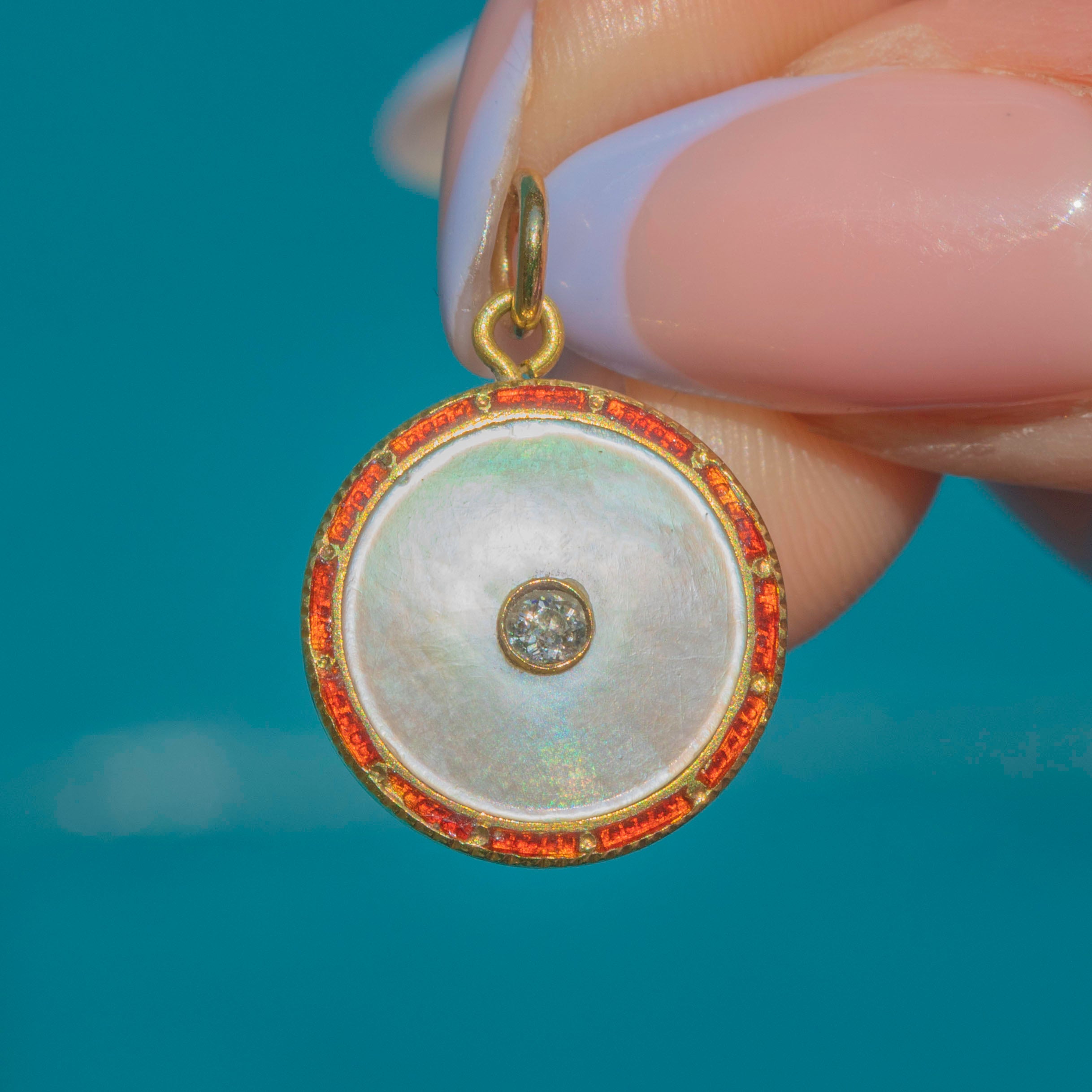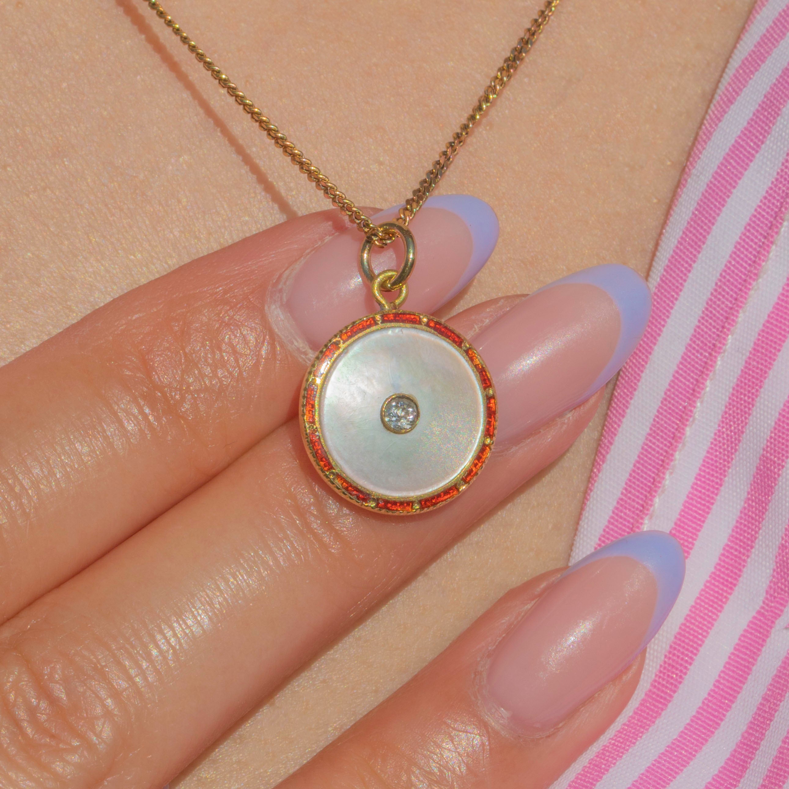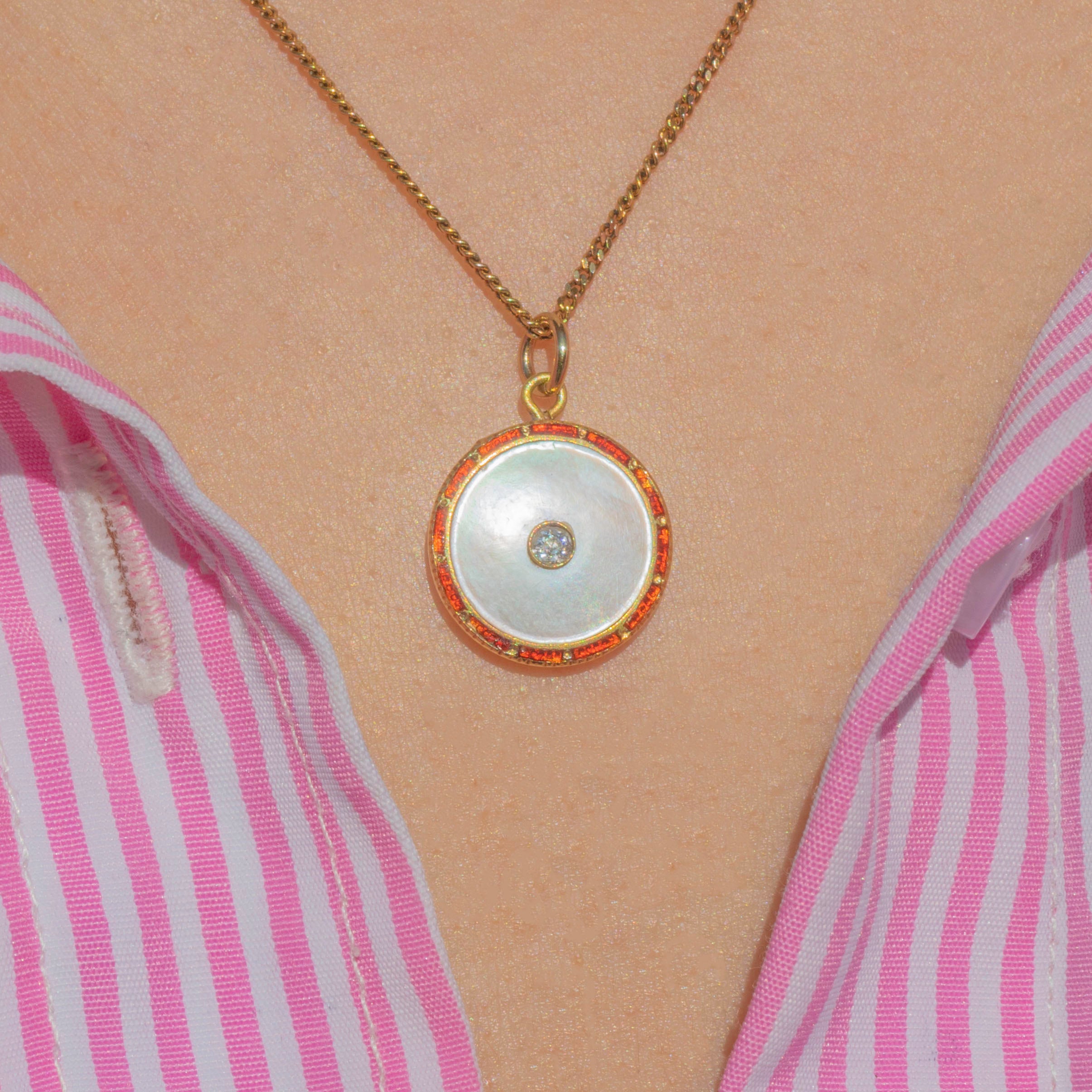 This Art Deco 18ct Gold red Enamel Mother of Pearl Diamond charm will make a vibrant addition to a skinny Gold chain! The iridescent Mother of Pearl centrepiece shimmers with ethereal hues and is haloed by saturated Gold and red Enamel for a luxurious finish.