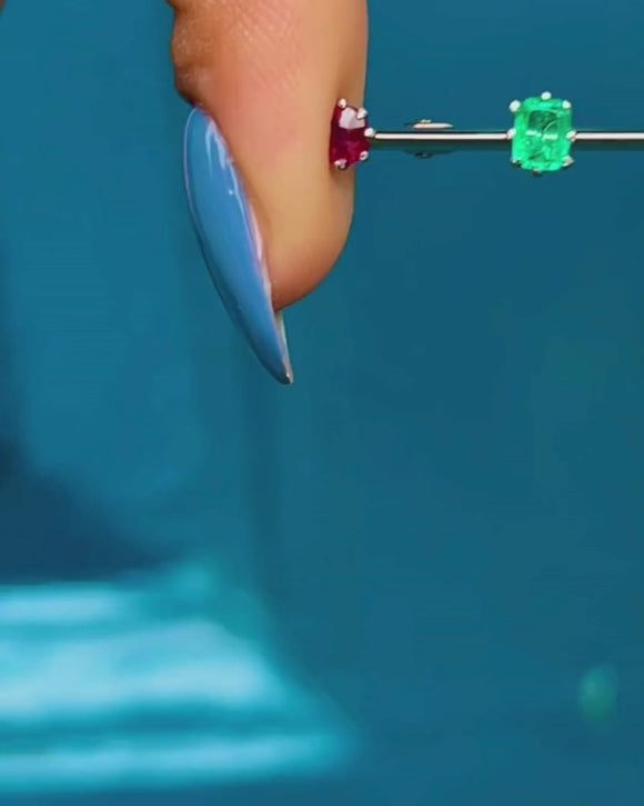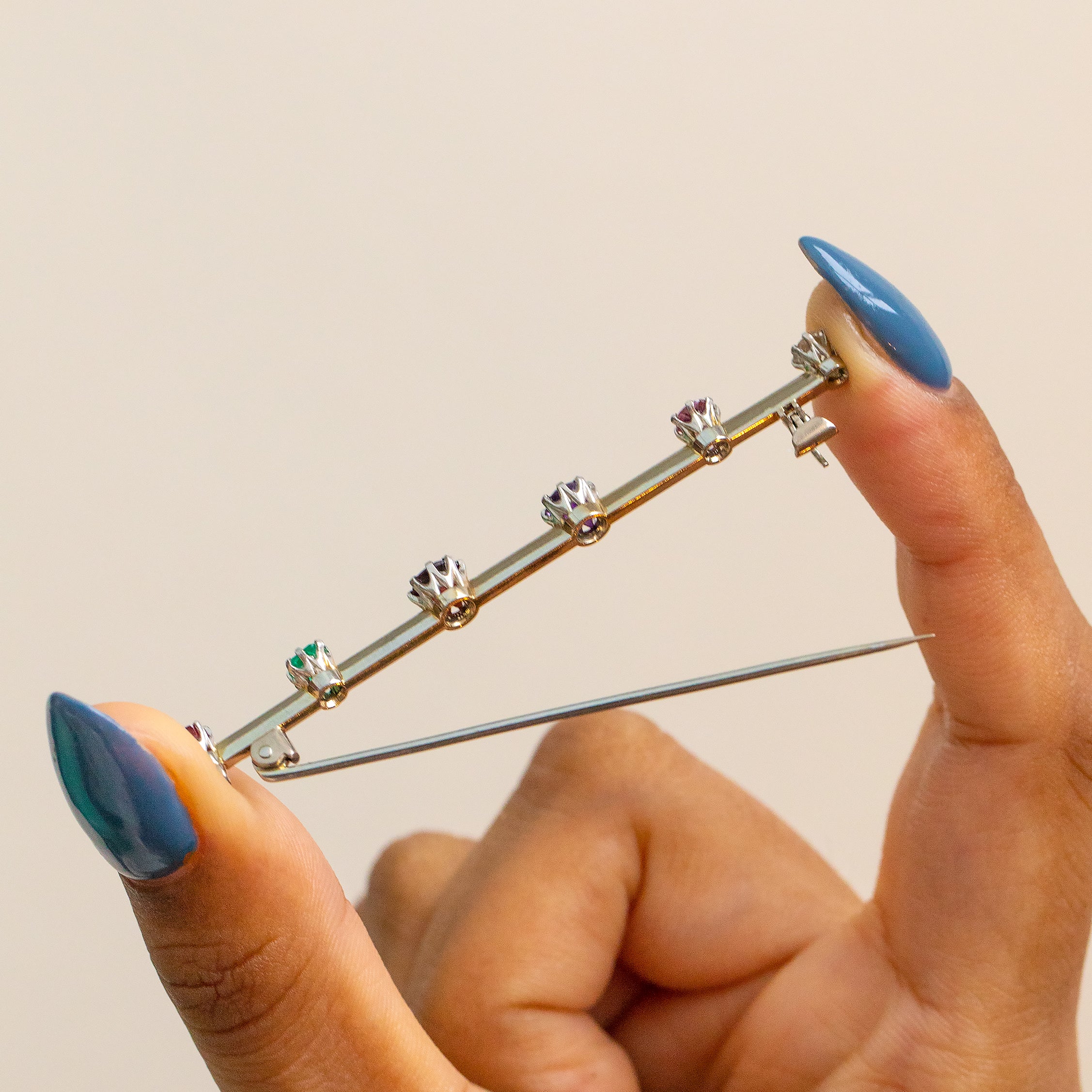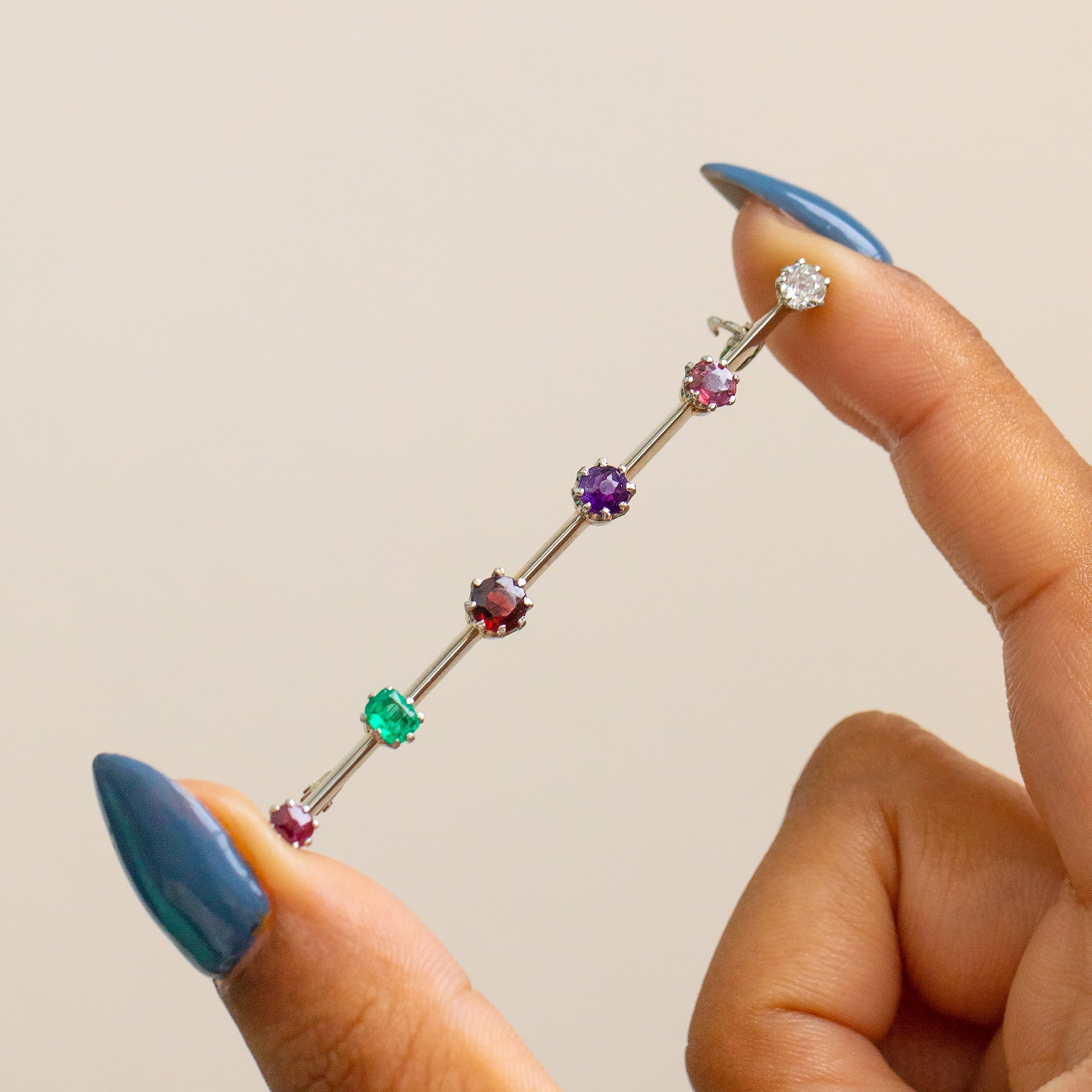 アールデコ 18金 ゴールド リガード アクロスティック バーブローチ、ルビー、エメラルド、ガーネット、アメジスト、ルビー、ダイヤモンド