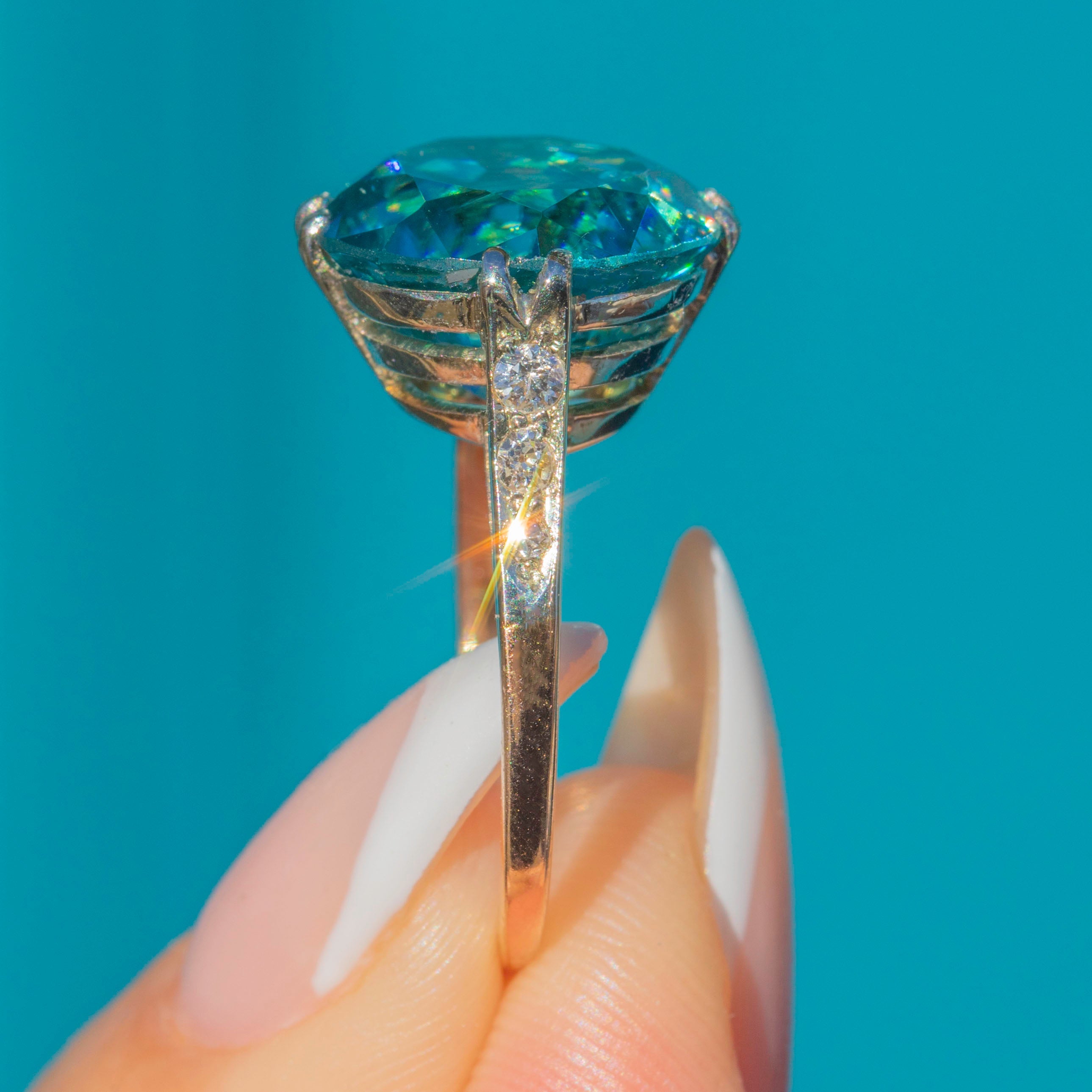 この壮麗なArt Decoリングには、約11カラットの眩いジルコンがセッティングされています。ジルコンの濃密なティールブルーの色彩は、眩い輝きとファイアを放ち、この宝石ならではの素晴らしい分散光を存分にご堪能いただけます。圧倒的なサイズと華やかなきらめきが、唯一無二の存在感を演出します。
